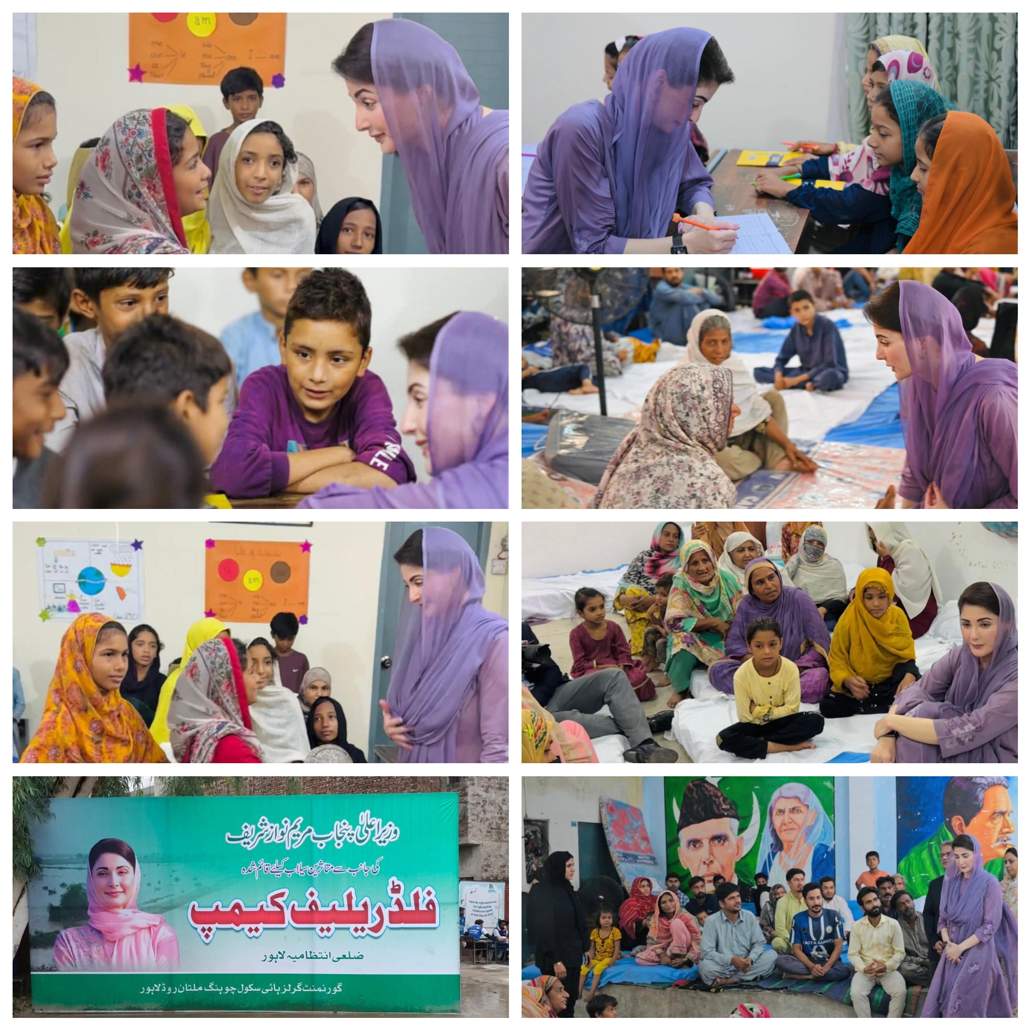 وزیر اعلیٰ پنجاب مریم نواز شریف نے چوہنگ فلڈ ریلیف کیمپ کا دورہ کیا۔ وزیراعلیٰ مریم نواز شریف فلڈ ریلیف کیمپ کے متاثرین میں گھل مل گئیں اوردلاسہ دیا۔ وزیر اعلیٰ مریم نواز شریف نے قائم عارضی کلاس روم کے بچوں سے گپ شپ کی، مختلف سوالات پوچھے اور بچوں سے شفقت کا اظہار کیا۔
