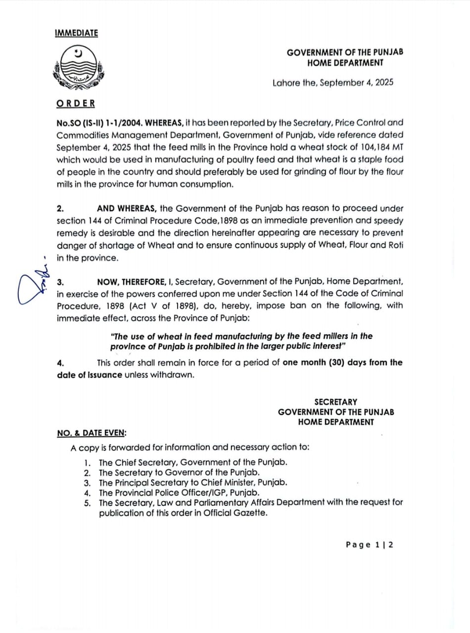 انسانی استعمال کیلئے گندم کی بلا تعطل فراہمی یقینی بنانے کیلئے حکومت پنجاب کا بڑا فیصلہ سامنے آیا ہے۔ حکومت پنجاب نے صوبہ بھر کی فیڈ ملز میں گندم کے استعمال پر فوری پابندی عائد کر دی ہے۔ دفعہ 144 کا نفاذ گندم، آٹے اور روٹی کی بلا تعطل فراہمی یقینی بنانے کیلئے کیا گیا۔ سیکرٹری داخلہ پنجاب کے جاری کردہ حکمنامے کے مطابق گندم صرف فلور ملز میں آٹا بنانے کیلئے استعمال ہو گی۔ ترجمان محکمہ داخلہ پنجاب نے بتایا کہ حکومت پنجاب نے صوبے میں گندم کی ممکنہ قلت کے خدشات کے پیشِ نظر یہ اہم فیصلہ کیا۔ انہوں نے بتایا کہ پنجاب میں فیڈ ملز کے پاس 1 لاکھ 4 ہزار 184 میٹرک ٹن گندم کا ذخیرہ موجود ہے۔ سیکرٹری پرائس کنٹرول اینڈ کموڈٹیز مینجمنٹ کی رپورٹ کے مطابق فیڈ ملز اس بڑی مقدار میں گندم کو مرغیوں کے دانے کیلئے استعمال کرنے والی تھیں۔ ترجمان محکمہ داخلہ پنجاب کے مطابق گندم انسانوں کی بنیادی خوراک ہے جسے مرغیوں کے دانے کی بجائے آٹے کی تیاری میں استعمال ہونا چاہیے۔ محکمہ داخلہ پنجاب نے صوبہ بھر میں فیڈ ملز پر 30 یوم کیلئے گندم کے استعمال پر پابندی عائد کی گئی ہے۔ سیکرٹری داخلہ پنجاب نے ضابطہ فوجداری 1898 کی دفعہ 144(6) کے تحت پابندی عائد کی۔ محکمہ داخلہ پنجاب کے جاری کردہ نوٹیفیکیشن کے مطابق پابندی کا اطلاق جمعہ 3 اکتوبر تک ہوگا۔ عوام الناس کی آگاہی کیلئے حکمنامے کی سرکاری گزٹ، اخبارات و ذرائع ابلاغ کے زریعے بھرپور تشہیر کی ہدایت بھی کی گئی ہے۔