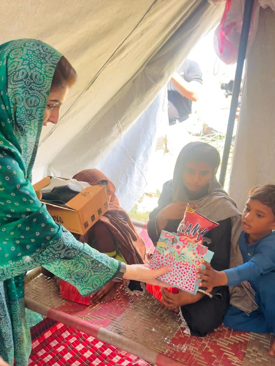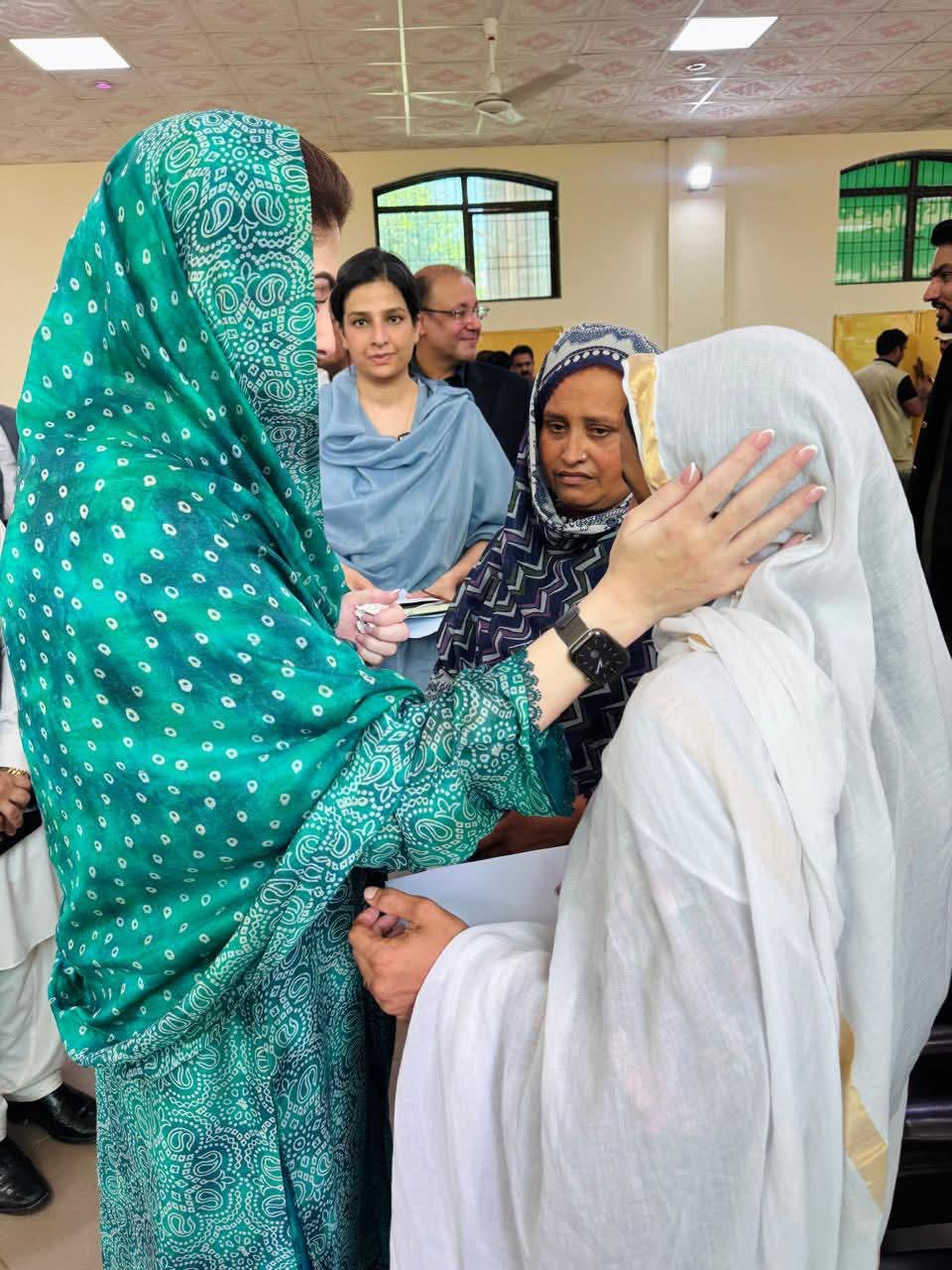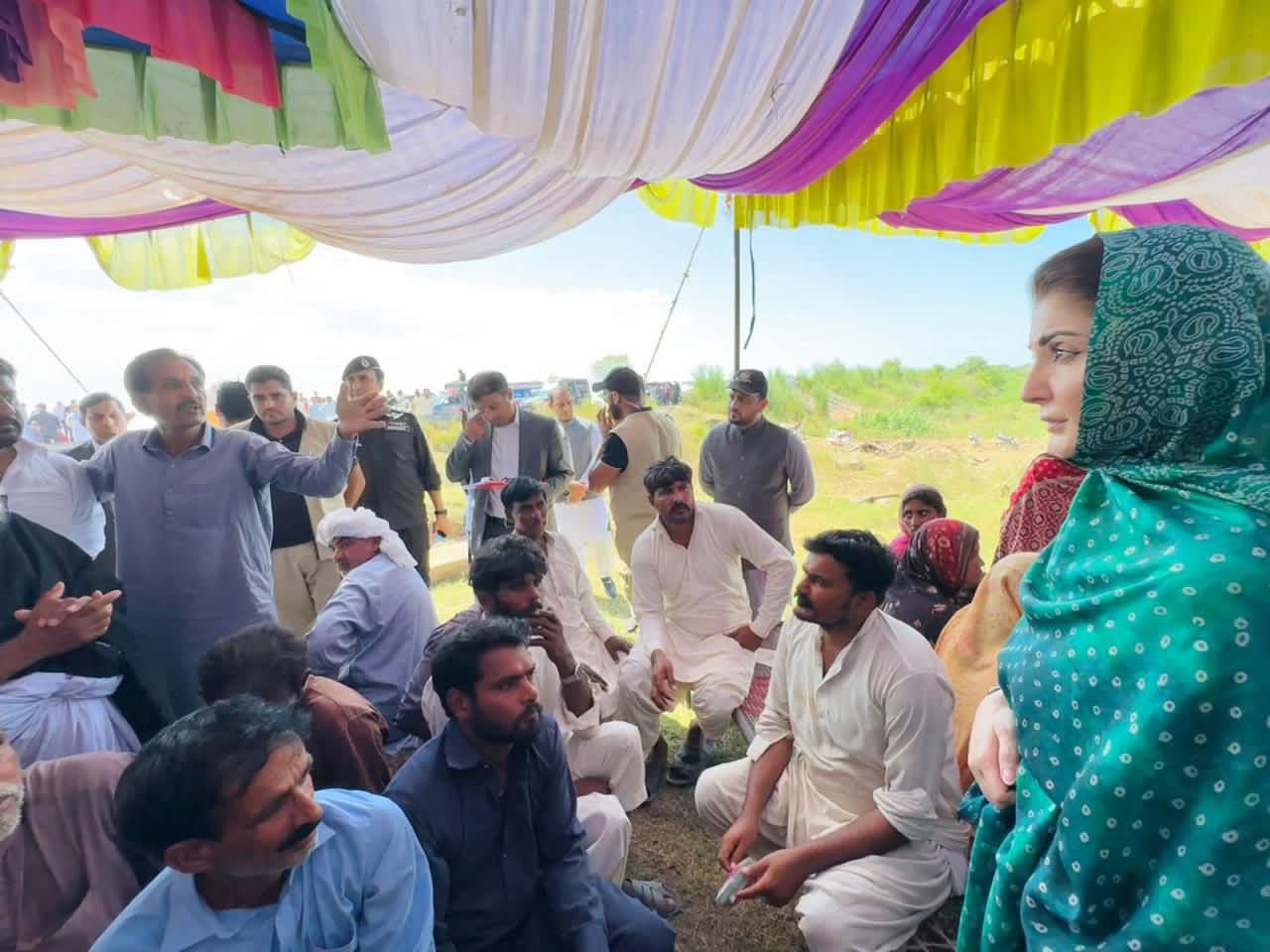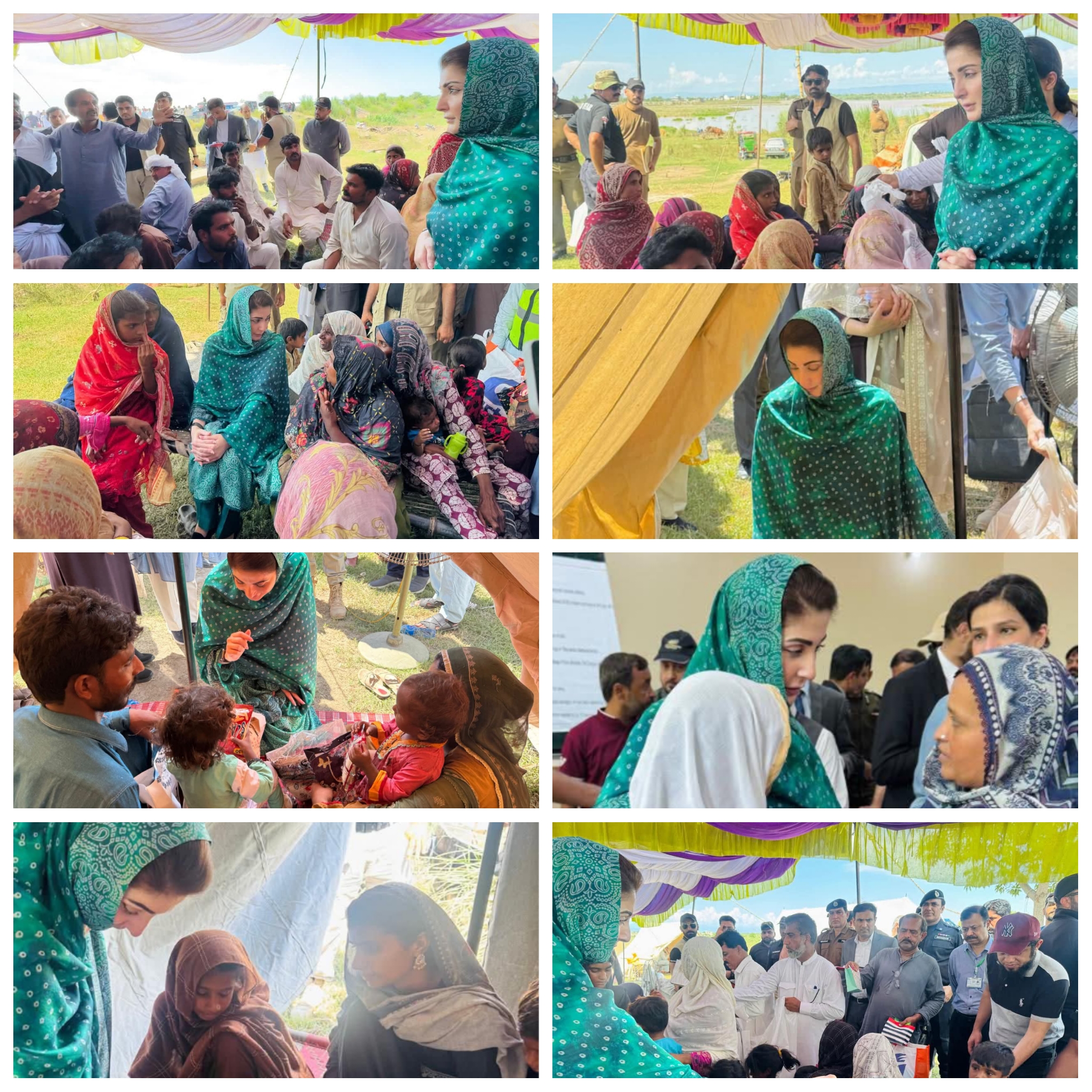 وزیراعلیٰ پنجاب مریم نواز شریف جلالپور جٹاں کے نواحی علاقے شہباز پور فلڈ ریلیف ٹینٹ سٹی پہنچ گئیں۔وزیراعلیٰ مریم نواز شریف نے ٹینٹ سٹی میں سیلاب متاثرہ خاندانوں سے ملاقات کی۔وزیراعلیٰ مریم نواز شریف نے خواتین اور بچوں کو تحائف پیش کیے۔وزیراعلیٰ مریم نواز شریف نے ٹینٹ کے اندر بیٹھ کر ننھی بچی اور اس کی والدہ سے بات چیت کی اور کمسن بچی نے وزیراعلیٰ کو دیکھ کراظہار مسرت کیا۔وزیراعلیٰ مریم نواز شریف نے ننھی بچی کو پیار کیا اور تحائف پیش کیے۔