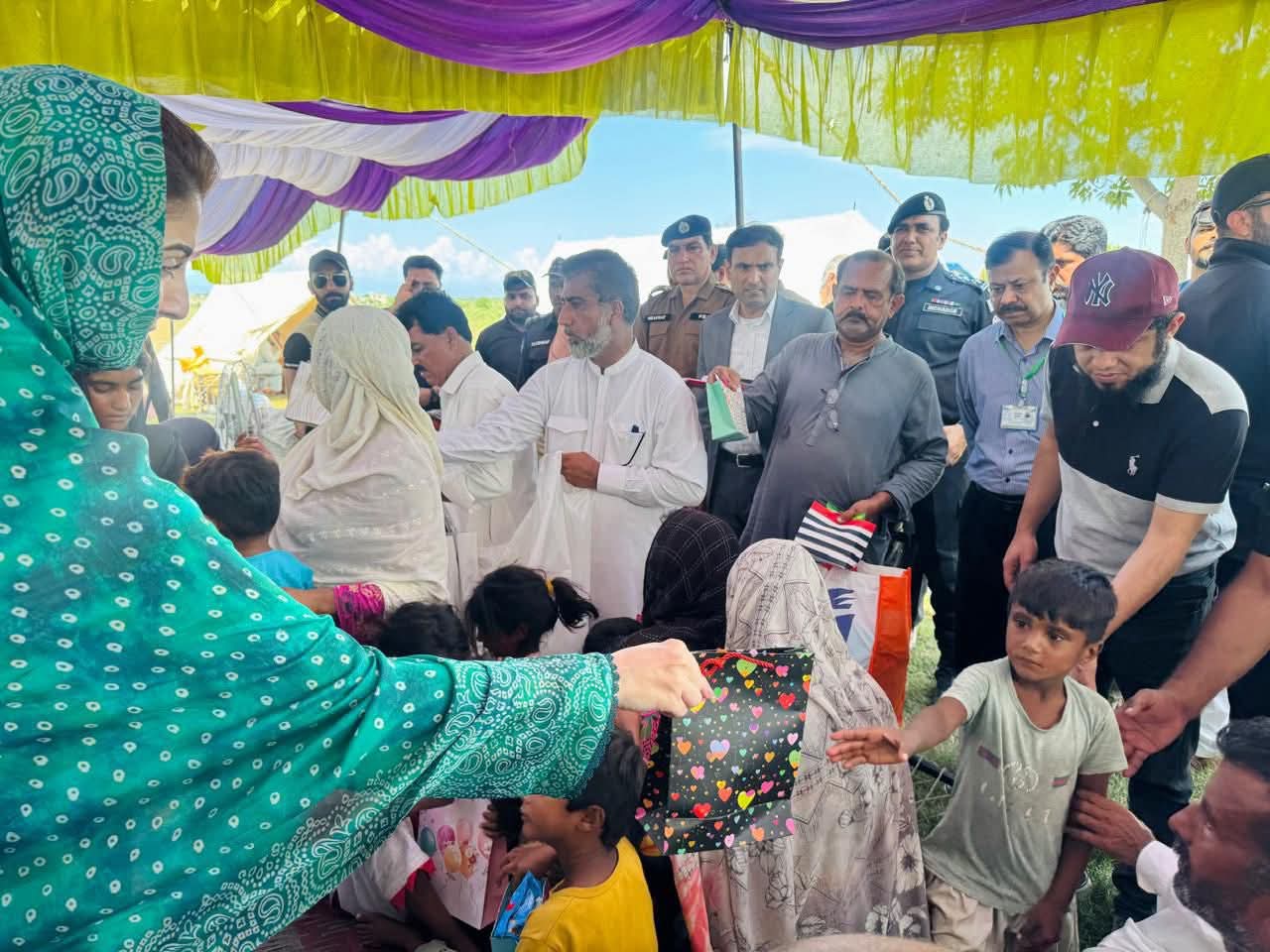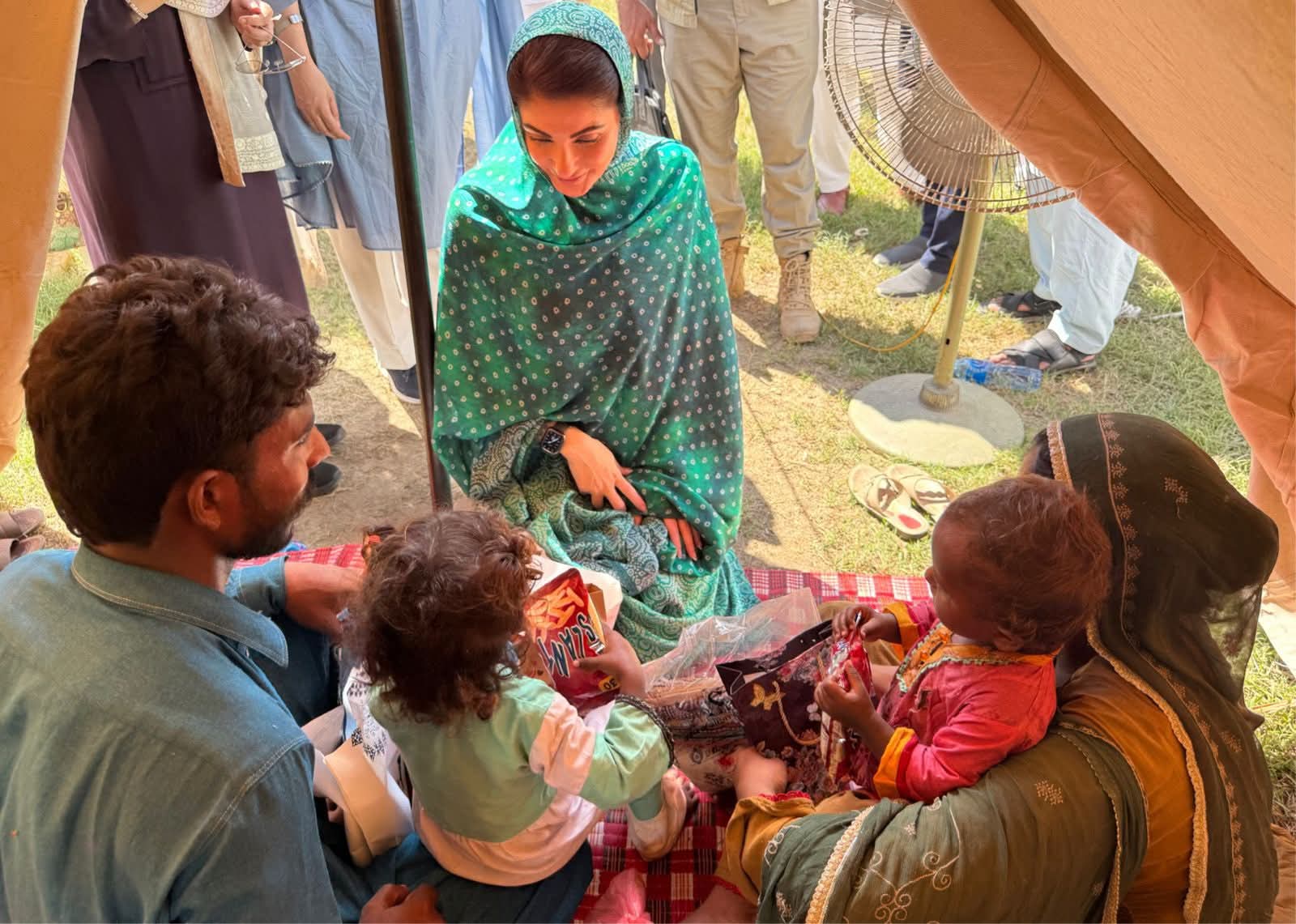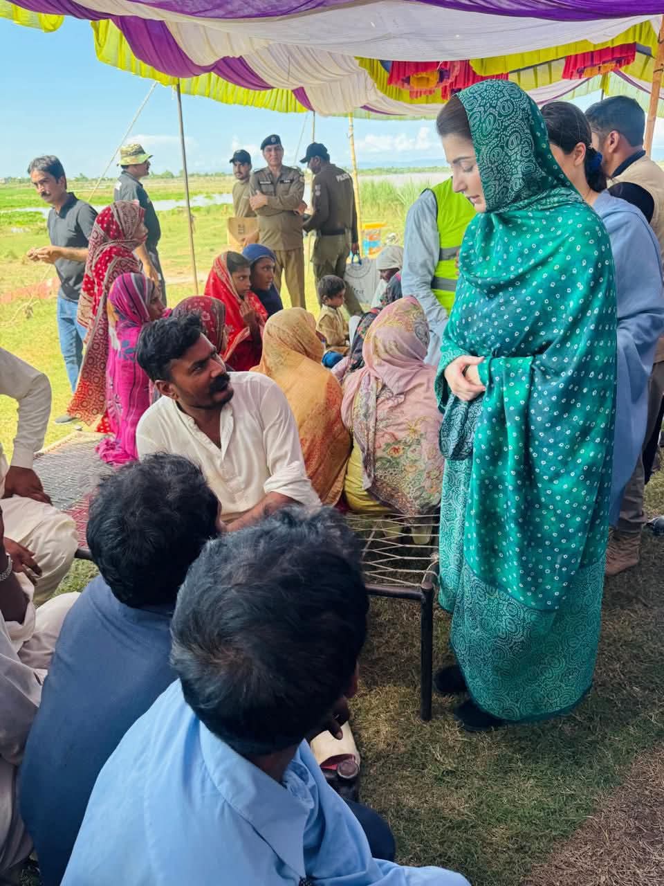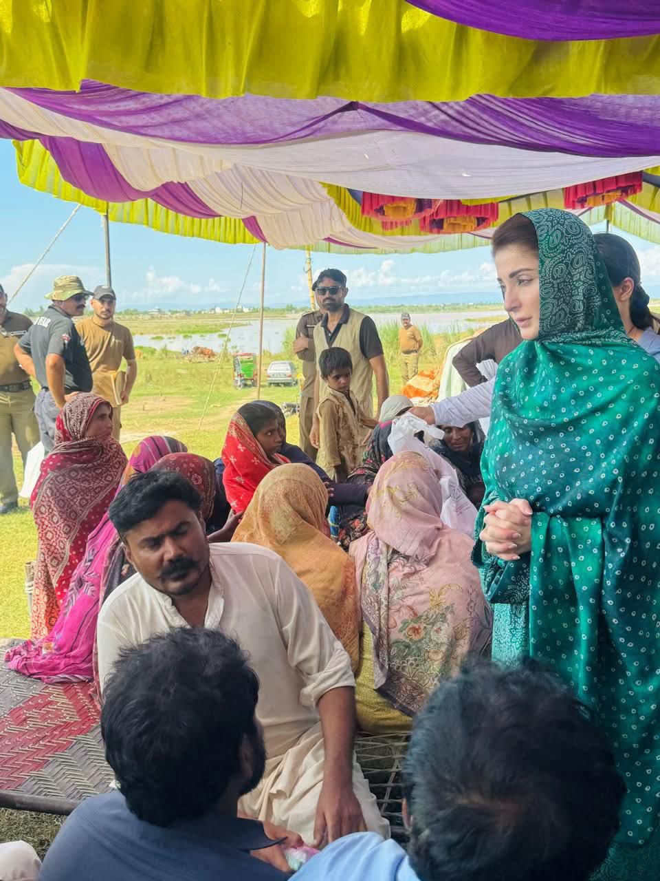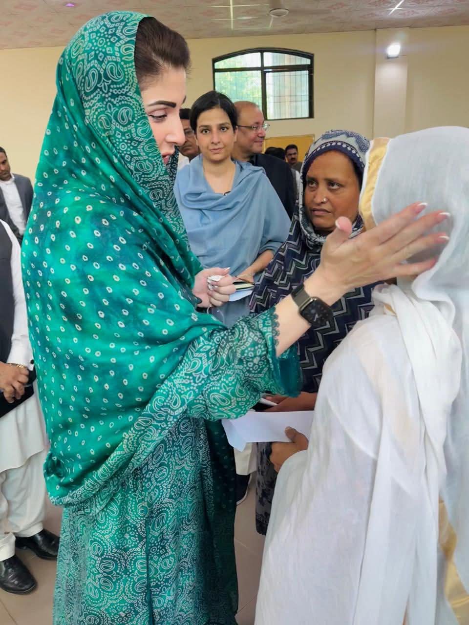 وزیراعلیٰ پنجاب مریم نواز شریف جلالپور جٹاں کے نواحی علاقے شہباز پور فلڈ ریلیف ٹینٹ سٹی پہنچ گئیں۔وزیراعلیٰ مریم نواز شریف نے ٹینٹ سٹی میں سیلاب متاثرہ خاندانوں سے ملاقات کی۔وزیراعلیٰ مریم نواز شریف نے خواتین اور بچوں کو تحائف پیش کیے۔وزیراعلیٰ مریم نواز شریف نے ٹینٹ کے اندر بیٹھ کر ننھی بچی اور اس کی والدہ سے بات چیت کی اور کمسن بچی نے وزیراعلیٰ کو دیکھ کراظہار مسرت کیا۔وزیراعلیٰ مریم نواز شریف نے ننھی بچی کو پیار کیا اور تحائف پیش کیے۔