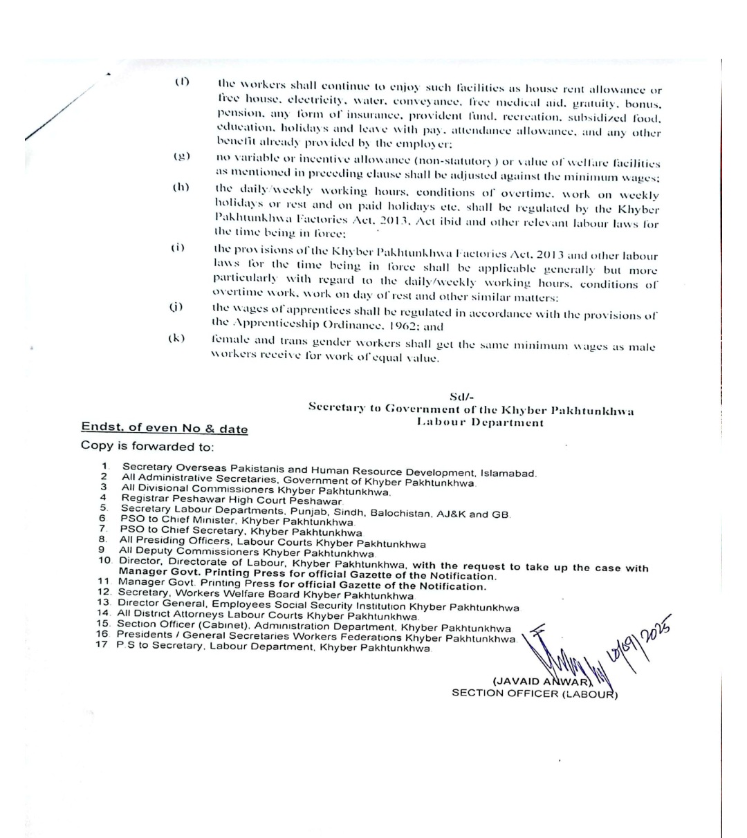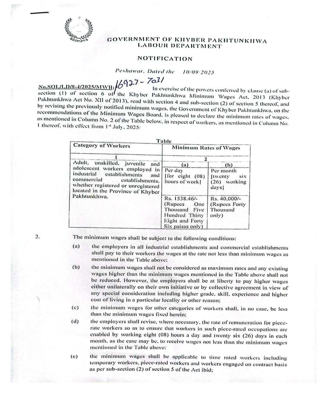 پشاور(بلدیات ٹائمز)حکومت خیبرپختونخوا کے لیبر ویلفئر ڈیپارٹمنٹ نے کم سے کم ویجز ماہانہ چالیس ہزار روپے کا نوٹیفیکیشن جاری کر دیا ہے۔