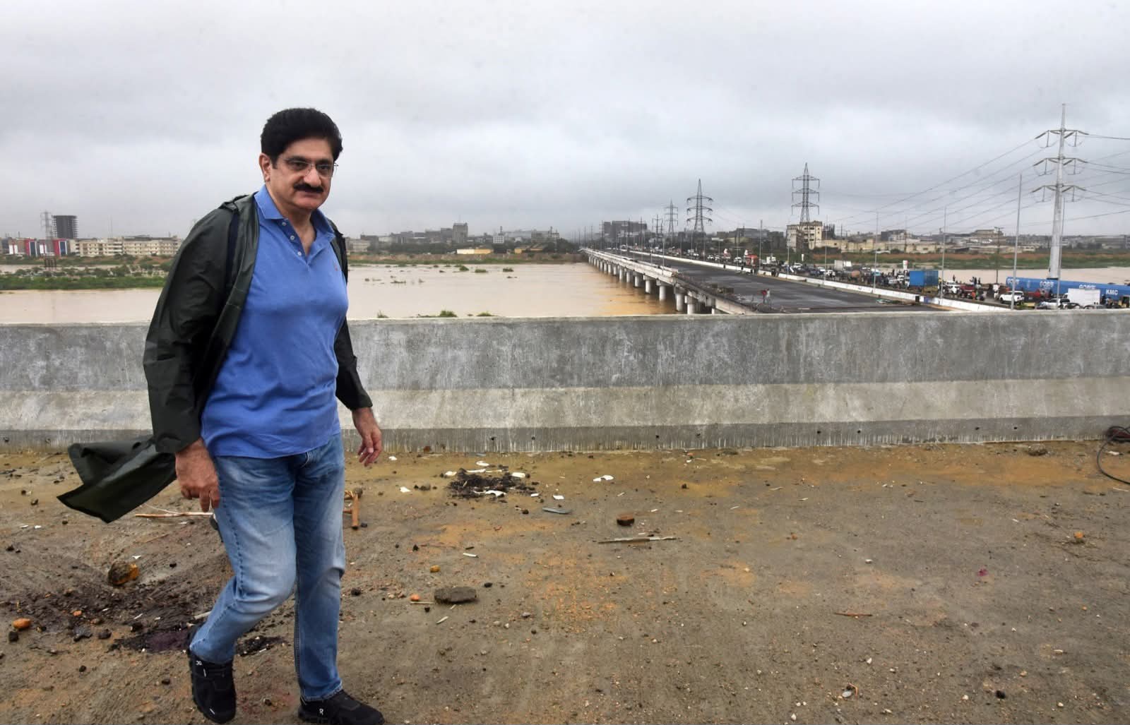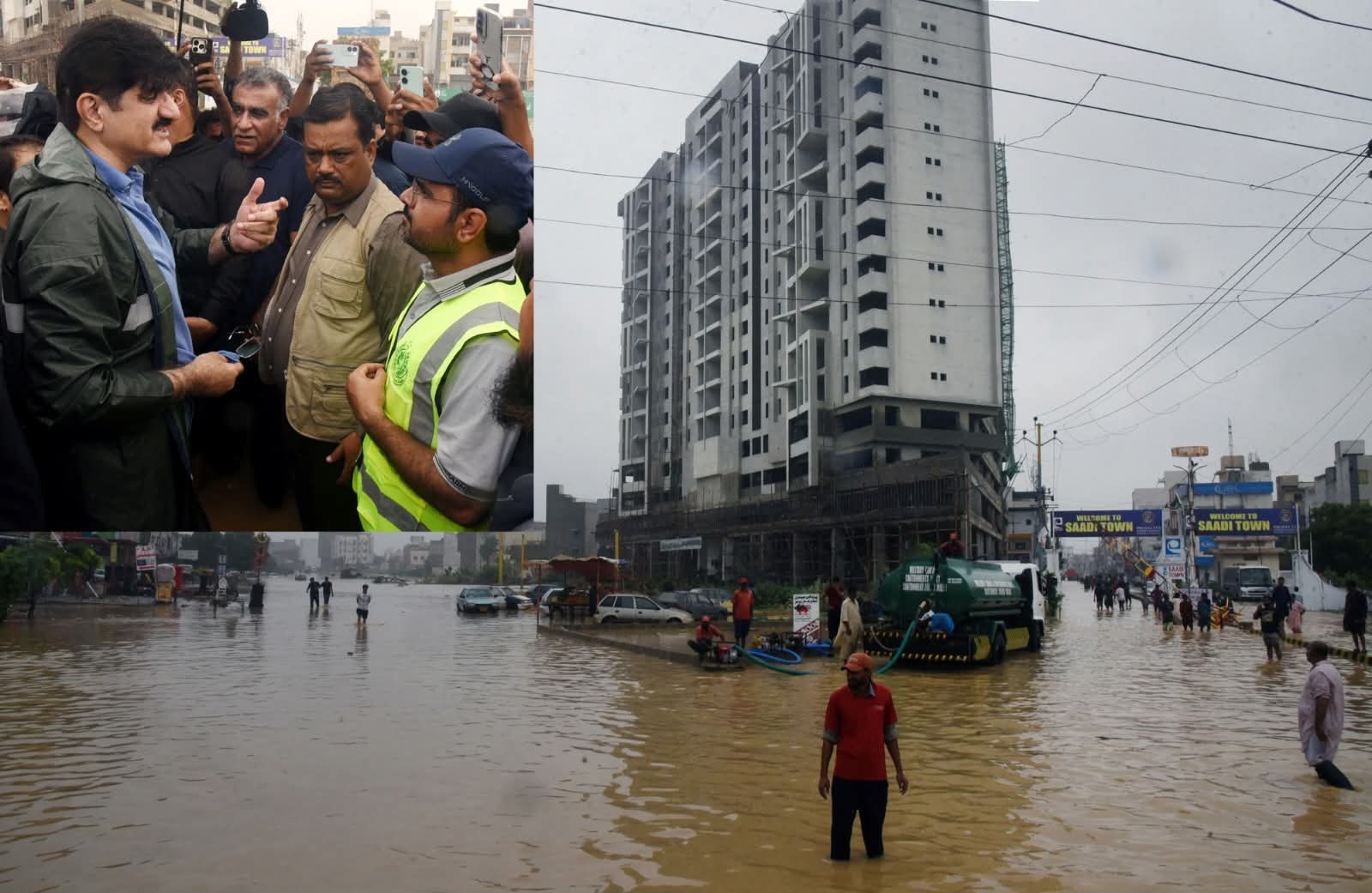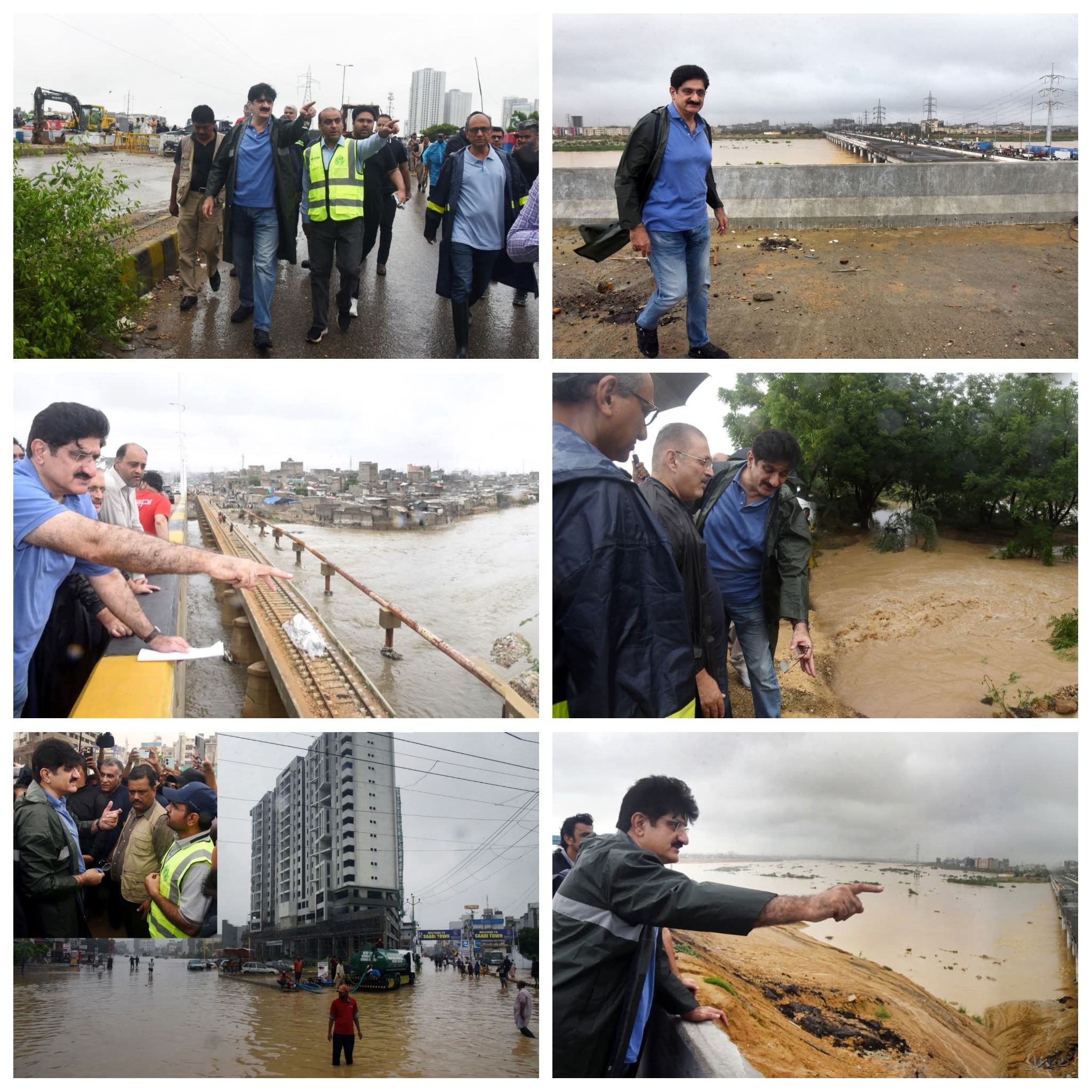 اس سے قبل وزیر اعلیٰ سندھ سید مراد علی شاہ نے بارشوں کے بعد شہر کی صورتحال کا تفصیلی دورہ کیا۔سب سے پہلے وہ قیوم آباد اور کورنگی کاز وے پہنچے جہاں انہوں نے نکاسی آب کے کام کا جائزہ لیا۔ انہوں نے دیکھا کہ قیوم آباد فلائی اوور کے قریب بارش کا پانی جمع ہو گیا ہے جسے مشینری کے ذریعے نکالا جا رہا ہے۔ انہوں نے کہا کہ کورنگی کاز وے ایک دریا کی شکل اختیار کر چکا ہے اور ہدایت دی کہ ملیر ندی کا بہاؤ کم ہونے پر اسے کلیئر کیا جائے۔بعد ازاں وزیر اعلیٰ نے شاہراہِ بھٹو کا دورہ کیا اور ملیر ندی کے اخراجی مقام کا معائنہ کیا جہاں چیف سیکریٹری آصف حیدر شاہ نے رات بھر جاری ریسکیو آپریشنز پر بریفنگ دی۔ وزیر اعلیٰ نے کہا کہ ملیر ندی سے پانی کے اخراج کے بعد کورنگی کاز وے بھی صاف ہو جائے گا۔ انہوں نے ہدایت دی کہ شہریوں کو نشیبی علاقوں میں بدلتی صورتحال سے مسلسل آگاہ رکھا جائے اور زور دیا کہ کے ایم سی، پی ڈی ایم اے، ریسکیو 1122، میونسپل ٹاؤن انتظامیہ، واٹر بورڈ اور پولیس سمیت تمام ادارے مکمل طور پر فعال رہیں۔