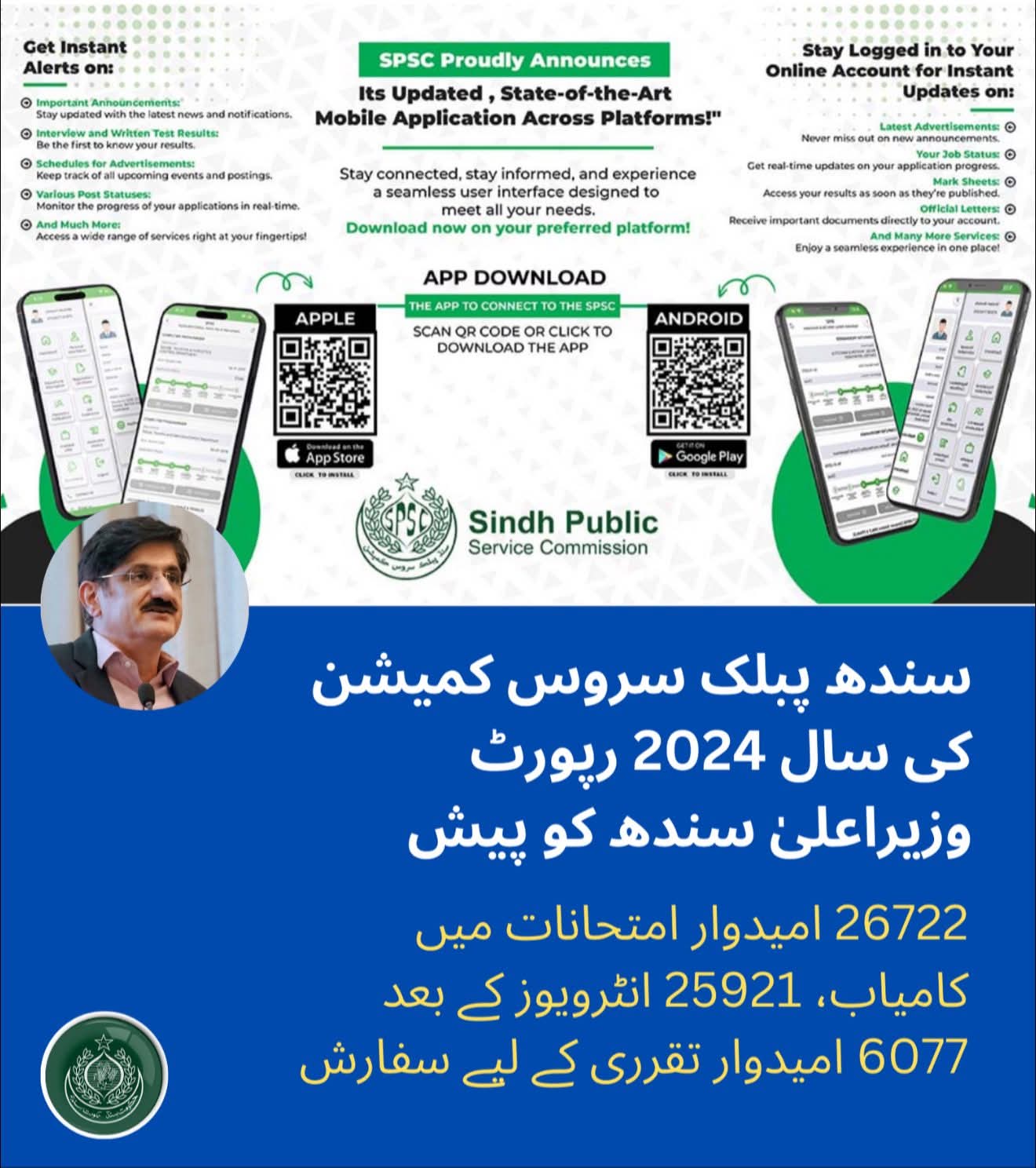 (SPSC) نے مختلف شعبوں میں مجموعی طور پر 109 تحریری امتحانات منعقد کیے جن میں 381960 امیدواروں نے حصہ لیا۔ ان میں سے 26722 امیدوار اگلے مراحل کے لیے اہل قرار پائے۔ تحریری امتحانات کے بعد SPSC نے 25921 انٹرویوز کیے جن کے نتیجے میں 6077 امیدوار مختلف سرکاری محکموں میں تقرری کے لیے سفارش کیے گئے۔ یہ اعداد و شمار چیئرمین SPSC کی جانب سے وزیراعلیٰ سندھ کو پیش کی گئی سالانہ رپورٹ برائے 2024 میں سامنے آئے۔ رپورٹ کے مطابق کمیشن نے سال بھر میں بھرتی اور انتخابی عمل کو جدید خطوط پر استوار کرنے میں نمایاں پیش رفت کی۔سال 2024 کا ایک بڑا سنگ میل حیدرآباد ہیڈ آفس میں جدید کمپیوٹر بیسڈ ٹیسٹنگ (CBT) لیب کا افتتاح تھا۔ یہ سہولت بھرتی کے عمل کو بین الاقوامی معیار سے ہم آہنگ کرنے کے لیے قائم کی گئی ہے جس میں ریئل ٹائم ٹیسٹ ڈلیوری، فوری نتائج کی فراہمی، سوالناموں کی رینڈم جنریشن اور جدید مانیٹرنگ سسٹم شامل ہیں۔ یہ لیب ایک محفوظ اور کنٹرول ماحول فراہم کرتی ہے جو غلطیوں اور بدعنوانی کے امکانات کو کم سے کم کرتی ہے۔ SPSC حکام کا ماننا ہے کہ یہ ڈیجیٹل تبدیلی نہ صرف عمل کو تیز اور مؤثر بناتی ہے بلکہ شفافیت اور مساوی مواقع کو یقینی بناتی ہے۔کمیشن، سندھ پبلک سروس کمیشن ایکٹ 2022 کے تحت کام کر رہا ہے جو صوبائی اسمبلی کی منظور کردہ ایک قانون سازی ہے جس کا مقصد بھرتی کے عمل میں شفافیت، جوابدہی اور میرٹ کو فروغ دینا ہے۔ اس ایکٹ کے تحت کمیشن نے مختلف سرکاری محکموں کی بھرتی کی ضروریات پوری کرنے کے لیے مختلف اشتہارات اور سلیکشن ایکسرسائزز کیں۔سال 2024 میں ہوم ڈپارٹمنٹ نے 1821 اسسٹنٹ سب انسپکٹرز کی اسامیاں نکالیں جن کے لیے 32893 درخواستیں موصول ہوئیں۔ ہیلتھ ڈپارٹمنٹ نے 1414 اسامیاں مشتہر کیں، جن میں تقریباً 1300 میڈیکل اور ویمن میڈیکل آفیسرز کی آسامیاں شامل تھیں اور 17236 درخواستیں موصول ہوئیں۔ اسی طرح ایجوکیشن ڈپارٹمنٹ نے 753 اسامیاں مشتہر کیں، جن کے لیے 60323 امیدواروں نے درخواست دی۔ہیلتھ ڈپارٹمنٹ میں لیکچررز (BPS-17) کی 1622 اسامیوں کے لیے [number_2] درخواستیں موصول ہوئیں جن میں سے 6488 امیدوار تحریری امتحانات میں کامیاب ہوئے، 6293 انٹرویوز تک پہنچے اور 1519 امیدوار تقرری کے لیے سفارش ہوئے۔ اسی محکمے میں اسٹاف نرس (BPS-16) کی 324 اسامیوں پر 315 امیدواروں نے درخواست دی، جن میں سے 272 انٹرویوز تک پہنچے اور 260 امیدوار منتخب ہوئے۔ سینئر نرس (BPS-17) کی 154 اسامیوں کے لیے 4573 درخواستیں آئیں، 528 نے تحریری امتحان پاس کیا، 454 نے انٹرویوز دیے اور 150 امیدوار منتخب ہوئے۔میڈیکل/ویمن میڈیکل آفیسر (کووڈ سوٹ ایبلٹی) کی 822 اسامیوں کے لیے 808 درخواستیں آئیں، 598 امیدواروں نے انٹرویوز دیے اور 560 منتخب ہوئے۔ ویمن میڈیکل آفیسر کی 350 اسامیوں کے لیے 7713 درخواستیں موصول ہوئیں، 1159 نے امتحان پاس کیا، 1061 انٹرویوز تک پہنچے اور 344 امیدوار تقرری کے لیے سفارش ہوئے۔مقامی حکومت کے محکمے میں ٹاؤن آفیسر (BPS-16) کی 698 اسامیوں کے لیے 88543 درخواستیں آئیں، اور آخرکار 640 امیدوار منتخب ہوئے۔ اکاؤنٹس آفیسر (BPS-17) کی 101 اسامیوں کے لیے 10913 درخواستیں موصول ہوئیں اور 101 امیدوار منتخب کیے گئے۔ اسی طرح اسسٹنٹ ایگزیکٹیو انجینئر (BPS-17) کی 240 اسامیوں کے لیے 5913 درخواستیں آئیں اور 160 امیدوار سفارش ہوئے۔ایجوکیشن ڈپارٹمنٹ میں سبجیکٹ اسپیشلسٹ (BPS-17) کی 280 اسامیوں کے لیے 14513 درخواستیں آئیں اور 465 امیدوار منتخب ہوئے۔ ہیڈ ماسٹرز اور ہیڈ مسٹریسز کی 364 اسامیوں کے لیے 7634 درخواستیں آئیں اور 200 امیدوار تقرری کے لیے سفارش ہوئے۔ لائیوسٹاک ڈپارٹمنٹ میں ویٹرنری/ریسرچ آفیسر (BPS-17) کی 242 اسامیوں کے لیے 7489 درخواستیں موصول ہوئیں اور 200 امیدوار منتخب ہوئے۔جولائی 2022 سے 2025 تک SPSC نے 18560 امیدواروں کو مختلف سرکاری محکموں میں تقرری کے لیے سفارش کیا۔ ان میں 2022 میں 1282، 2023 میں 5572، 2024 میں 6077 اور 2025 کے لیے 5629 امیدواروں کی سفارش کی گئی۔ڈیجیٹل جدت اور میرٹ پر مبنی عمل کے ذریعے SPSC سندھ کے ہونہار اور پرعزم نوجوانوں کے لیے شفافیت، اعتبار اور مساوی مواقع کے اپنے عزم کو مزید مستحکم کر رہا ہے۔