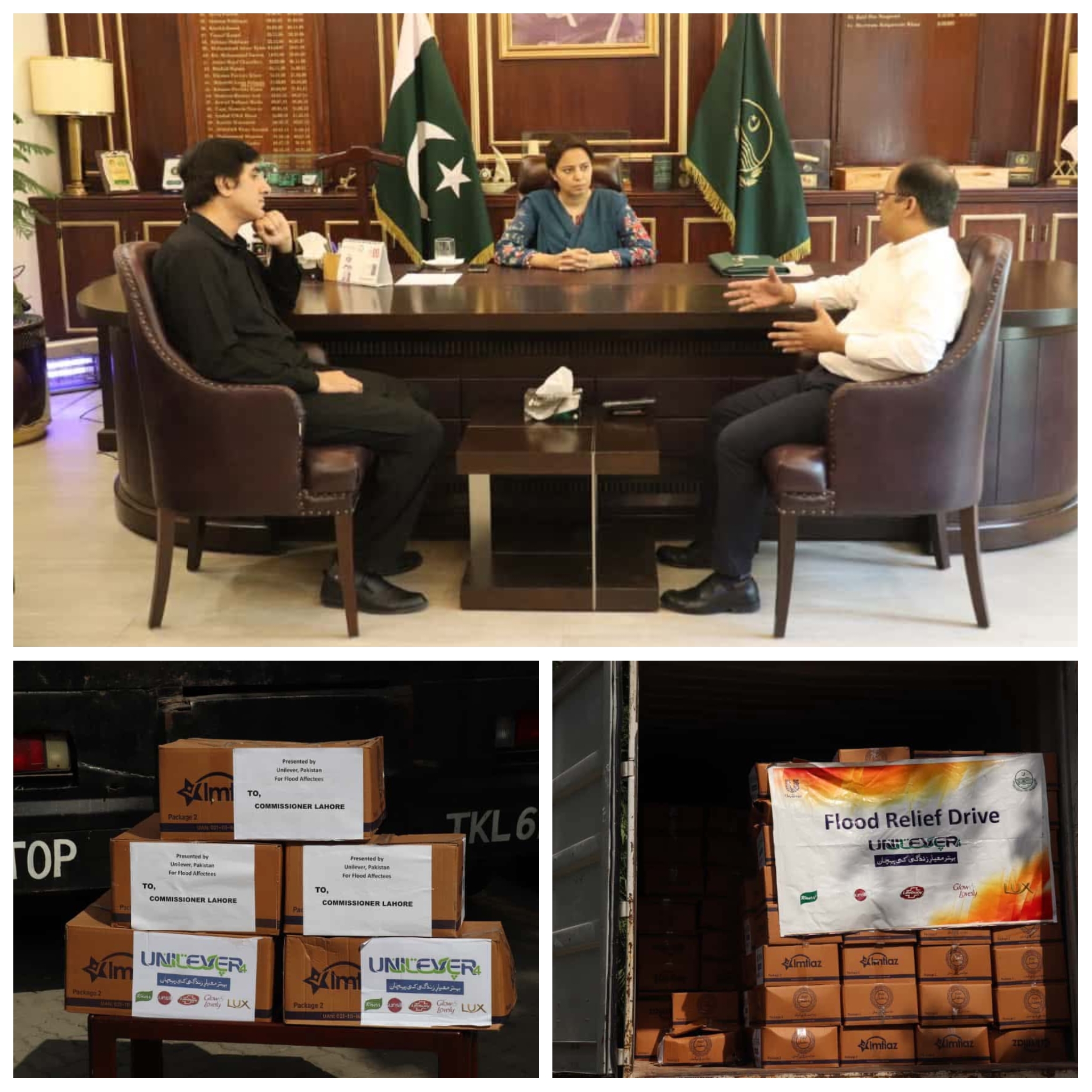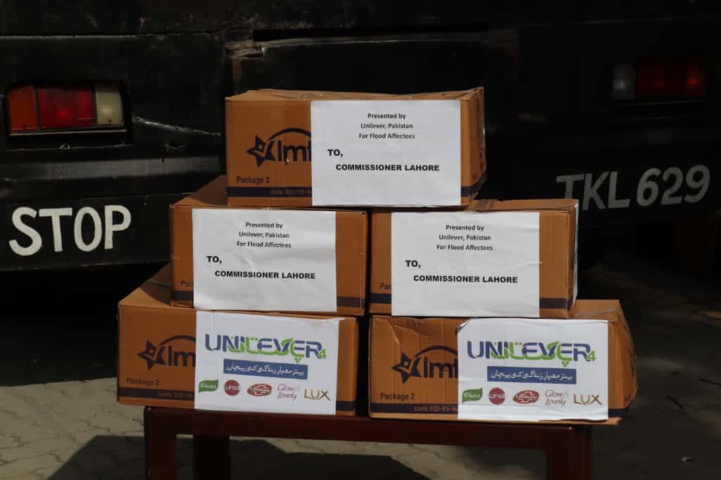 کمشنر لاہور کر امدادی سرگرمیوں پر بریفنگ دی۔ انہوں نے کہا کہ ہر راشن کارٹن میں آٹا، چینی، چاول، دال چنا، چائے، دودھ، خوردنی تیل، صابن، مچھر مار سپرے ودیگر اشیاء شامل ہیں۔ کمشنر لاہور مریم خان نے یونی لیور پاکستان کی امدادی خدمات کو سراہا۔ کمشنر لاہور نے فلڈ ریلیف متاثرین امدادی سامان ضلعی انتظامیہ لاہور کی ڈسپوزل پر بھجوا دیا، انہوں نے کہا کہ ضلعی انتظامیہ لاہور تھیم پارک سوسائٹی متاثرین میں راشن کارٹن تقسیم کرے گی۔