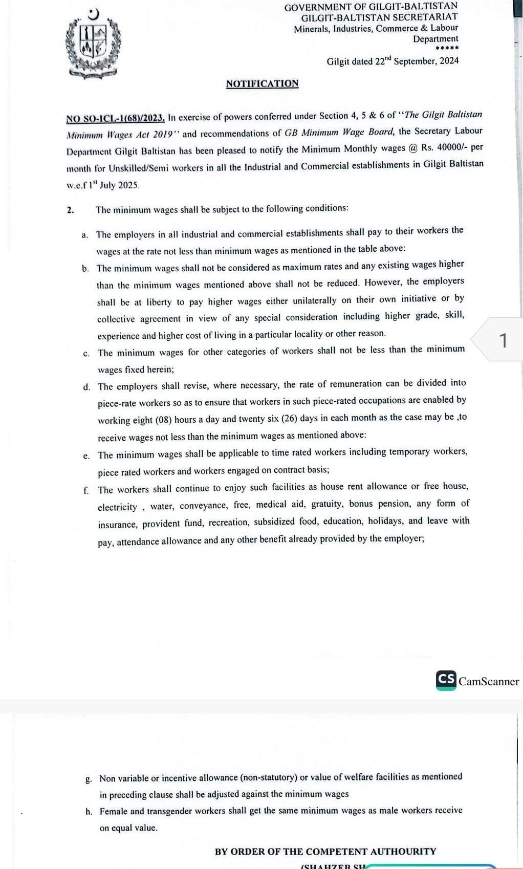 محکمہ انڈسٹریز، کامرس و لیبر گلگت بلتستان نے صوبے بھر کے تمام صنعتی و تجارتی اداروں میں کام کرنے والے غیر ہنر مند اور نیم ہنر مند کارکنوں کے لیے کم از کم ماہانہ اجرت 40,000 روپے مقرر کر دی ہے۔ یہ فیصلہ یکم جولائی 2025ء سے نافذ العمل ہوگا۔یہ اقدام "گلگت بلتستان کم از کم اجرت ایکٹ 2019” کے تحت گلگت بلتستان کم از کم اجرت بورڈ کی سفارشات پر عملدرآمد کرتے ہوئے کیا گیا ہے، جس کا بنیادی مقصد صوبے کے محنت کش مزدور طبقے کے معیار زندگی میں واضح بہتری لانا اور ان کے معاشی تحفظ کو یقینی بنانا ہے۔نئی اجرت کی اہم تفصیلات و شرائط درج ذیل ہیں: نئی کم از کم اجرت کا اطلاق صوبے کے تمام سرکاری و نجی صنعتی اور تجارتی اداروں پر یکساں ہوگا۔ واضح رہے کہ یہ کم از کم اجرت ایک بنیادی شرح ہے، زیادہ سے زیادہ اجرت نہیں۔ موجودہ اجرتیں اگر اس نئی شرح سے زیادہ ہیں تو انہیں کم کرنا ممنوع ہوگا۔اداروں کو یہ پوری آزادی ہوگی کہ وہ ملازمین کے ہنر، تجربے، کارکردگی یا کسی خاص علاقے میں روزمرہ کی اشیاء کی بلند قیمتوں کے پیش نظر اس بنیادی شرح سے زیادہ اجرت دے سکیں۔
