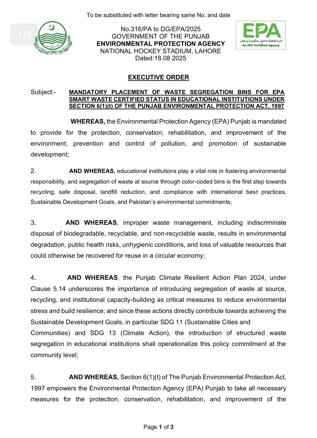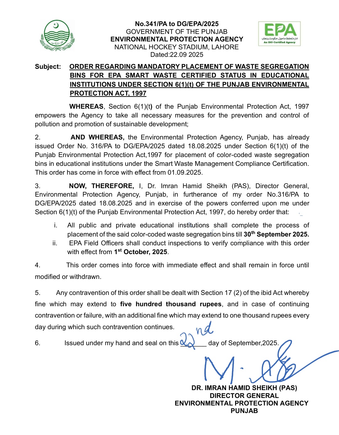 ادارہ تحفظ ماحول پنجاب نے تعلیمی اداروں میں ماحولیاتی اصلاحات کے لیے بڑا قدم اٹھا لیا – ڈی جی ماحولیات پنجاب عمران حامد شیخ نے حکم نامہ جاری کر دیا ہے۔ترجمان ادارہ تحفظ ماحول پنجاب ساجد بشیر کے مطابق تعلیمی اداروں میں کچرا تلف کرنے کے پرانے طریقوں پر پابندی، رنگوں کے حساب سے کچرا الگ کرنے کا نیا نظام لازم قرار دے دیا گیا ہے۔ سکولز، کالجز اور نجی اداروں کو ہدایت: 30 ستمبر 2025 تک پانچ رنگوں کے ڈبے نصب کریں ورنہ کارروائی ہوگی-