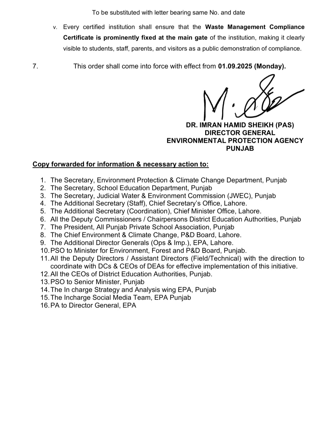 یکم اکتوبر سے ای پی اے کے فیلڈ آفیسران موقع پر جا کر سکولز کا معائنہ اور کوڑے کے ڈبوں کی موجودگی چیک کریں گے- کوڑا کرکٹ الگ رکھنے کے لیے ڈبوں کی تقسیم: پیلا ڈبہ کاغذ کے لیے، سبز ڈبہ شیشے کے لیے، خاکی ڈبہ نامیاتی کچرے کے لیے، سرخ ڈبہ دھات کے لیے، نارنجی ڈبہ پلاسٹک کے لیے لازمی قرار دیا گیا ہے۔کچرے کی باقاعدہ اٹھان کے لیے اداروں کو پنجاب ویسٹ مینجمنٹ ہیلپ لائن 1139 سے مدد لینے کی سہولت فراہم کی گئی ہے۔ماحولیاتی شعور اجاگر کرنے کے لیے طلبہ اور اساتذہ کو فضلہ الگ کرنے کی آگاہی دینا بھی لازمی حصہ قرار دیا گیا ہے۔ترجمان ساجد بشیر کے مطابق صرف وہی تعلیمی ادارے "اسمارٹ ویسٹ سرٹیفائیڈ” کہلائیں گے جو مکمل ضوابط پر عملدرآمد کریں گے۔سرٹیفکیٹ حاصل کرنے والے ادارے کو مرکزی دروازے پر اسمارٹ ویسٹ سرٹیفکیٹ نمایاں طور پر آویزاں کرنا ہوگا تاکہ والدین اور طلبہ دیکھ سکیں-ماہرین کے مطابق یہ اقدام ماحولیاتی آلودگی کم کرنے، کچرا ری سائیکلنگ بڑھانے اور قیمتی وسائل دوبارہ استعمال کے قابل بنانے میں مددگار ثابت ہوگا۔حکم کی خلاف ورزی کرنے والے تعلیمی ادارے 5 لاکھ روپے تک جرمانے اور روزانہ کی بنیاد پر ایک ہزار روپے اضافی جرمانے کے مستحق ہوں گے۔