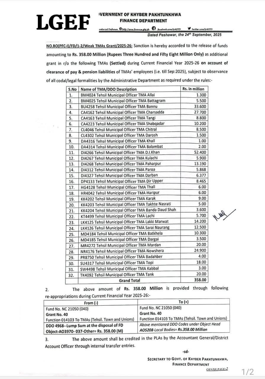 پشاور(بلدیات ٹائمز)لوکل گورنمنٹ ایمپلائز فیڈریشن رجسٹرڈ خیبرپختونخوا کی کاوشیں بار آور ثابت ہوئیں اور خیبرپختونخوا کے بندوبستی ایریاز کی 32 تحصیل میونسپل ایڈمنسٹریٹر کے ملازمین اور پنشنرز کے 30 ستمبر 2025 تک کے بقایاجات کی ادائیگی کے لئے 358.000 ملین روپے کی ایڈیشنل گرانٹ ریلیز کر دی گئی ھے۔ تفصیلات کے مطابق گزشتہ روز کی اعلیٰ سطح کی میٹنگز اور فیڈریشن کی طرف سے کمزور مالی پوزیشن والی TMAs کے ملازمین اور پنشنرز کی تنخواہوں اور پنشن کی ادائیگیوں کے لئے صوبائی حکومت سے روابط کئے گئے تھے جس کے نتیجہ میں اج پہلے سے بھیجے گئے 5 TMAS کے کیس کی 161.000 ملین روپے اور 358.000 ملین روپے کی ایڈیشنل گرانٹ 32 TMAs کے لئے ریلیز کر دی گئی ہے لوکل گورنمنٹ ایمپلائز فیڈریشن رجسٹرڈ خیبرپختونخوا کے