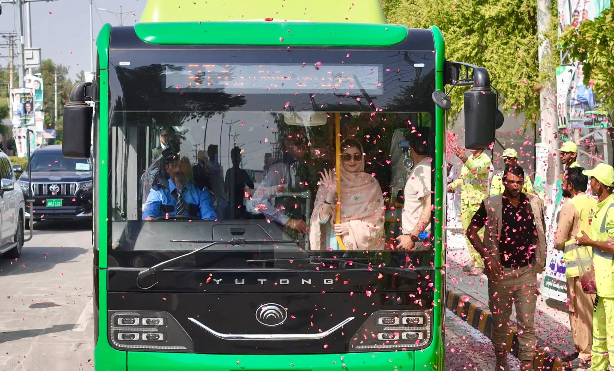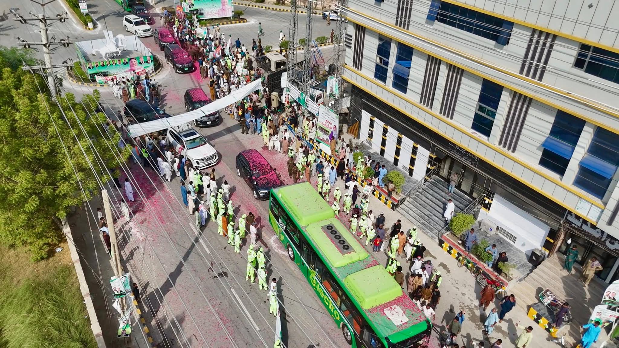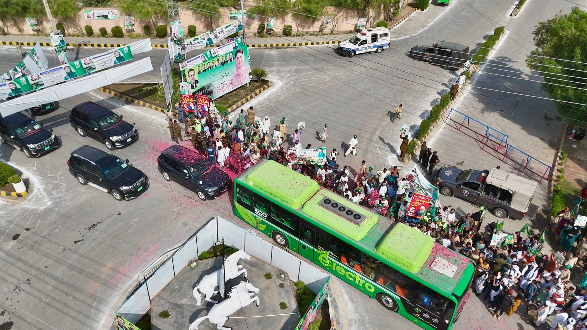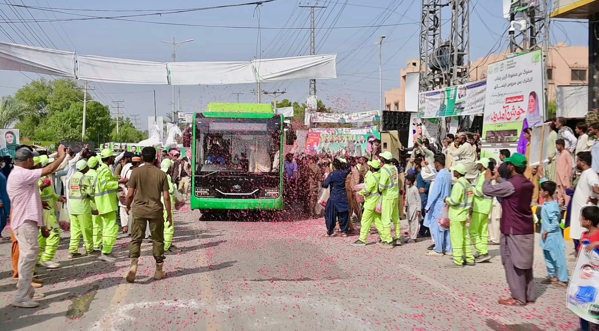 وزیر اعلیٰ مریم نواز شریف نے جیل روڈ بس سٹاپ سے تقریب گاہ کا سفر الیکٹرو بس میں کیا۔ڈیرہ غازی خان کے عوام اور طلبہ کا بے مثال جوش وخروش تھا۔ڈی جی خان کی پہلی الیکٹرو بس پر راستے میں گل پاشی کی گئی۔ستھرا پنجاب کے ورکرز نے وزیر اعلی مریم نواز شریف کیلئے خیر مقدمی بینرز اٹھا رکھے تھے۔”سجن آ ون آکھی ٹھرن”وزیر اعلیٰ مریم نواز۔۔ تم بے مثال ہو”وزیر اعلیٰ مریم نواز شریف نے ہاتھ ہلا کر نعروں کا جواب دیا۔وزیر اعلیٰ مریم نواز شریف کو تقریب گاہ پہنچنے پر باڈر ملٹری فورس اور بلوچ لیویزکی خاتون اہلکاروں نے سلامی دی۔وزیر اعلیٰ مریم نواز شریف کو ڈی جی خان الیکٹرو بس پراجیکٹ پر بریفنگ دی گئی۔ائیر کنڈیشنڈ الیکٹرو بس میں وائی فائی،چارچنگ پورٹ بھی موجودہیں۔خواتین مسافروں کیلئے الگ کمپارٹمنٹ، نگرانی کیلئے کیمرے بھی نصب کیے گئے ہیں۔ڈیرہ غازی خان ڈسٹرکٹ میں پہلے فیز میں 24 – الیکٹرو بسیں چلائی جائیں گی۔ڈیرہ غازی خان جنرل بس سٹینڈ تا کوٹ چھٹہ، چوٹی زیریں بس چلائی جارہی ہے۔