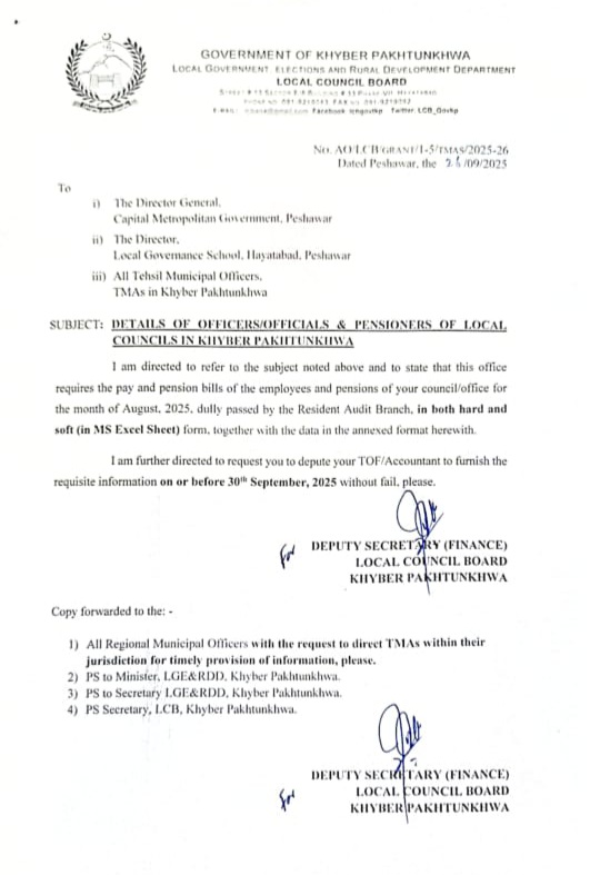 پشاور(بلدیات ٹائمز) لوکل گورنمنٹ ایمپلائز فیڈریشن رجسٹرڈ خیبرپختونخوا کی محنت کے ثمرات سامنے آنے شروع ہو گئے ہیں جس کے نتیجے میں بلدیاتی اداروں کے ملازمین اور پنشنرز کی تنخواہوں اور پنشن کی آن لائن یکم تاریخ کو بروقت ادائیگی یقینی بنانے کے لئے لوکل کونسل بورڈ نے ابتدائی طور پر صوبہ بھر کی تحصیل میونسپل ایڈمنسٹریٹر سے تمام ملازمین اور پنشنرز کے پرسنل/ونڈر نمبر ڈسٹرکٹ اکاونٹ افیسر سے مرتب کردہ طلب کرلئے ہیں جس کے لئے باقاعدہ سرکلر LCB سے جاری کر دیا گیا ہے