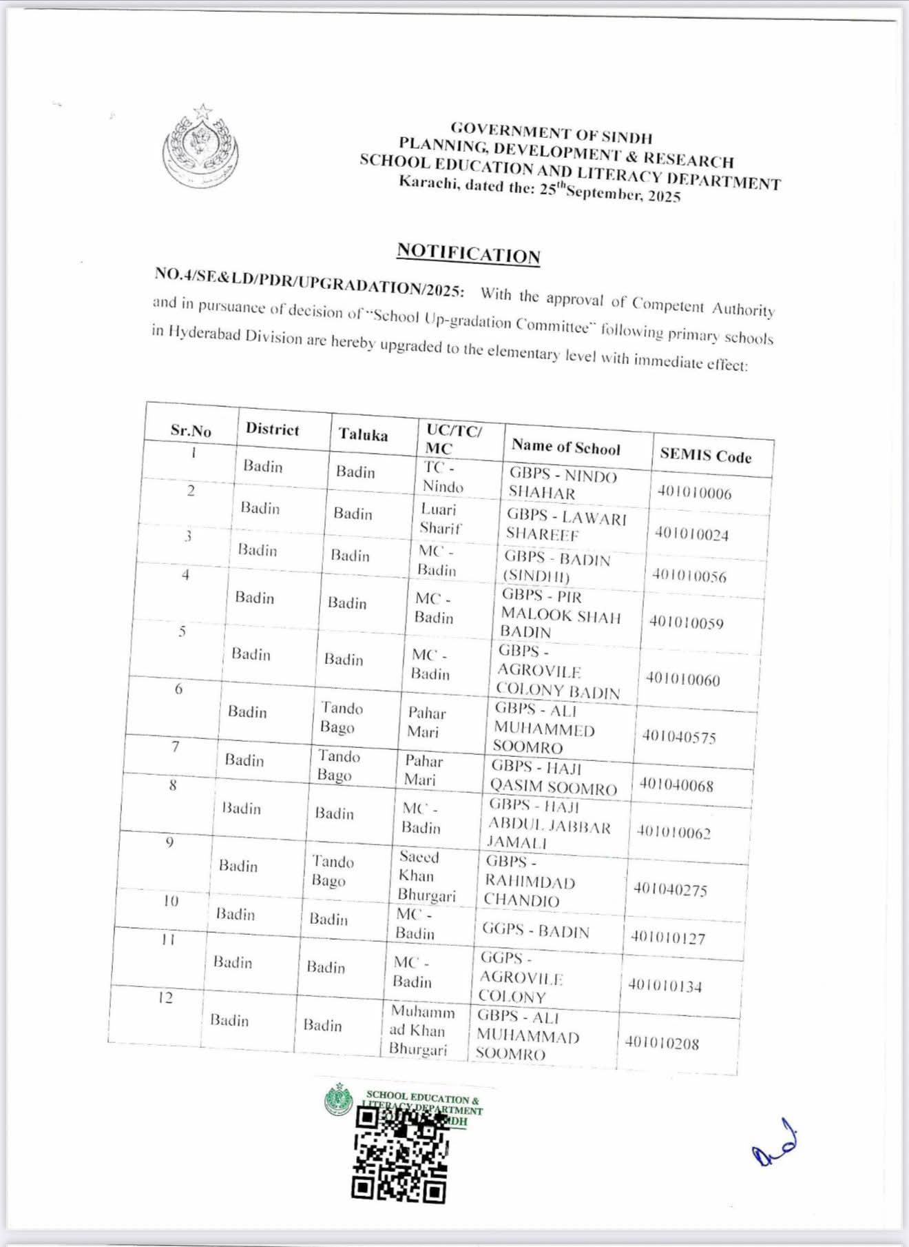 سندھ اسکول ایجوکیشن ڈیپارٹمنٹ نے صوبے میں تعلیم کے فروغ کے لیے اہم قدم اٹھاتے ہوئے 2000 پرائمری اسکولوں کو ایلیمینٹری اسکول میں اپ گریڈ کردیا ہے، جس کا باضابطہ نوٹیفکیشن بھی جاری کر دیا گیا ہے۔ وزیر تعلیم سردار علی شاہ کا کہنا ہے کہ سندھ میں پوسٹ پرائمری اسکولوں کی کمی ہے، اسی وجہ سے پرائمری اسکولوں کو اپ گریڈ کیا جا رہا ہے تاکہ پانچویں جماعت پاس کرنے والے بچے اپنی تعلیم جاری رکھ سکیں۔ اس اقدام سے تعلیمی شعبے میں بہتری آئے گی اور بچوں کو اپنے ہی علاقوں میں قریب ترین ایلیمینٹری اسکول کی سہولت میسر ہوگی،