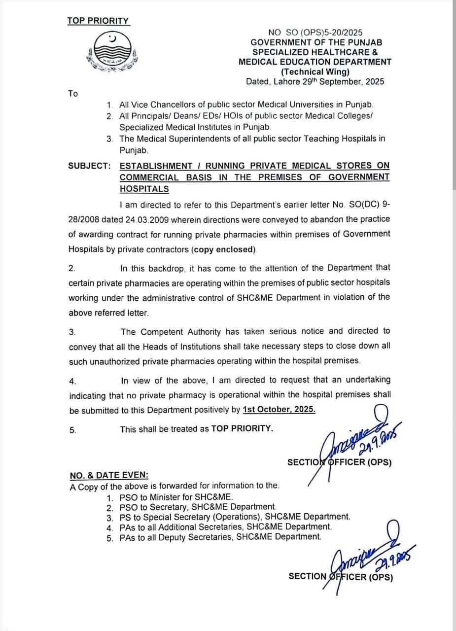 پنجاب حکومت کی طرف سےسرکاری ہسپتالوں کی حدود میں ہر قسم کے نجی میڈیکل سٹورز / فارمیسیز کو فوری بند کرنے کا حکم دے دیا گیا۔فی الوقت سرکاری ہسپتالوں میں تمام نجی میڈیکل سٹورز / فارمیسیز 2009 کے مراسلہ کی خلاف ورزی ہے۔اعلیٰ حکام نے اس خلاف ورزی کا سخت نوٹس لیا ہے۔تمام وائس چانسلرز، پرنسپلز، ڈینز، ایگزیکٹو ڈائریکٹرز اور میڈیکل سپرنٹینڈنٹس کو یکم اکتوبر تک اس حوالہ سے محکمہ صحت میں رپورٹ پیش کرنے کی ہدایت کی گئی ہے۔پنجاب سپیشلائزڈ ہیلتھ کیئر اینڈ میڈیکل ایجوکیشن ڈیپارٹمنٹ کی طرف سے باقاعدہ مراسلہ جاری کر دیا گیا ہے۔
