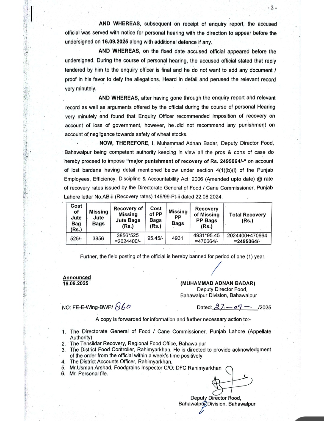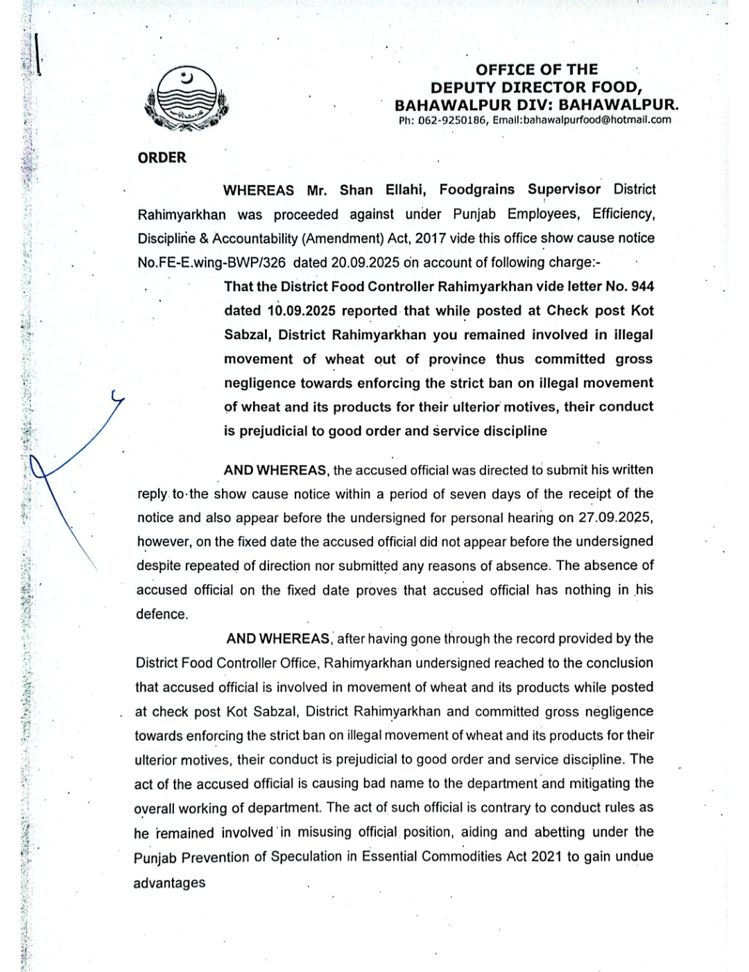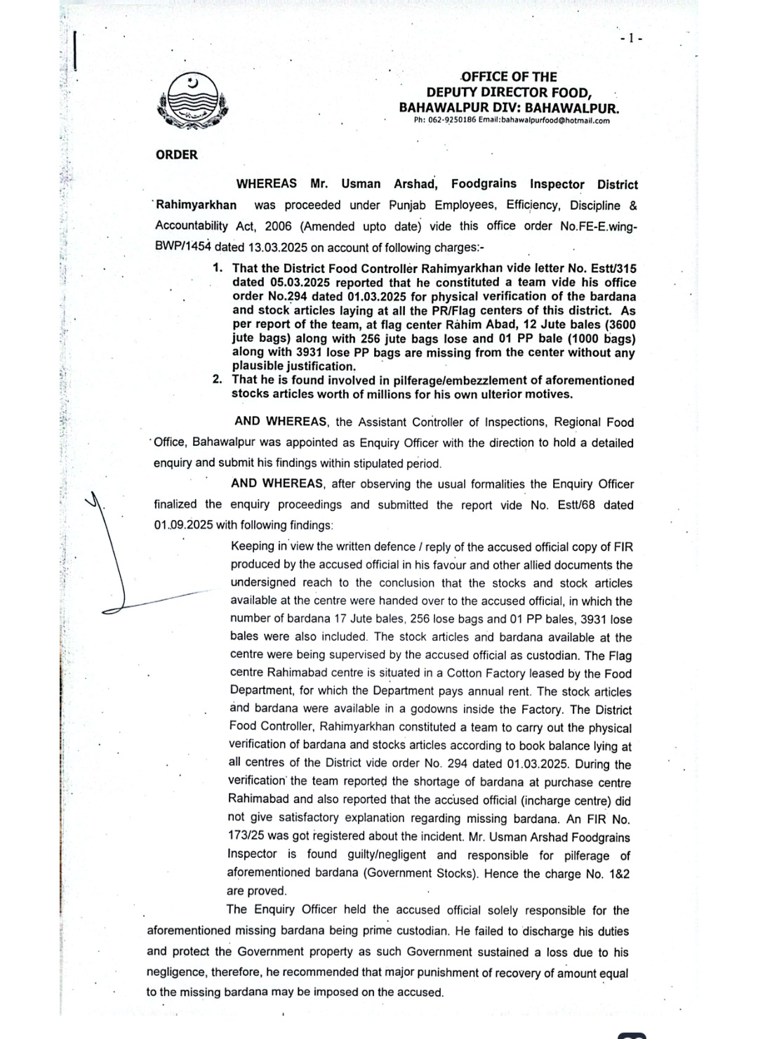 ،رحیم یار خان کے فوڈ گرین انسپکٹر پر سرکاری باردانہ میں خرد برد کا الزام ثابت ہونے پر 25 لاکھ روپے کی ریکوری کا حکم بھی دے دیا گیا، علاوہ ازیں 4 فوڈ گرین انسپکٹرز اور 2 فوڈ گرین سپروائزر کے بھی تبادلے کر دیے گئے ہیں۔ ترجمان نے واضح کیا کہ غیر قانونی سرگرمیوں میں ملوث ملازمین کو کسی صورت رعایت نہیں دی جائے گی، وزیر اعلیٰ پنجاب کی ہدایت پر محکمے میں شفافیت کو یقینی بنانے کیلئے سخت نگرانی اور زیرو ٹالرنس پالیسی پر عملدرآمد کیا جارہا ہے۔
