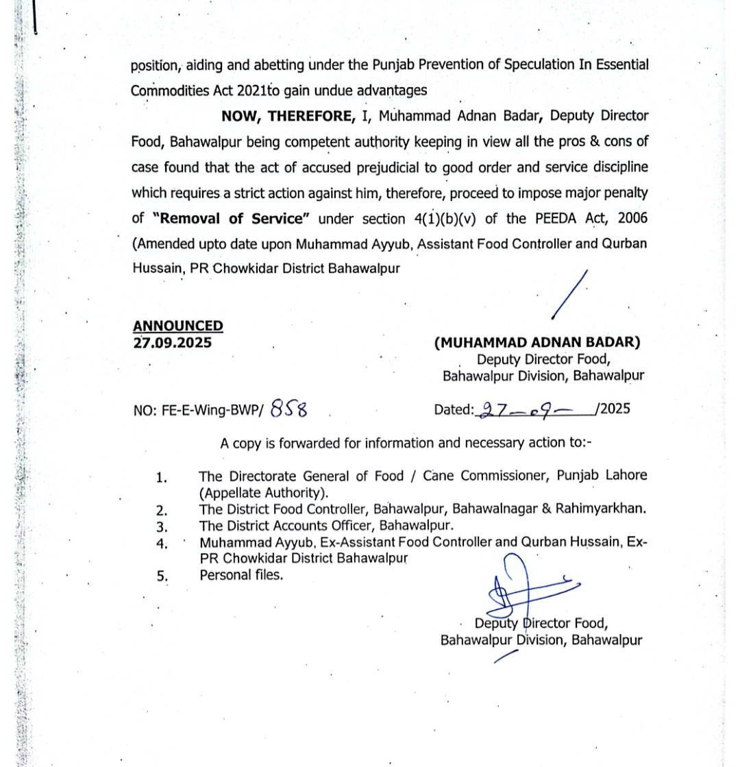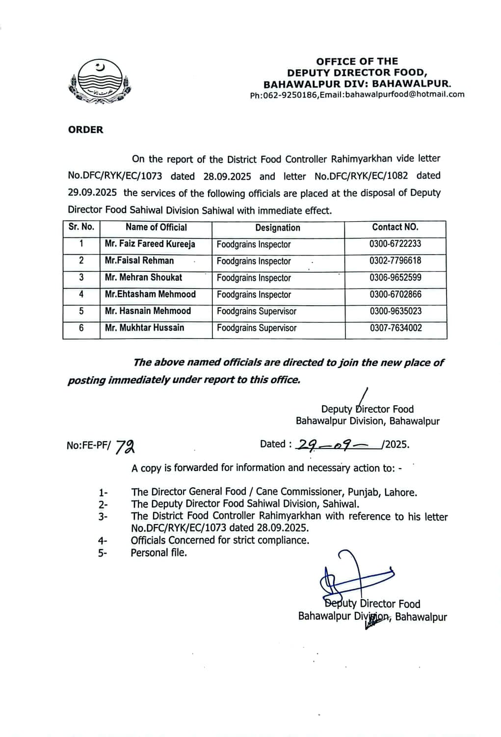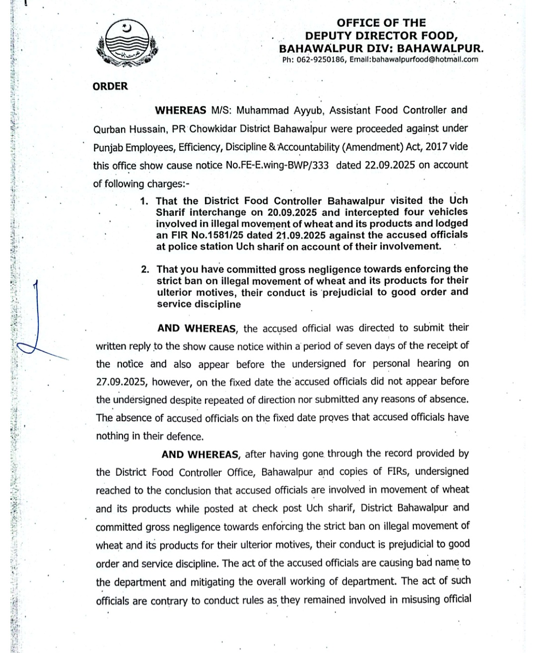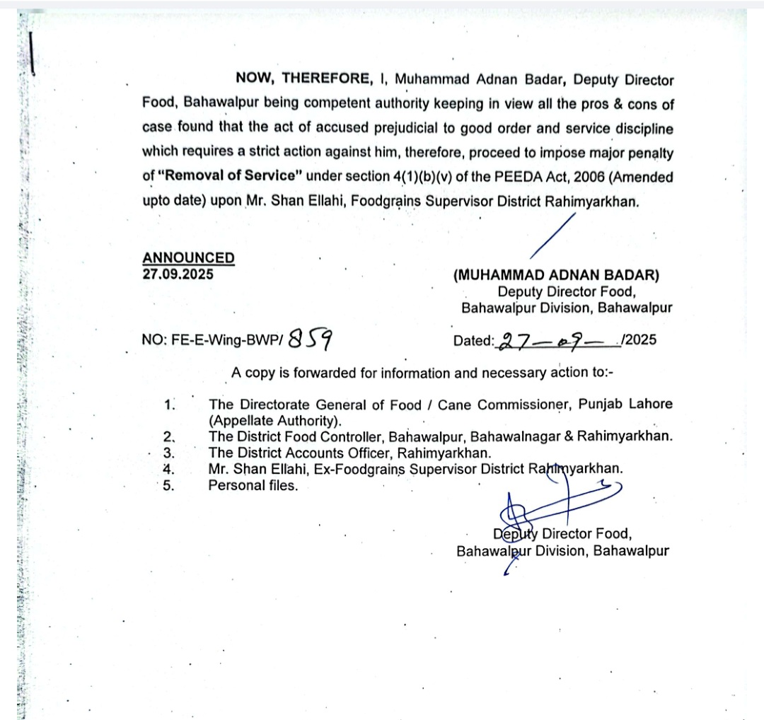 ،رحیم یار خان کے فوڈ گرین انسپکٹر پر سرکاری باردانہ میں خرد برد کا الزام ثابت ہونے پر 25 لاکھ روپے کی ریکوری کا حکم بھی دے دیا گیا، علاوہ ازیں 4 فوڈ گرین انسپکٹرز اور 2 فوڈ گرین سپروائزر کے بھی تبادلے کر دیے گئے ہیں۔ ترجمان نے واضح کیا کہ غیر قانونی سرگرمیوں میں ملوث ملازمین کو کسی صورت رعایت نہیں دی جائے گی، وزیر اعلیٰ پنجاب کی ہدایت پر محکمے میں شفافیت کو یقینی بنانے کیلئے سخت نگرانی اور زیرو ٹالرنس پالیسی پر عملدرآمد کیا جارہا ہے۔
