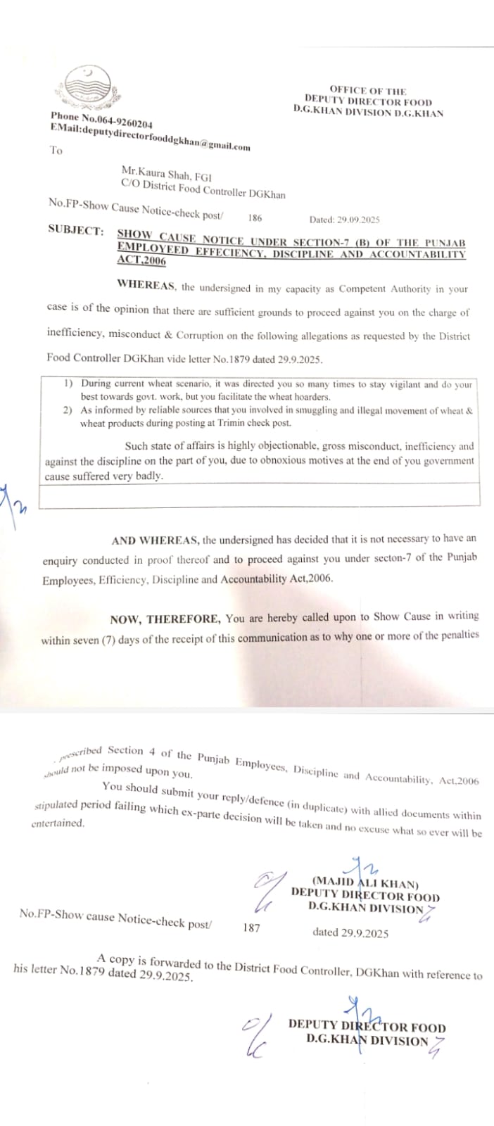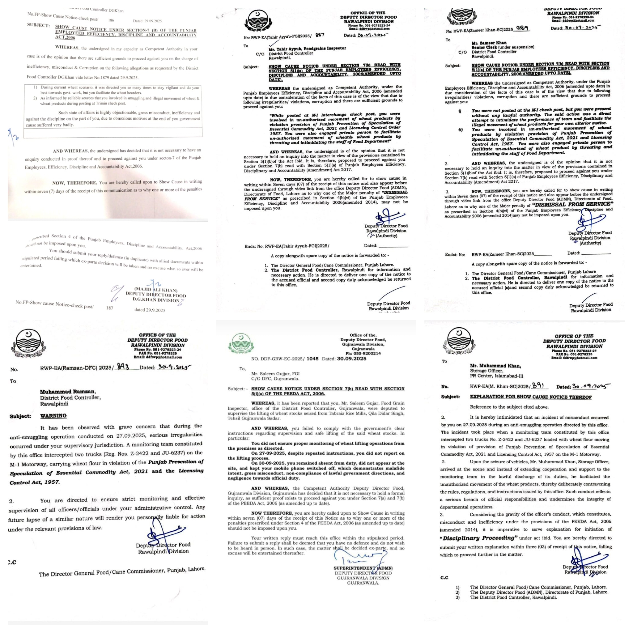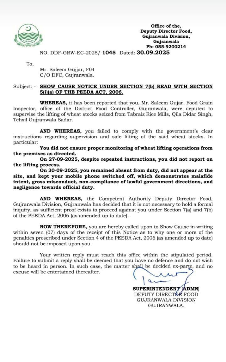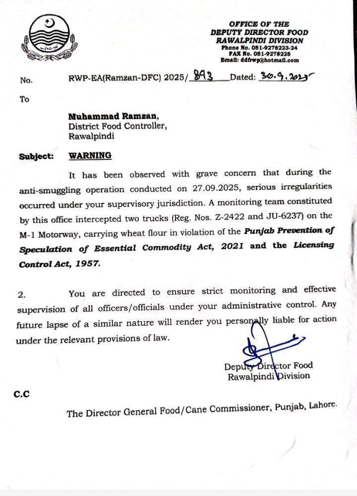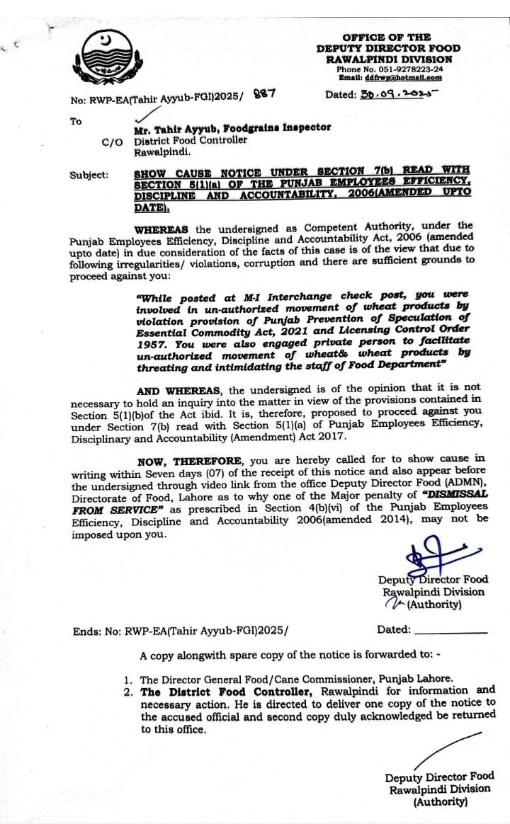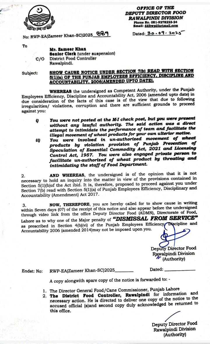 سینئر کلرک ضمیر خان اور فوڈ گرین انسپکٹر طاہر ایوب کے خلاف برطرفی کی کارروائی شروع کردی گئی ہے، علاوہ ازیں غیر قانونی ذخیرہ اندوزی کیخلاف آپریشن میں بے ضابطگیوں پر ڈی ایف سی راولپنڈی محمد رمضان کو حتمی وارننگ جاری کی گئی ہے،اسٹوریج آفیسر محمد خان پر بھی گندم اسمگلرز کی معاونت کا الزام پر 3 دن میں وضاحت طلب کی گئی ہے،فوڈ گرین انسپکٹر ڈی جی خان کورا شاہ سے بھی مافیا کی سہولت کاری پر جواب طلبی کی گئی ہے، ترجمان محکمہ پرائس کنٹرول کا کہنا تھا کہ غیر قانونی سر گرمیوں میں ملوث ملازمین کو کسی صورت رعایت نہیں دی جائے گی، محکمے میں شفافیت کو یقینی بنانے کیلئے سخت نگرانی اور زیرو ٹالرنس پالیسی جاری ہے۔