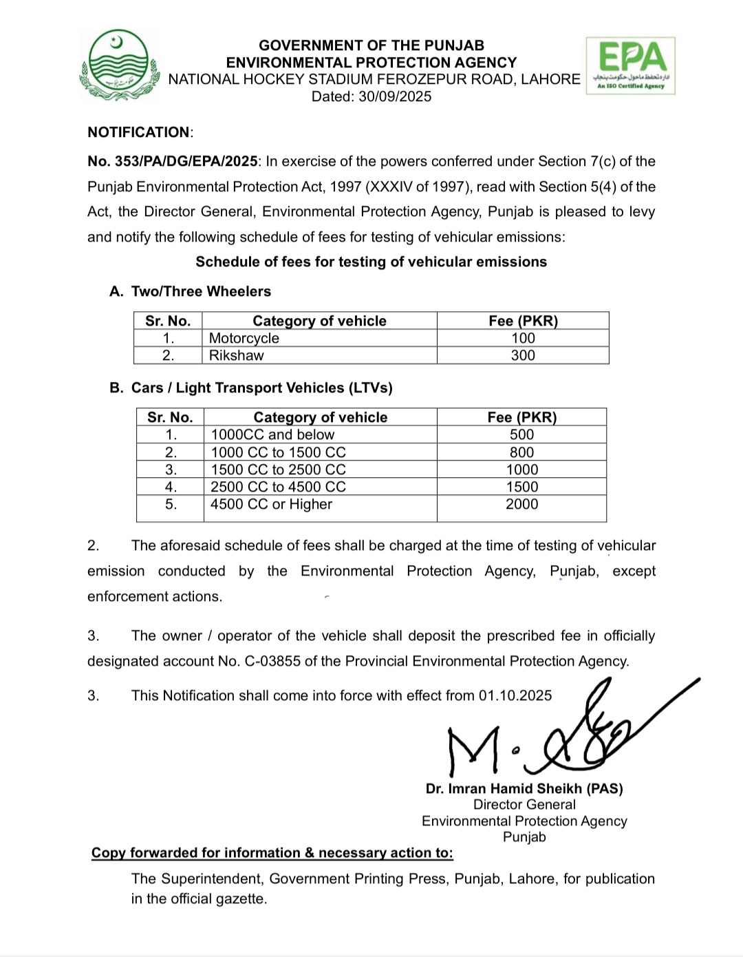 Schedule of fees for testing of vehicular emissions notification