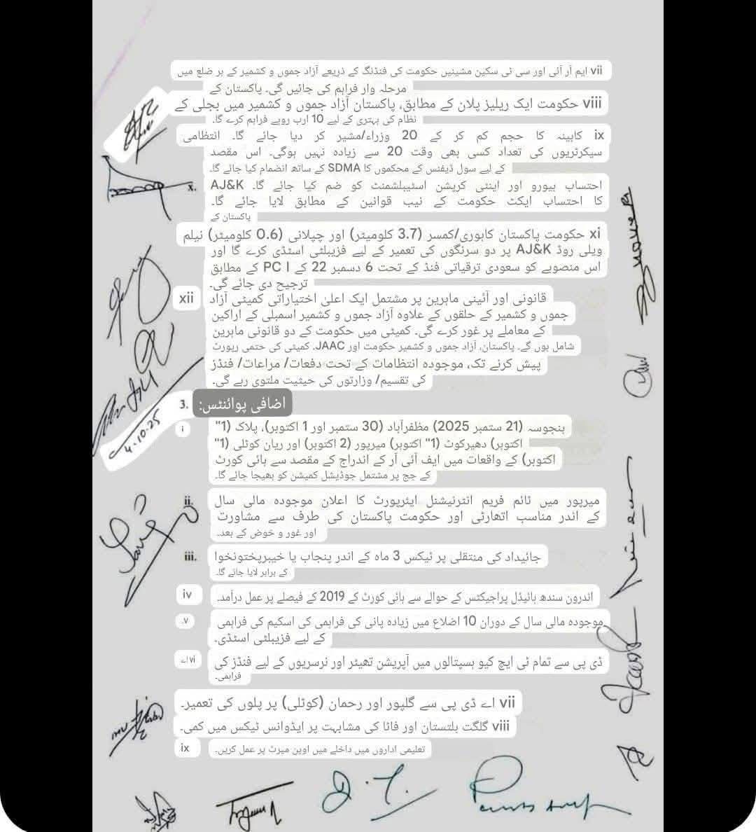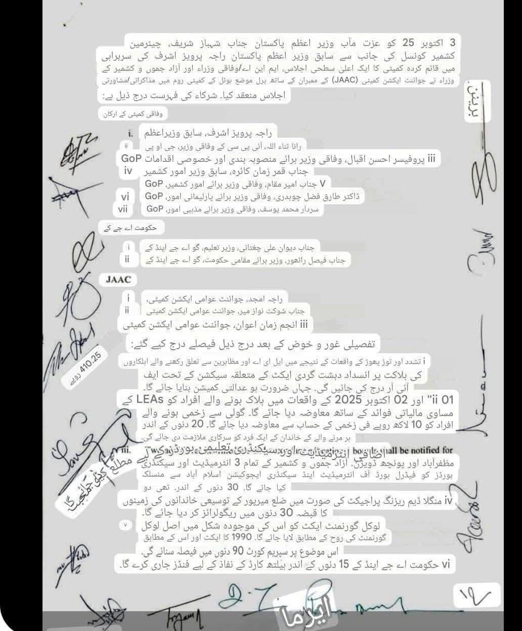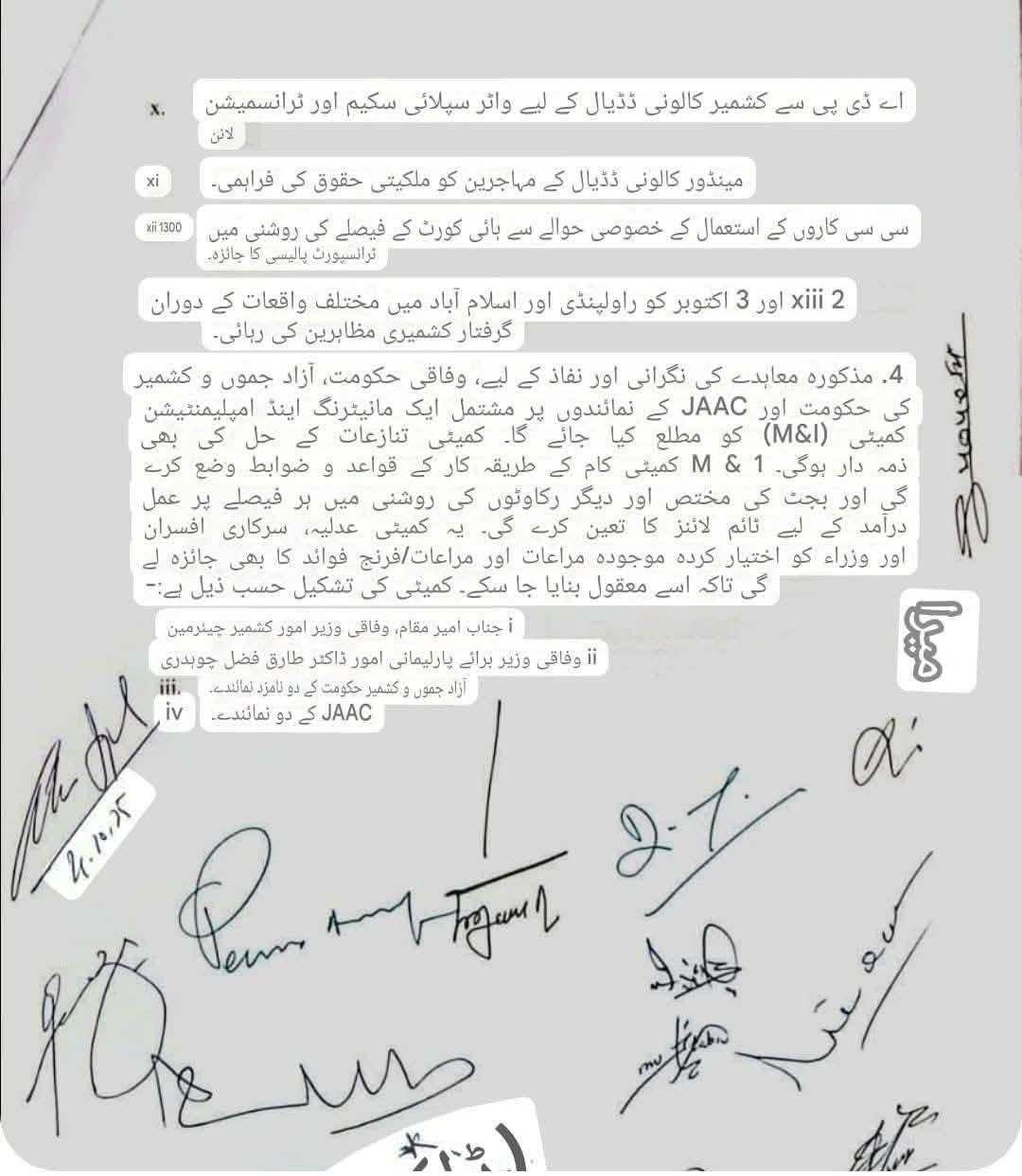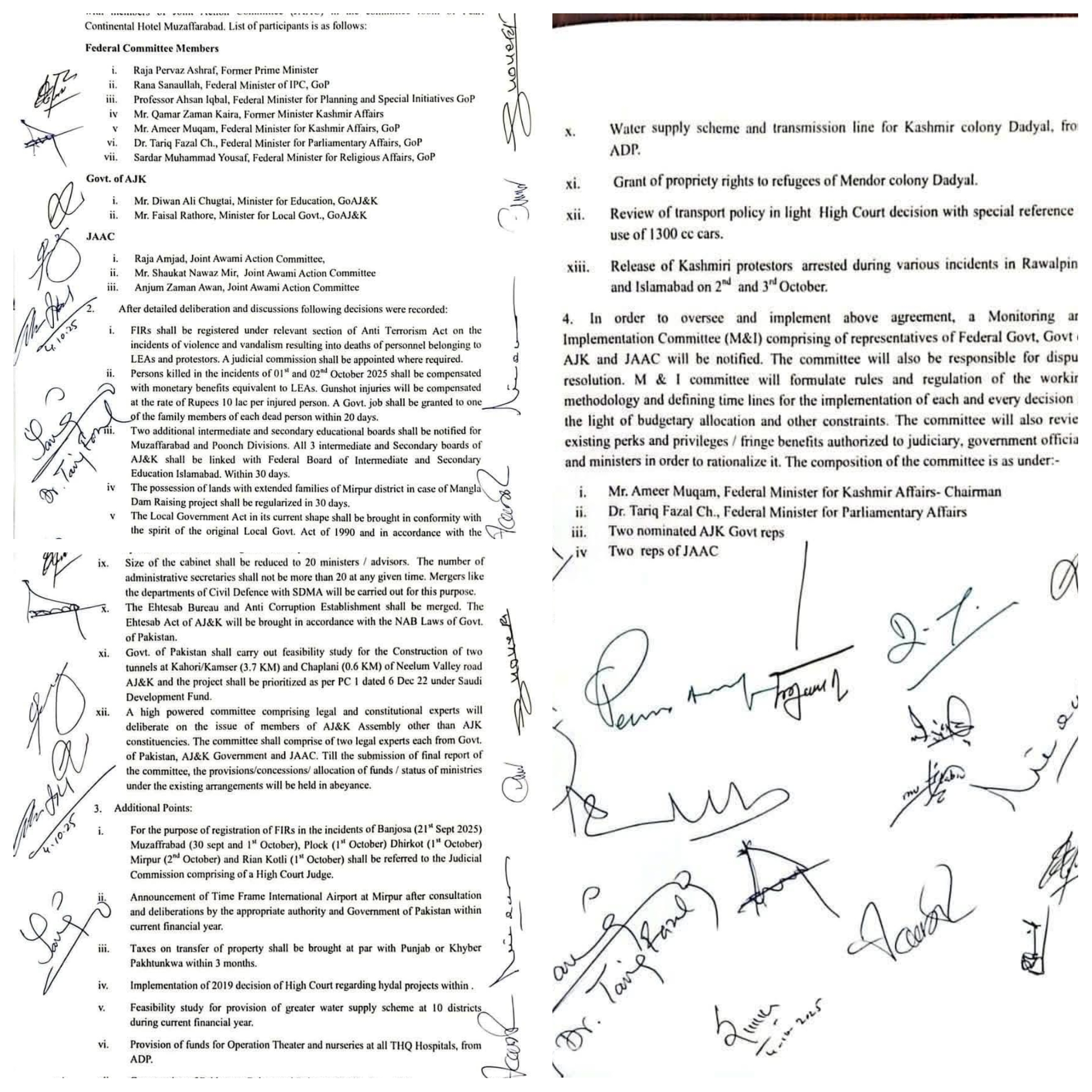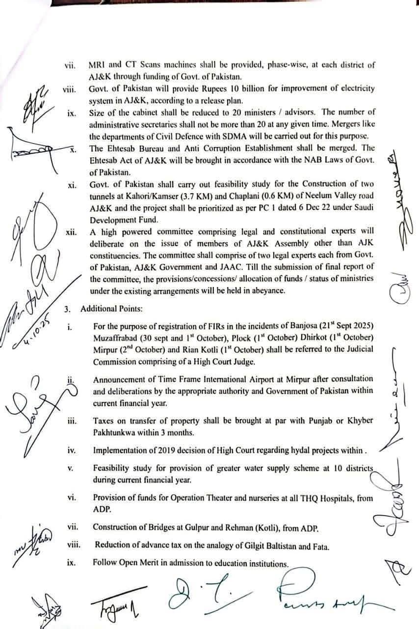 • یکم اور 2 اکتوبر کے واقعات میں ہونے والی ہلاکتوں اور زخمیوں پر متعلقہ دفعات کے تحت انسدادِ دہشت گردی ایکٹ میں ایف آئی آر درج ہوں گی۔ • جہاں ضرورت ہو وہاں عدالتی کمیشن بنایا جائے گا۔2. شہداء و زخمیوں کے معاوضے:• جاں بحق افراد کے لواحقین کو وہی معاوضہ دیا جائے گا جو قانون نافذ کرنے والے اداروں کے اہلکاروں کو دیا جاتا ہے۔ • گولی لگنے سے زخمی ہونے والے افراد کو فی کس 10 لاکھ روپے دیے جائیں گے۔ • ہر شہید کے لواحقین میں سے ایک فرد کو سرکاری ملازمت دی جائے گی۔ 3. تعلیمی اصلاحات:• مظفرآباد اور پونچھ ڈویژن کے لیے دو نئے تعلیمی بورڈ قائم کیے جائیں گے۔ • آزاد کشمیر کے تمام تعلیمی بورڈز کو وفاقی بورڈ اسلام آباد سے منسلک کیا جائے گا (30 دن میں)۔ 4. منگلا ڈیم متاثرین:• میرپور ڈیم کے متاثرہ خاندانوں کی زمینوں کو 30 دن میں قانونی حیثیت دی جائے گی۔ 5. بلدیاتی قانون: • موجودہ بلدیاتی قانون کو اصل 1990ء کے قانون کے مطابق اور عدالتِ عظمیٰ کے فیصلوں کی روشنی میں 90 دن کے اندر لایا جائے گا۔ 6. ہیلتھ کارڈ:• ہیلتھ کارڈ کے لیے فنڈز 15 دن میں جاری ہوں گے۔7. صحت کی سہولیات: • ہر ضلع میں MRI اور CT Scan مشینیں مرحلہ وار فراہم کی جائیں گی۔ 8. بجلی کا نظام:• پاکستان حکومت آزاد کشمیر کے بجلی کے نظام کی بہتری کے لیے 10 ارب روپے فراہم کرے گی۔9. کابینہ اور بیوروکریسی:• کابینہ کا حجم کم کر کے زیادہ سے زیادہ 20 وزراء/مشیر رکھے جائیں گے۔• سیکرٹریز کی تعداد بھی 20 سے زیادہ نہیں ہو گی۔• محکموں کے انضمام (جیسے سول ڈیفنس اور SDMA) کیے جائیں گے۔10. احتساب • احتساب بیورو اور اینٹی کرپشن ادارے کو ضم کیا جائے گا اور قوانین کو NAB کے مطابق کیا جائے گا۔11. ترقیاتی منصوبے:• نیلم ویلی روڈ پر دو ٹنلز کی تعمیر کے لیے فزیبلٹی رپورٹ تیار کی جائے گی۔ • سعودی فنڈ کے منصوبوں کو PC-1 کے مطابق ترجیح دی جائے گی۔12. آئینی کمیٹی:• آزاد کشمیر اسمبلی کے بیرونِ حلقہ ممبران کے معاملے پر ایک اعلیٰ سطحی کمیٹی بنے گی جس میں پاکستان، AJK حکومت اور JAAC کے 2-2 قانونی ماہرین شامل ہوں گے۔ ⸻اضافی فیصلے: