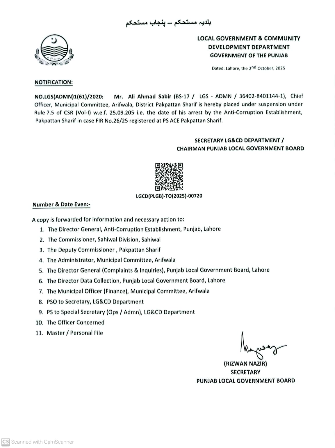 محکمہ بلدیات پنجاب نے کرپشن کے مقدمے کے بعد چیف آفیسر میونسپل کمیٹی عارف والا علی احمد صابر کو معطل کر دیا ہے۔لوکل گورنمنٹ بورڈ نے نوٹیفکیشن جاری کردیا ہے۔چیف آفیسر عارف والا پاک پتن علی احمد صابر کو خلاف محکمہ انٹی کرپشن نے 25 ستمبر کو ایف آئی آر درج کر کے گرفتار کر لیا۔