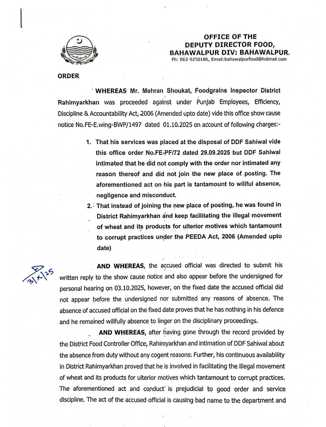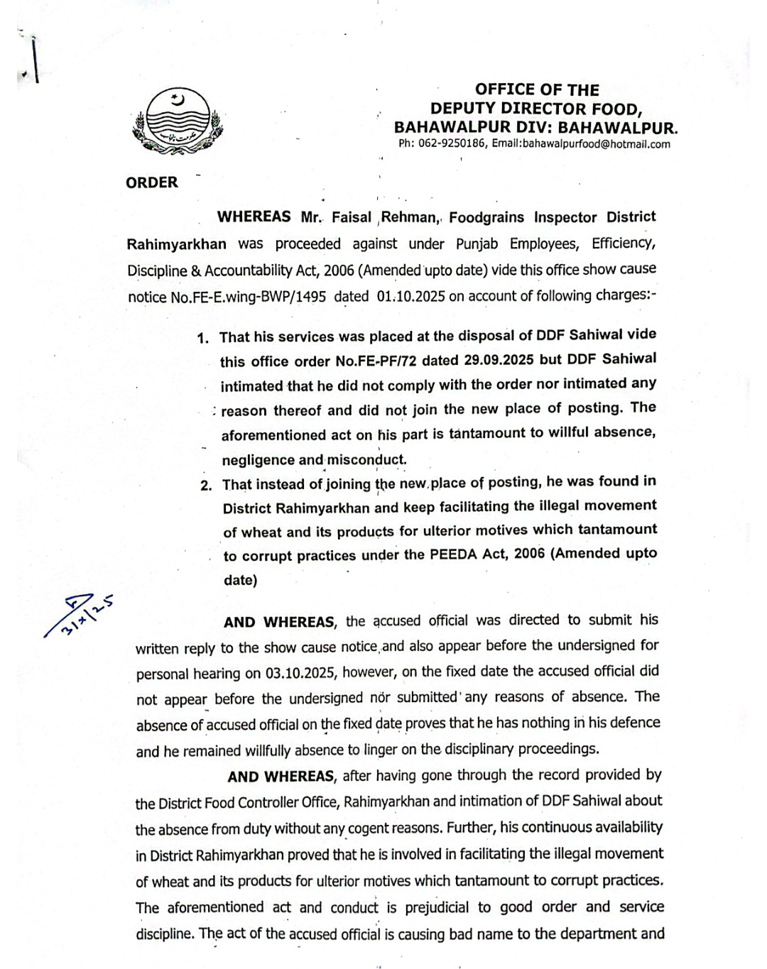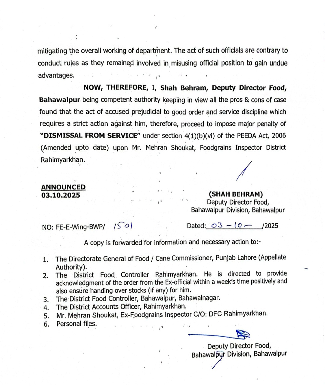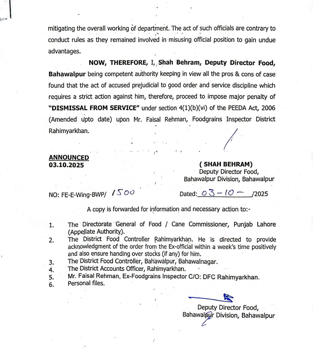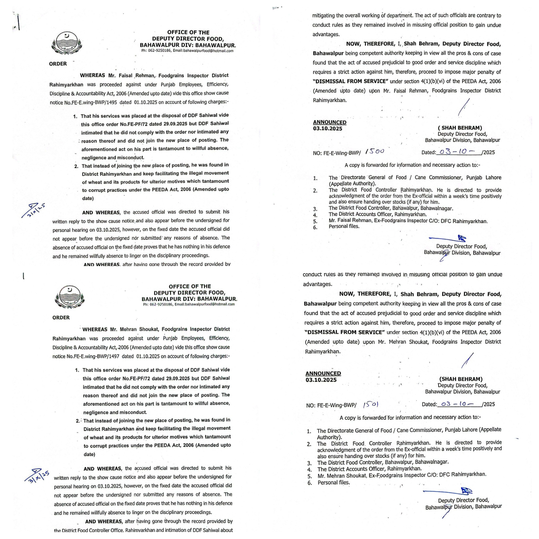 سیکرٹری پرائس کنٹرول ڈاکٹر کرن خورشید کی ہدایت پر محکمے میں ناہل اور کرپٹ افسران کے گرد شکنجہ سخت کردیا گیا ہے،فوڈ ڈائریکٹوریٹ پنجاب کے مزید 2 افسران کو نوکریوں سے برخاست کردیا گیا، ترجمان محکمہ پرائس کنٹرول پنجاب کے مطابق نااہلی ، کرپشن اور مافیا کی سہولت کاری ثابت ہونے پر پیڈا ایکٹ کے تحت کارروائی کی گئی،رحیم یار خان کے فوڈ گرین انسپکٹرز فیصل رحمان اور مہران شوکت کیخلاف کارروائی کی گئی،