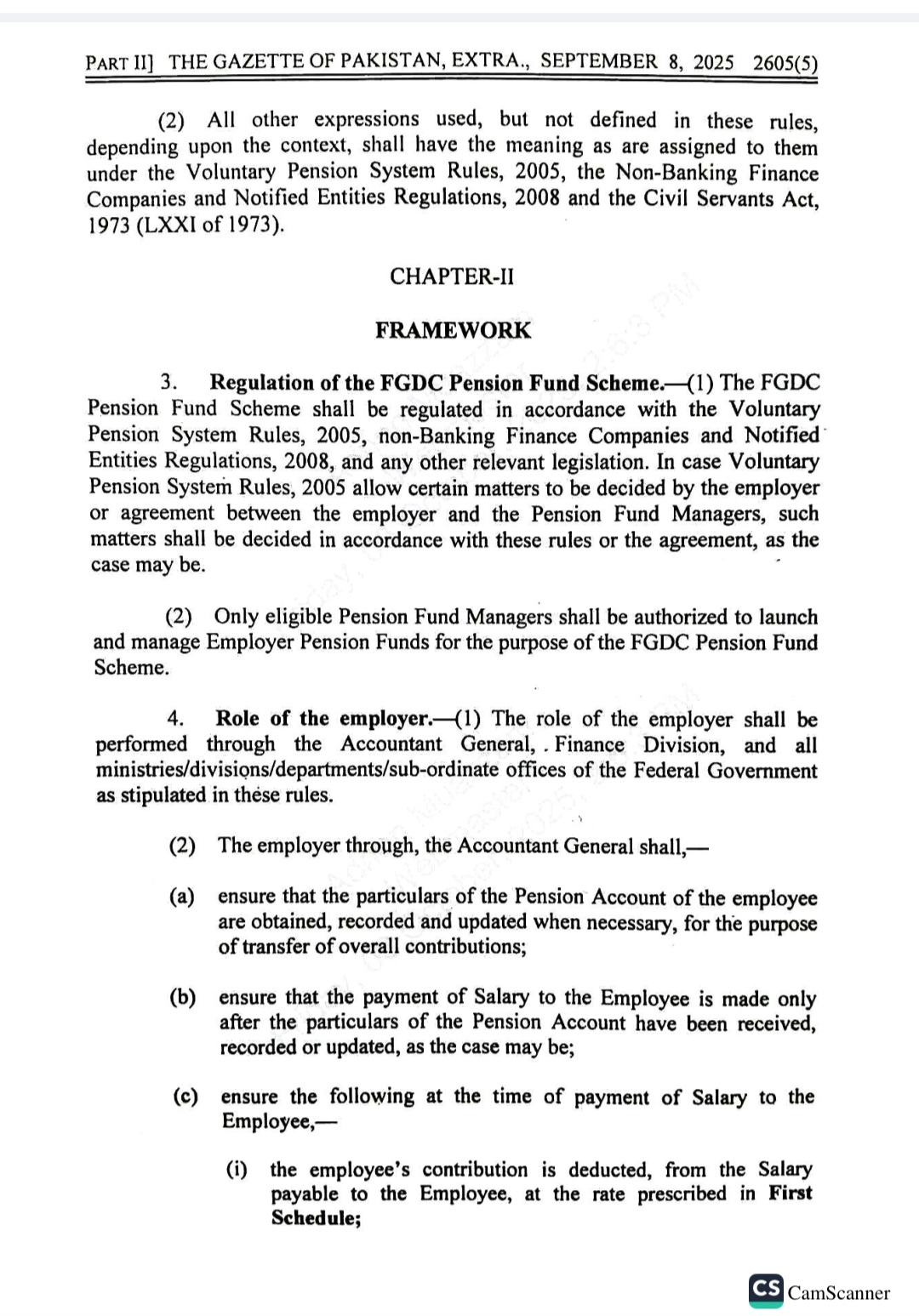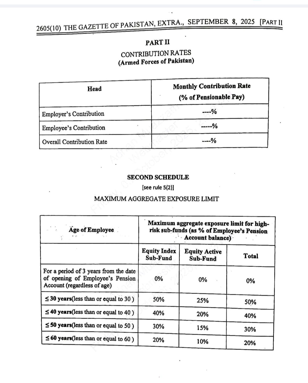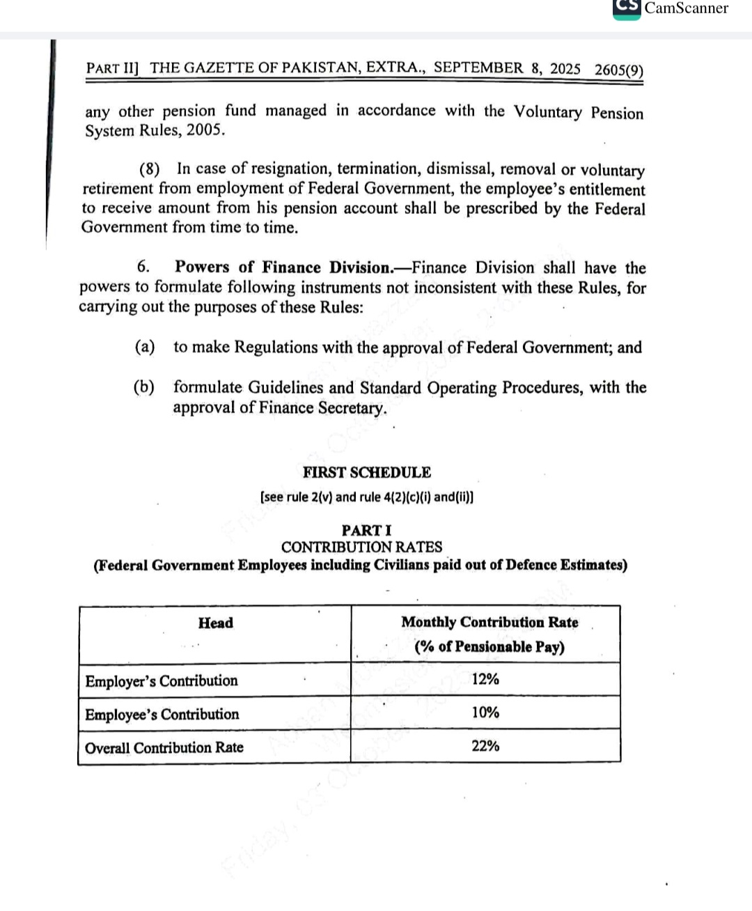 اس سلسلہ میں جاری گزٹ نوٹیفکیشن کے مطابق وفاقی ملازمین پنشن کےلیے اپنی تنخواہ کا 10 فیصد جمع کرائیں گے۔حکومت کی جانب سے 12 فیصد کنٹری بیوشن دی جائے گی۔ملازمین ریٹائرمنٹ سے قبل پنشن اکاؤنٹ سے رقم نہیں نکال سکیں گے۔ریٹائرمنٹ پر اکاؤنٹ سے 25 فیصد رقم نکالنے کی اجازت ہوگی۔