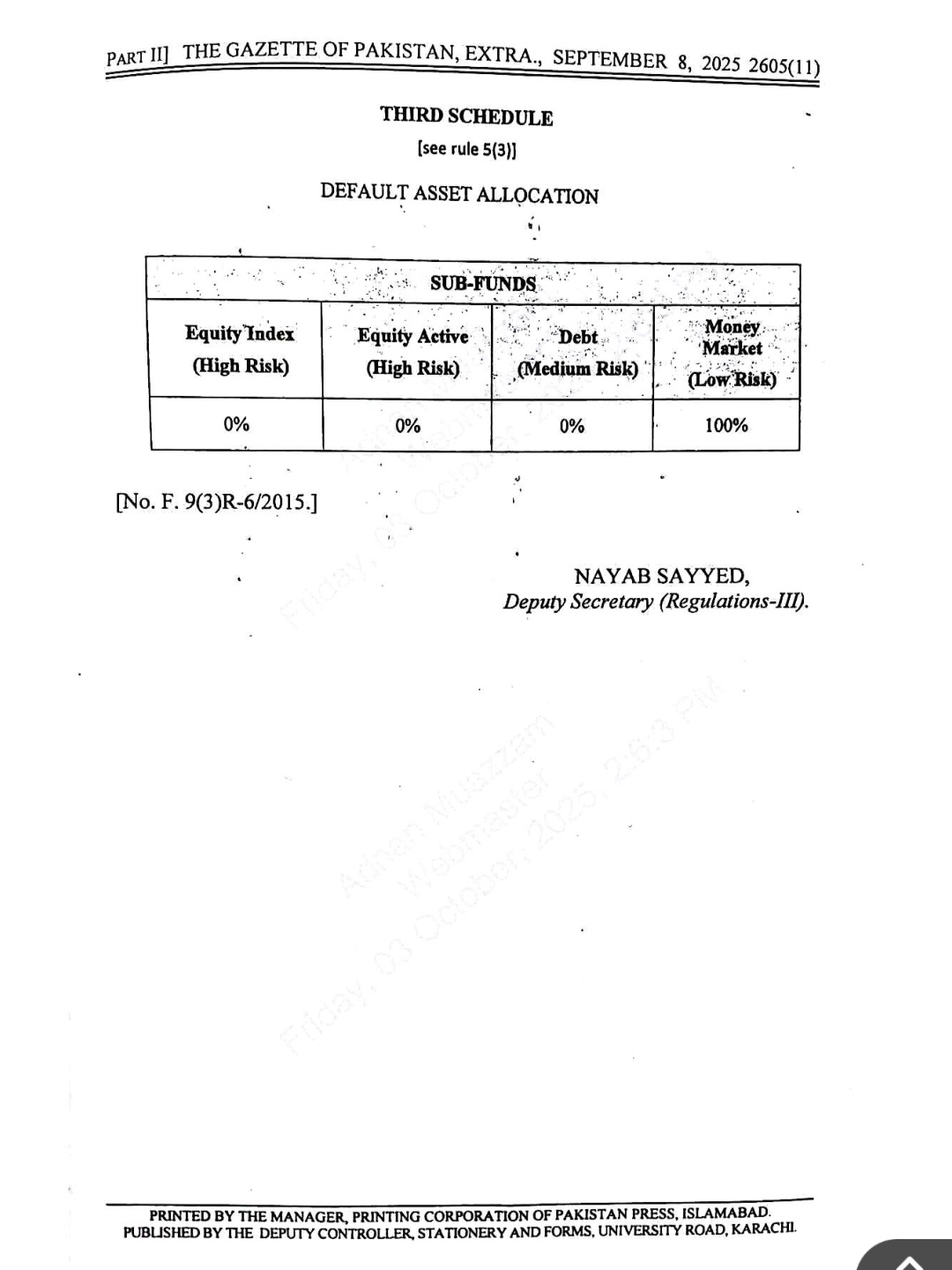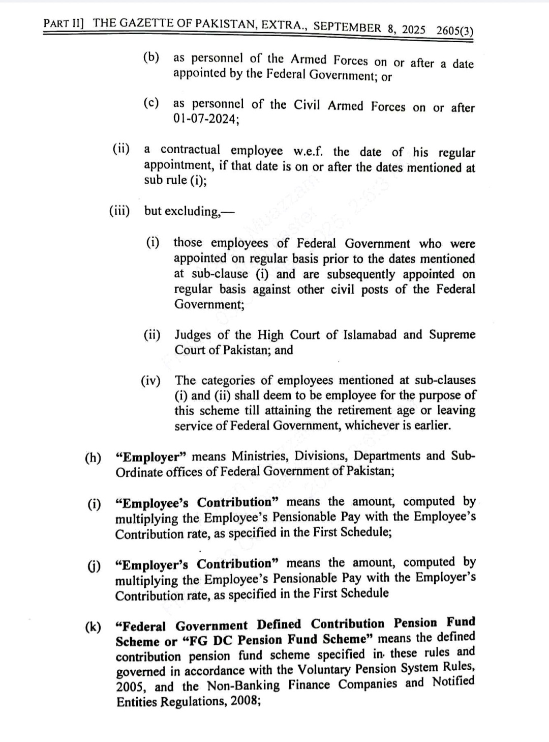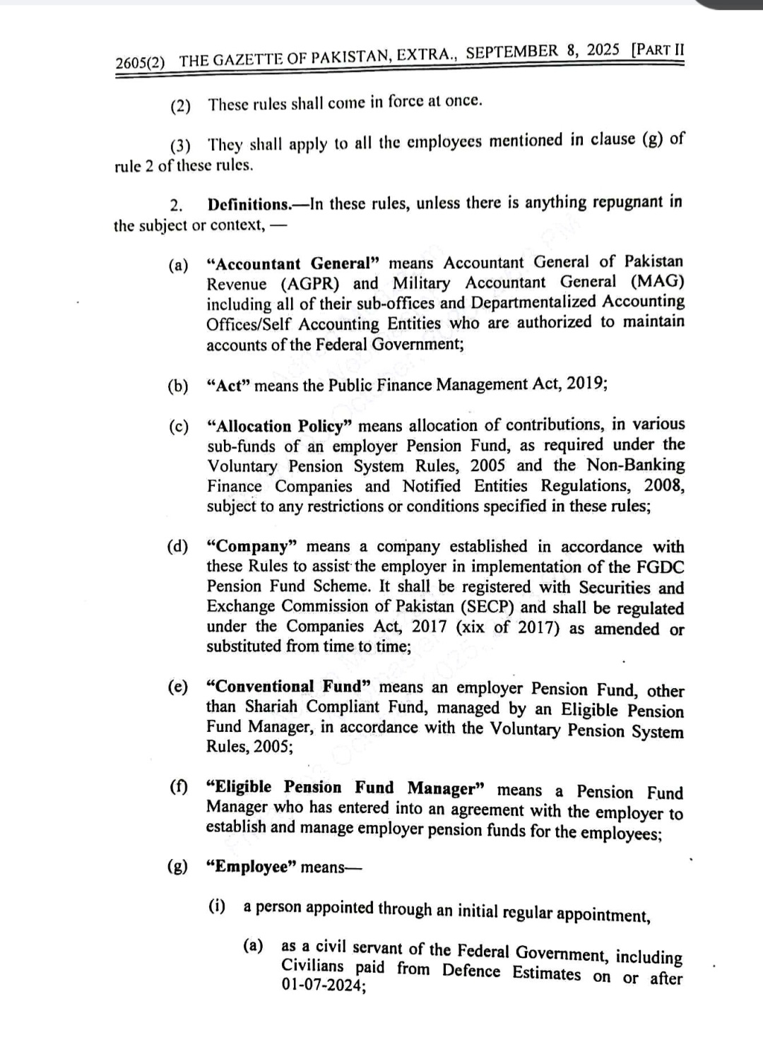 اس سلسلہ میں جاری گزٹ نوٹیفکیشن کے مطابق وفاقی ملازمین پنشن کےلیے اپنی تنخواہ کا 10 فیصد جمع کرائیں گے۔حکومت کی جانب سے 12 فیصد کنٹری بیوشن دی جائے گی۔ملازمین ریٹائرمنٹ سے قبل پنشن اکاؤنٹ سے رقم نہیں نکال سکیں گے۔ریٹائرمنٹ پر اکاؤنٹ سے 25 فیصد رقم نکالنے کی اجازت ہوگی۔