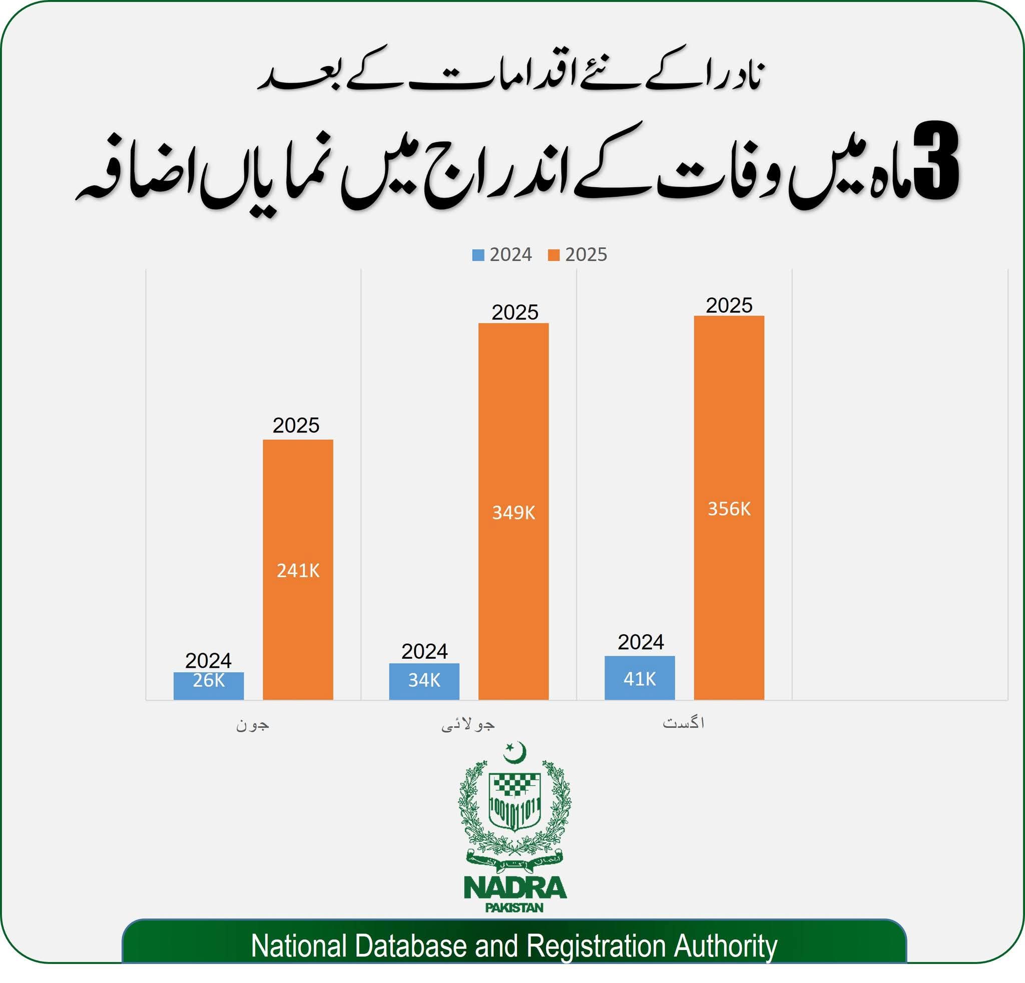 پاکستان میں اب بھی بہت سے افراد اپنے خاندان کے فوت شدہ افراد کا بروقت اندراج نہیں کراتے، اور اگر اندراج کرا بھی دیا جائے تو اکثر مرحوم کا شناختی کارڈ نادرا میں منسوخ نہیں کرایا جاتا، جس سے وراثت، پنشن اور دیگر قانونی معاملات میں مشکلات پیدا ہوتی ہیں۔وفاقی وزیرِ داخلہ کی ہدایت پر نادرا نے اس مسئلے کے حل کے لئے اہم اقدامات کئے ہیں:✅ وفات کے باعث شناختی کارڈ کی منسوخی کی فیس ختم کر دی گئی✅ صوبائی سول رجسٹریشن مینجمنٹ سسٹم (CRMS) کے ساتھ ڈیٹا شیئرنگ کو مضبوط بنایا گیا✅ وفات کی بائیومیٹرک تصدیق کو لازم قرار دیا گیا تاکہ غلط یا جعلی اندراج سے بچاؤ ہو۔جب کسی شخص کی وفات صوبائی سول رجسٹریشن مینجمنٹ سسٹم میں درج ہوتی ہے تو اس واقعہ کو نادرا کے خاندانی ریکارڈ میں شامل کرلیا جاتا ہے۔ جب بھی کوئی قریبی رشتہ دار نادرا سے کسی بھی خدمات کے لئے رجوع کرتا ہے تو ان سے درخواست کی جاتی ہے کہ پہلے صوبائی سول رجسٹریشن مینجمنٹ سسٹم میں درج شدہ وفات کی بائیومیٹرک تصدیق کریں جس کے بعد متوفی کا شناختی کارڈ منسوخ کیا جاتا ہے اور انہیں نادرا سے درکار خدمات مہیا کی جاتی ہیں۔ اگرچہ نادرا صوبائی سول رجسٹریشن مینجمنٹ سسٹم کے ریکارڈ کی بنیاد پر خودکار طریقے سے شناختی کارڈ منسوخ کر سکتا ہے، لیکن بائیومیٹرک تصدیق کا یہ عمل وفات کے غلط یا جعلی اندراج سے بچاؤ کے لئے ایک ضروری حفاظتی اقدام ہے کیونکہ اس وقت صوبائی نظام میں بائیومیٹرک آلات دستیاب نہیں ہیں۔اصلاحات کی وجہ سے ابتدائی طور پر کچھ دشواریاں ضرور پیش آئیں، مگر نتائج نہایت حوصلہ افزا ہیں اور اموات کے اندراج میں چھ گنا اضافہ ہوا ہے، ڈیٹا کی درستی بہتر ہوئی ہے، اور جعلی اندراجات میں نمایاں کمی آئی ہے۔مزید سہولت کے لیے:📱 شہری اب پاک آئی ڈی ایپ کے ذریعے قریبی رشتہ دار کی وفات کے بعد شناختی کارڈ کی منسوخی کی درخواست جمع کرا سکتے ہیں📲 پنجاب کے تین اضلاع میں بطورِ پائلٹ پراجیکٹ، وفات کا اندراج بھی پاک آئی ڈی ایپ کے ذریعے ممکن بنا دیا گیا ہے۔🌐 جلد ہی پیدائش، شادی، طلاق اور وفات کے اندراج کی سہولت پورے ملک میں دستیاب ہوگی۔نادرا نے پاک آئی ڈی ایپ میں خاندانی ریکارڈ دیکھنے کی مفت سہولت اور ڈیٹا میں تضاد کی نشاندہی کا فیچر بھی شامل کر دیا ہے۔ علاوہ ازیں، نادرا اور صوبائی حکومتیں اپنے نظام کو نیشنل رجسٹریشن اینڈ بائیومیٹرکس پالیسی کے تحت مربوط کر رہی ہیں۔نادرا شہریوں سے اپیل کرتا ہے کہ وہ زندگی کے اہم واقعات کو بروقت "صوبائی سول رجسٹریشن مینجمنٹ سسٹم (CRMS)” میں رجسٹر کروائیں اور خاندانی ریکارڈ کو نادرا کے ساتھ اپ ڈیٹ رکھیں۔ یہ نہ صرف ایک قانونی ذمہ داری ہے بلکہ سرکاری سہولیات تک مسلسل رسائی اور قومی ڈیٹا کی درستی یقینی بنانے کے لئے بھی ضروری ہے۔📲 پاک آئی ڈی ایپ ڈاؤن لوڈ کریں — نادرا کی خدمات اب آپ کے فون پر!