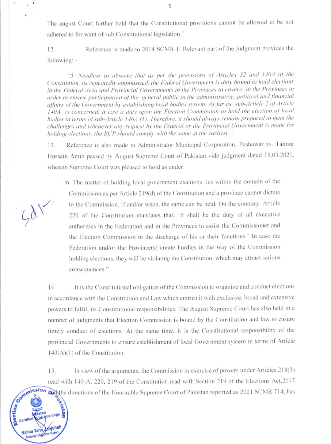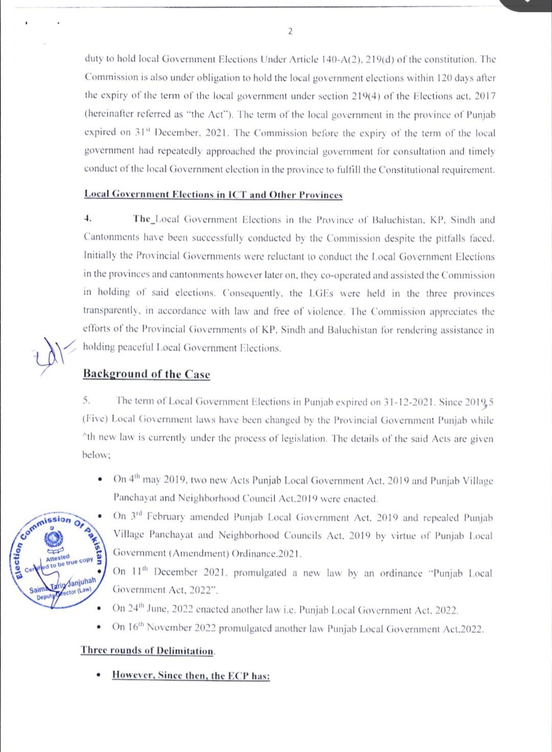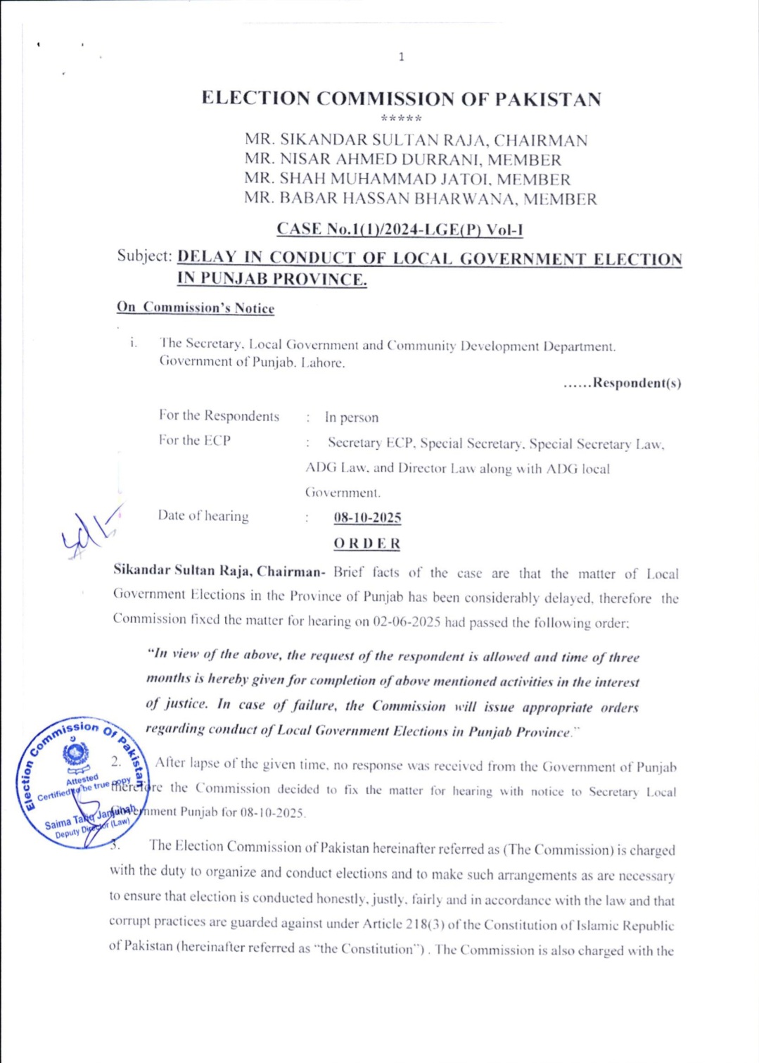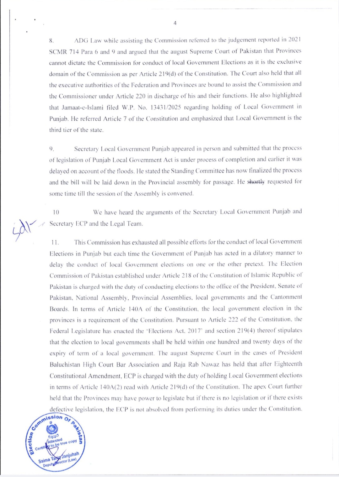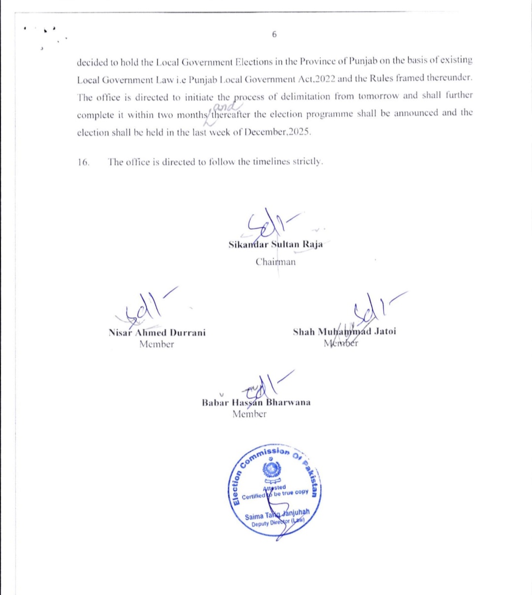 فیصلے میں کہا گیا ہے کہ پنجاب کے بلدیاتی انتخابات 2022ء کے بلدیاتی قانون کے تحت کرائے جائیں گے۔ الیکشن کمیشن نے صوبائی حکومت کو دو ماہ میں حلقہ بندیاں مکمل کرنے کا حکم دے دیا ہے۔الیکشن کمیشن کے فیصلے میں یہ بھی بتایا گیا ہے کہ ’بلدیاتی حلقہ بندیوں پر فوری طور پر کام شروع کردیا گیا ہے تاکہ انتخابات مقررہ وقت پر منعقد ہوسکیں۔سماعت کے دوران چیف الیکشن کمشنر سکندر سلطان راجہ نے ریمارکس دیے تھے کہ ’اسلام آباد اور پنجاب میں بلدیاتی انتخابات نہ ہونا ہمارے لیے شرمندگی کا باعث ہے۔ الزامات الیکشن کمیشن پر آرہے ہیں، لہٰذا اب ہم فیصلہ سنائیں گے۔پنجاب حکومت کے سپیشل سیکریٹری بلدیات ،کمیشن کے روبرو پیش ہوئے اور صوبائی حکومت کی جانب سے قانون سازی میں تاخیر کی وجوہات بیان کیں۔ تاہم الیکشن کمیشن نے عدم اطمینان کا اظہار کرتے ہوئے واضح کیا کہ مزید تاخیر برداشت نہیں کی جائے گی۔واضح رہے کہ پنجاب میں بلدیاتی اداروں کی مدت سال 2021 میں ختم ہوگئی تھی، جس کے بعد اب تک انتخابات نہیں ہوسکے۔سیکریٹری الیکشن کمیشن نے اجلاس میں بتایا کہ پنجاب میں مقامی حکومتوں کے قوانین میں اب تک 5 مرتبہ ترامیم کی جاچکی ہیں، جبکہ الیکشن کمیشن 3 مرتبہ حلقہ بندیاں مکمل کرچکا ہے۔الیکشن کمیشن کے مطابق ادارہ بارہا صوبائی حکومت کو مراسلے بھجوا چکا ہے اور متعدد اجلاس بھی منعقد کیے جاچکے ہیں، مگر قانون سازی کے فقدان کی وجہ سے الیکشن تاخیر کا شکار ہوتے رہے۔فیصلے کے مطابق، پنجاب کے بلدیاتی انتخابات اب ہر حال میں دسمبر 2025 کے آخری ہفتے میں کرائے جائیں گے تاکہ صوبے میں مقامی حکومتوں کا نظام دوبارہ فعال ہوسکے۔