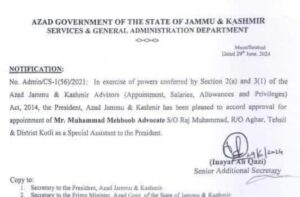 سابق ممبر کشمیر کونسل چوہدری محبوب کو صدر آزادکشمیر کا معاون خصوصی مقرر کر دیا گیا۔۔