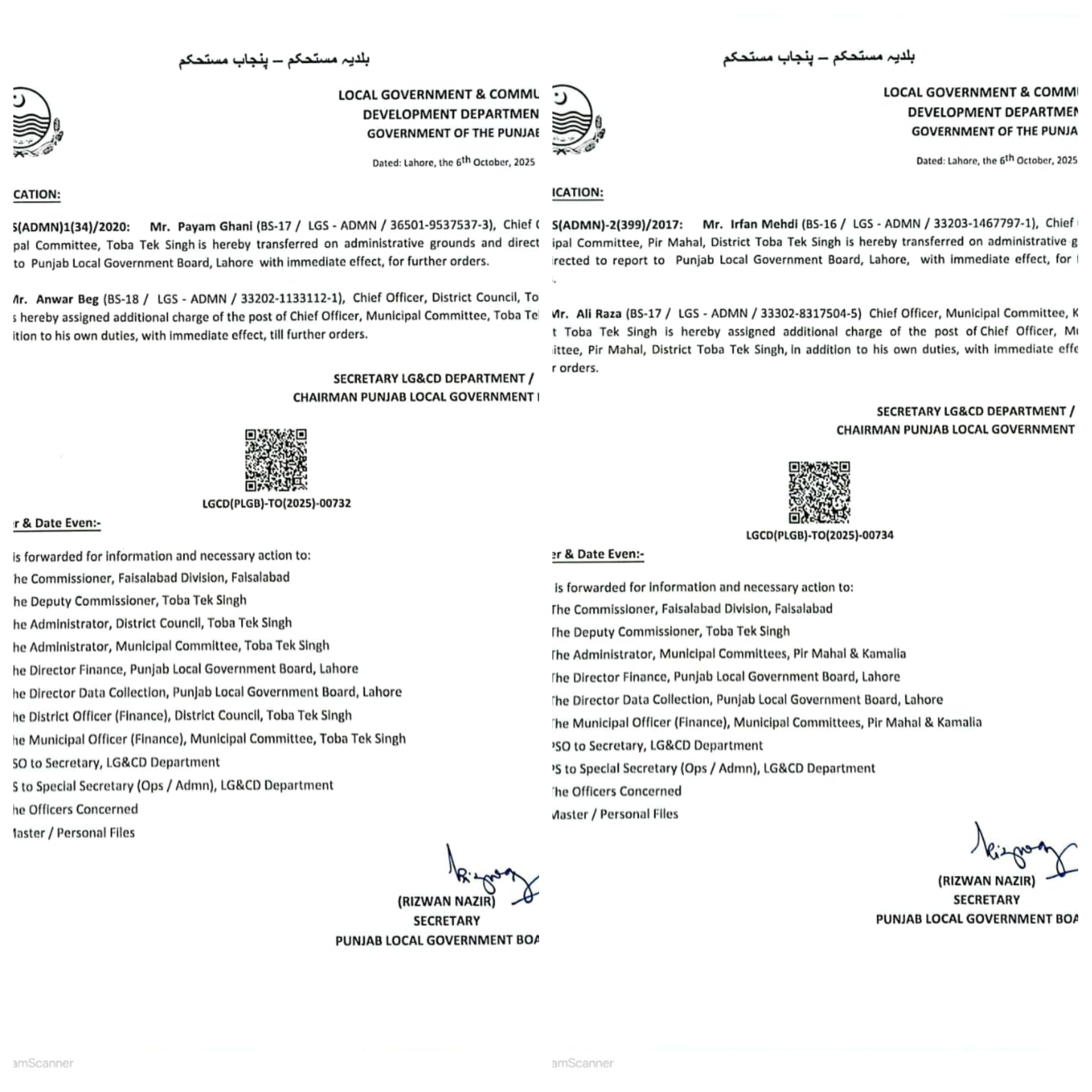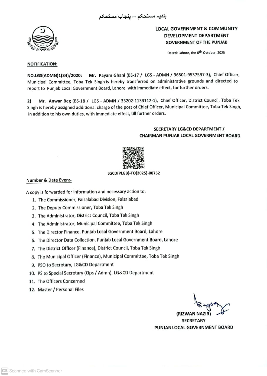 انھیں لوکل گورنمنٹ بورڈ رپورٹ کرنے کی ہدایت کی گئی ہے۔چیف آفیسر ضلع کونسل ٹوبہ ٹیک سنگھ انور بیگ کو،میونسپل کمیٹی کا اضافی چارج تفویض کیا گیا ہے۔چیف آفیسر میونسپل کمیٹی کمالیہ علی رضا کو چیف آفیسر ایم سی پیر محل کا اضافی چارج دے دیا گیا ہے۔