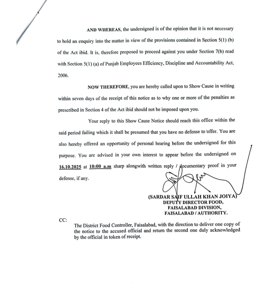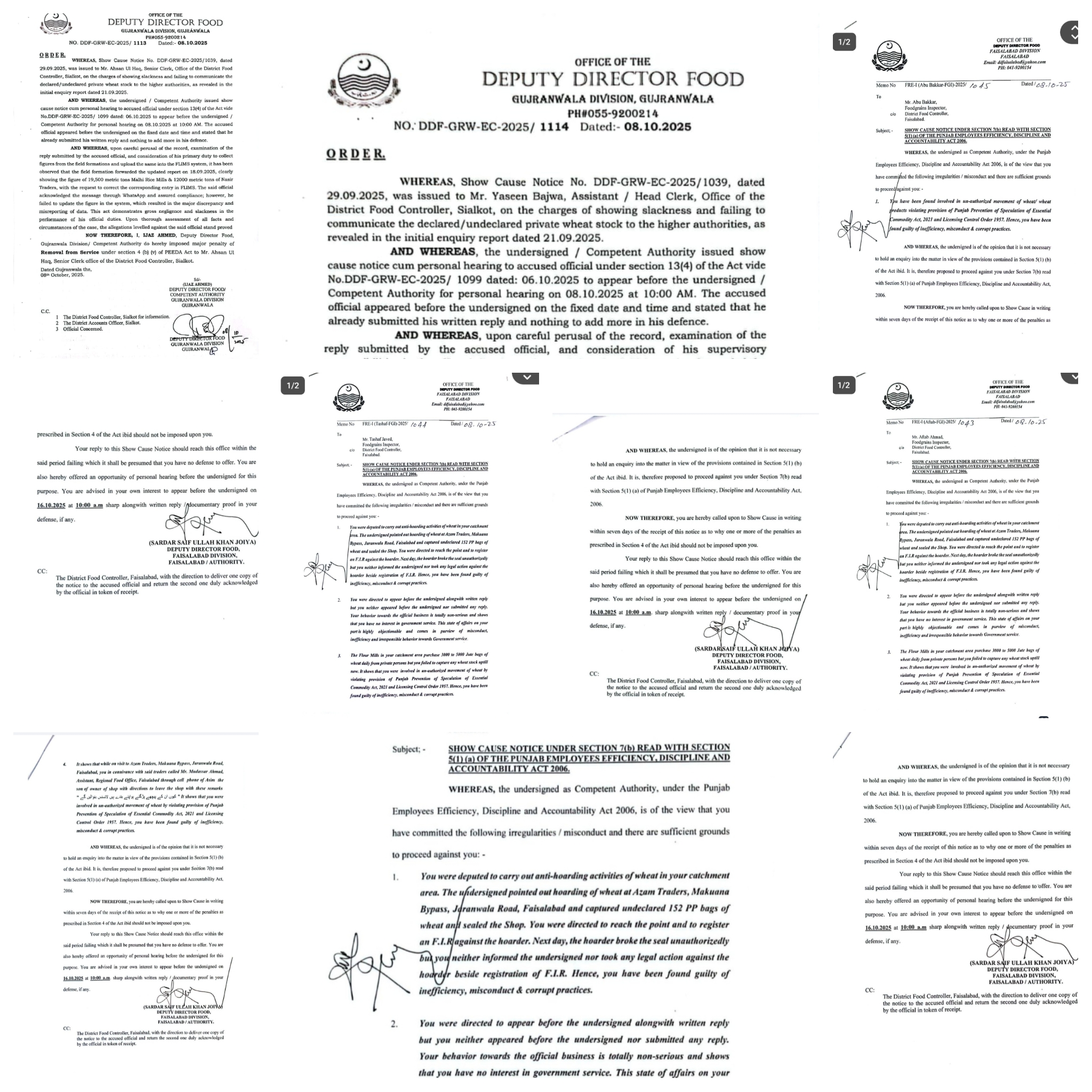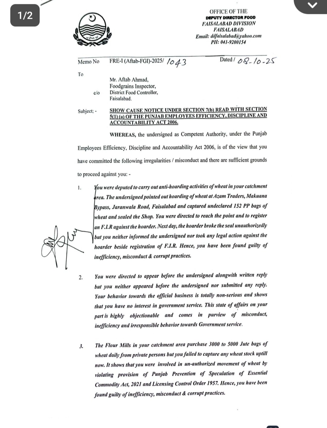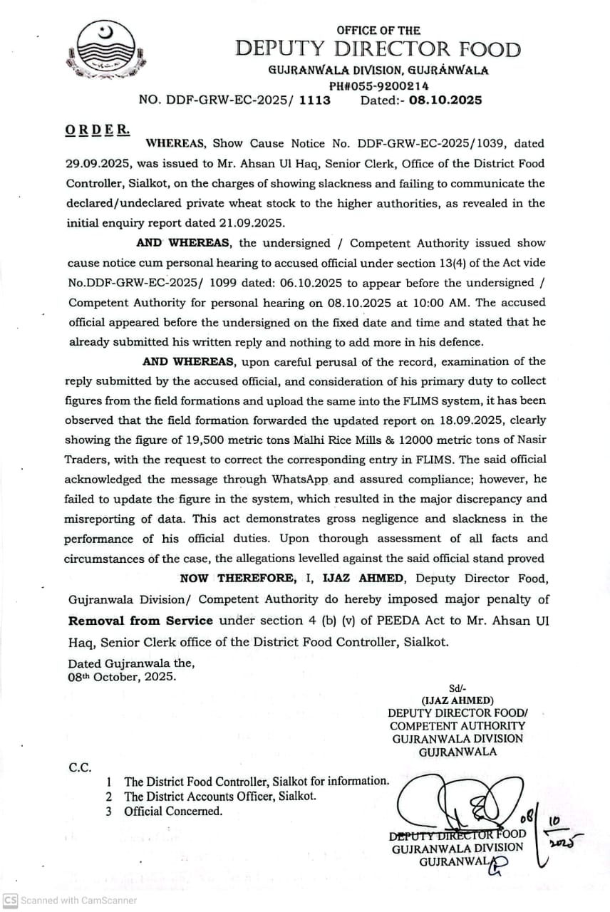 ، یاسین باجوہ ہیڈ کلرک سیالکوٹ کی تین سالوں کیلئے تنزلی کے احکامات جاری کیے گئے، علاؤہ ازیں اسسٹنٹ فوڈ کنٹرولر فیصل آباد اور 3 فوڈ گرین انسپکٹرز کو شوکاز جاری کیے جاچکے ہیں،ڈی جی فوڈ پنجاب امجد حفیظ نے کرپشن اور مافیا کی سہولت کاری میں ملوث ملازمین کی فہرستیں تیار کرنے کی ہدایت کر دی ہے۔