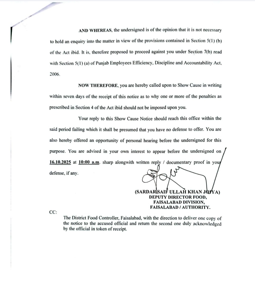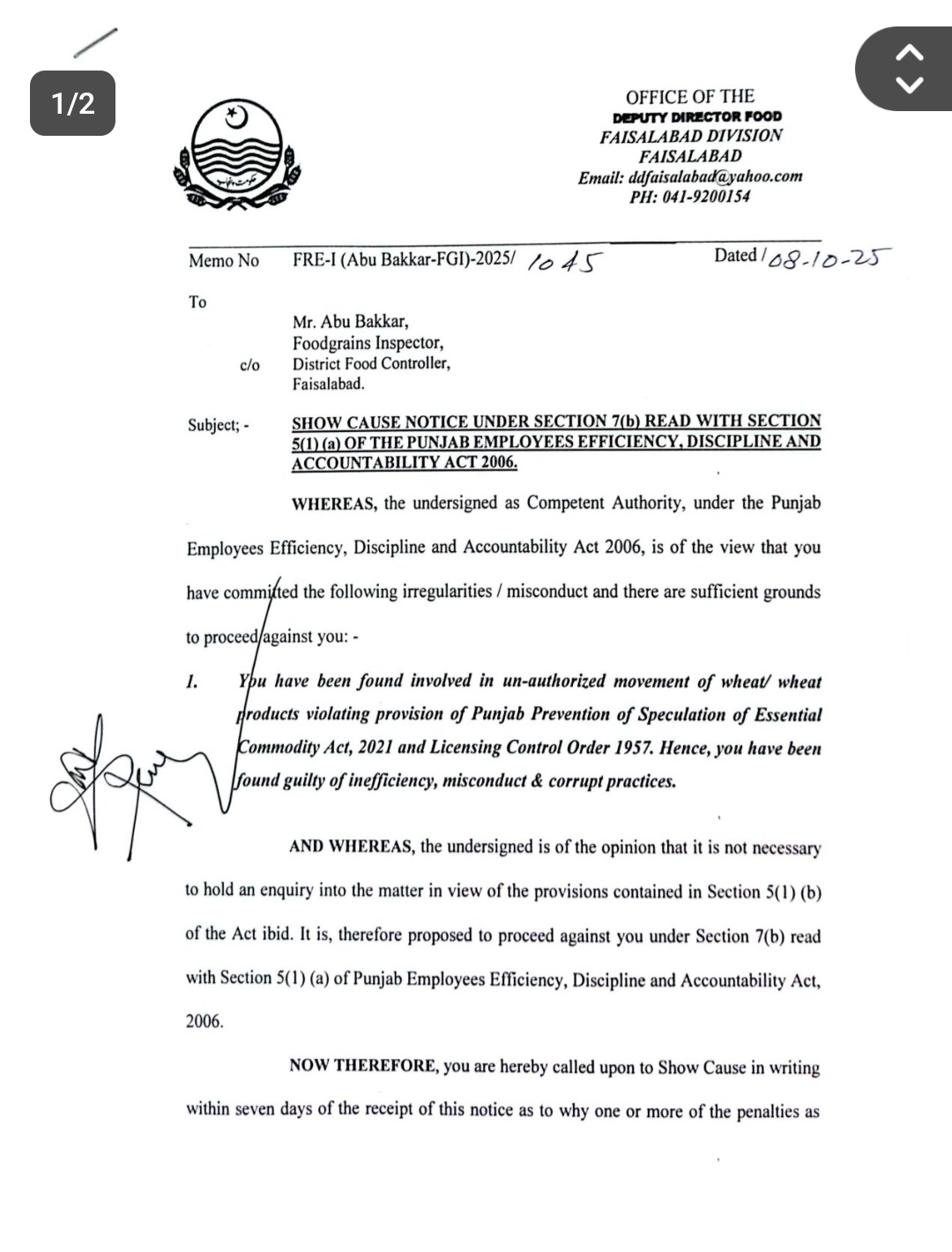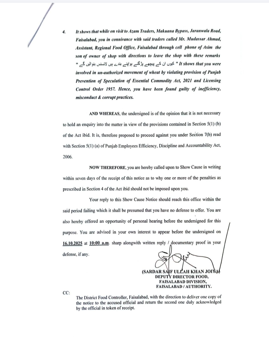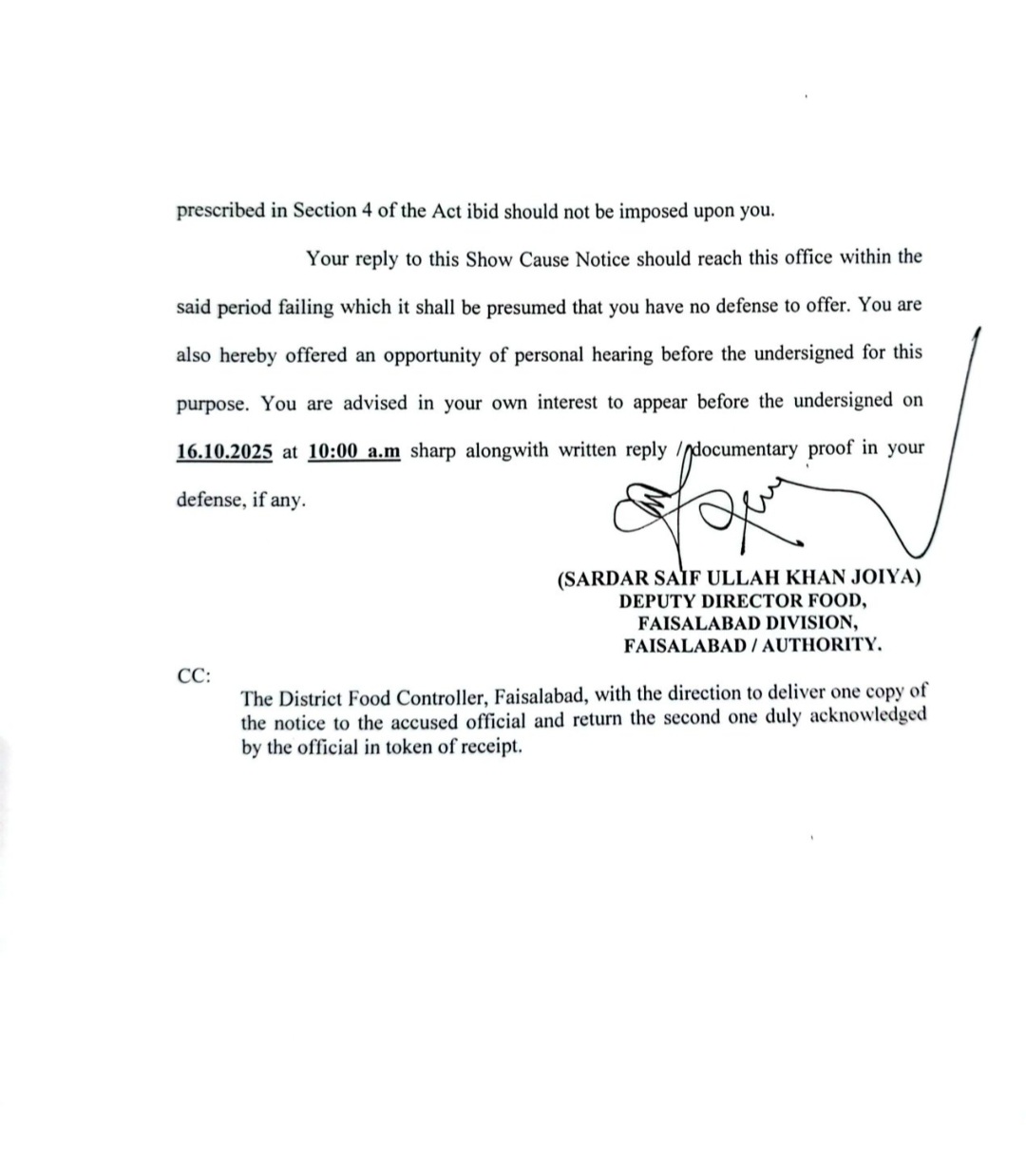 ، یاسین باجوہ ہیڈ کلرک سیالکوٹ کی تین سالوں کیلئے تنزلی کے احکامات جاری کیے گئے، علاؤہ ازیں اسسٹنٹ فوڈ کنٹرولر فیصل آباد اور 3 فوڈ گرین انسپکٹرز کو شوکاز جاری کیے جاچکے ہیں،ڈی جی فوڈ پنجاب امجد حفیظ نے کرپشن اور مافیا کی سہولت کاری میں ملوث ملازمین کی فہرستیں تیار کرنے کی ہدایت کر دی ہے۔