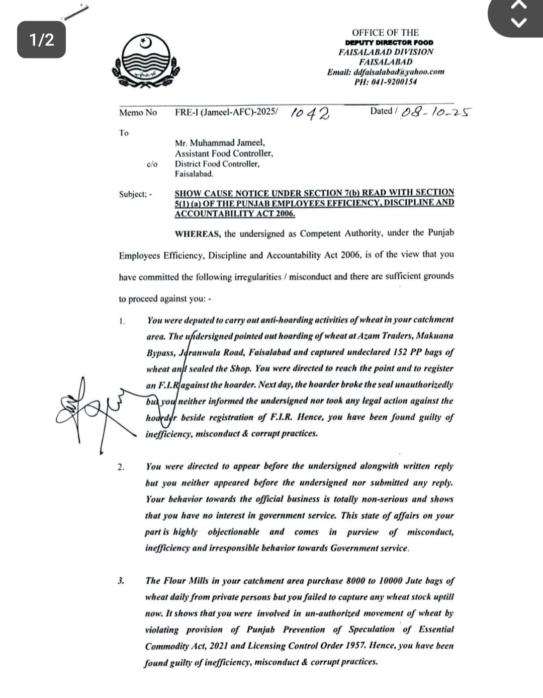 وزیر اعلیٰ پنجاب کی ہدایات پر فوڈ ڈیپارٹمنٹ پنجاب میں احتسابی عمل جاری ہے، نااہلی، کرپشن اور سرکاری دستاویزات میں خرد برد کرنے پر زیرو ٹالرینس پالیسی کے تحت 6 افسران کیخلاف کارروائیاں کرتے ہوئے 1کلرک کو نوکری سے برخاست، 1 کی تنزلی جبکہ 4 افسران کو شوکاز نوٹس جاری کیے گئے ہیں، ترجمان فوڈ ڈائریکٹوریٹ پنجاب کے مطابق سینئر کلرک احسان الحق سیالکوٹ کو پیڈا ایکٹ کے تحت کارروائی کرتے ہوئے نوکری سے برخاست کردیا