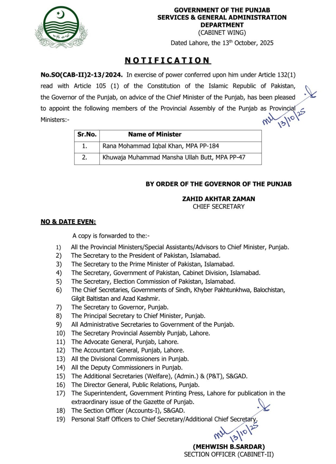 حکومت پنجاب نے دو نئے وزراء کا نوٹیفکیشن جاری کر دیا ہے۔وزیر اعلٰی مریم نواز شریف کی ہدایت پر چیف سیکرٹری پنجاب کی طرف سے نوٹیفکیشن جاری کیا گیا ہے۔نئے وزراء میں پی پی 184 سے ایم پی اے رانا محمد اقبال اور پی پی 47 سے خواجہ محمد منشاء اللہ بٹ شامل ہیں۔