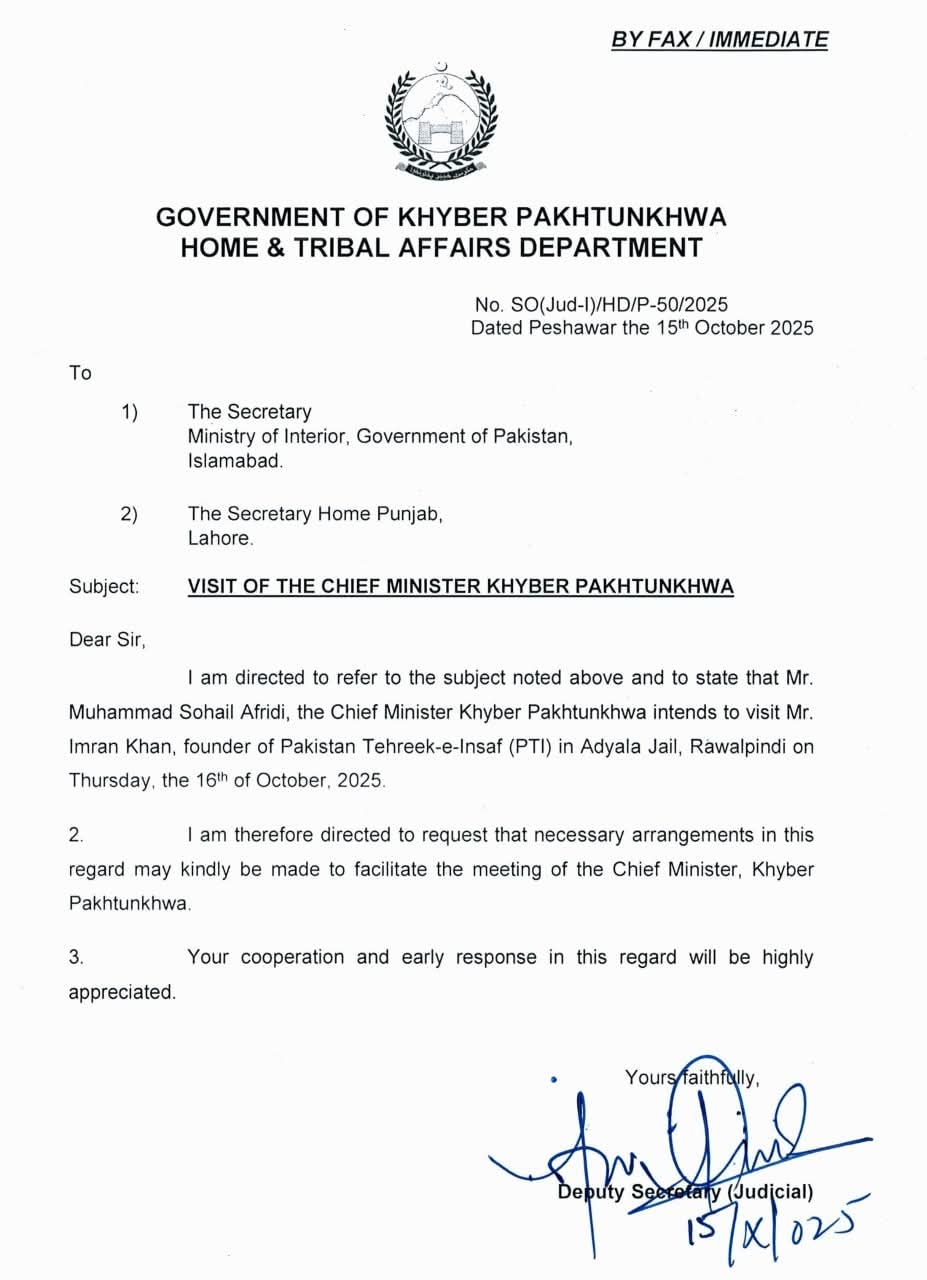 وزیر اعلیٰ محمد سہیل آفریدی نے عمران خان سے ملاقات کے لئے کل 16 اکتوبر کو اڈیالہ جانے کا فیصلہ کیا ہے ۔وزیر اعلٰی کی عمران خان سے ملاقات کے انتظامات کے لئے صوبائی حکومت نے وفاقی اور پنجاب حکومتوں کو باقاعدہ مراسلہ ارسال کردیا ہے۔ اس سلسلے میں محکمہ داخلہ خیبر پختونخوا نے وفاقی سیکرٹری داخلہ اور سیکرٹری داخلہ پنجاب کو مراسلہ ارسال کیا ہے۔ مراسلہ میں کہا گیا ہے کہ وزیر اعلیٰ خیبرپختونخوا کی عمران خان سے ملاقات کروانے کے لیے ضروری انتظامات کیے جائیں۔