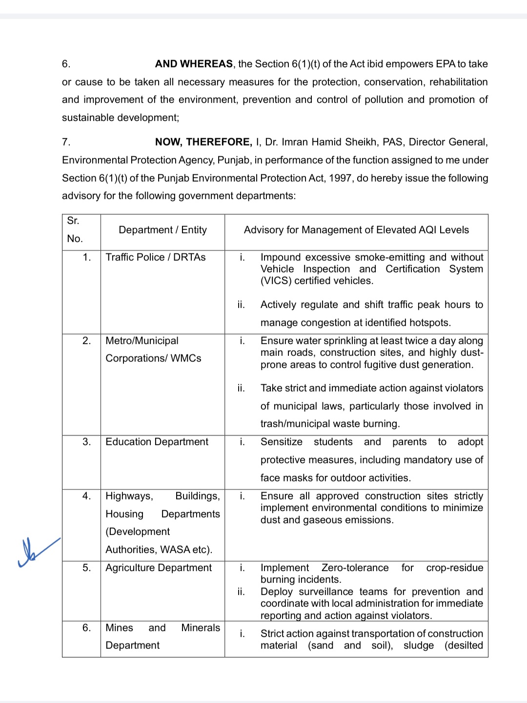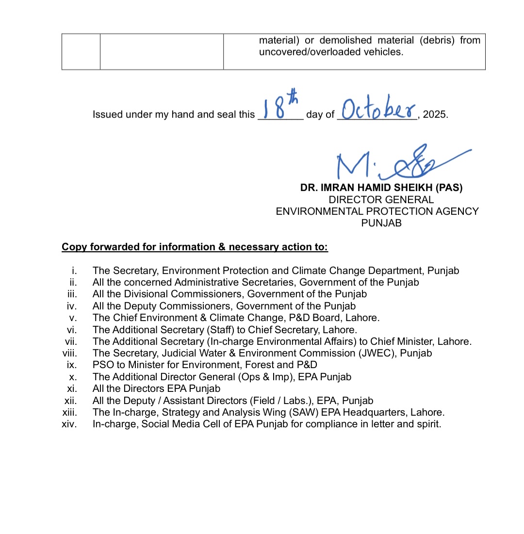 ٹریفک پولیس اوقات بدلنے کے احکامات پر فوری عمل کرے۔شہر کی سڑکوں اور تعمیراتی مقامات پر روزانہ دو بار پانی کا چھڑکاؤ لازمی ہوگا۔کوڑا جلانے والوں کو اب کوئی رعایت نہیں — فوری گرفتاری اور مقدمات درج کیے جائیں۔تمام کنسٹرکشن سائٹس پر ماحولیاتی شرائط کی خلاف ورزی برداشت نہیں کی جائے گی —ڈمپ مٹی، ریت اور ملبہ بغیر کور لے جانے والی گاڑیوں کو فوراً پکڑا جائے — بار بار وارننگ ختم، اب کارروائی ہوگی۔فصلوں کی باقیات جلانے والوں کے خلاف زیرو ٹالرنس — ایگری کلچر ٹیمیں فیلڈ میں نکلیں۔سڑکوں پر دھول اور مٹی اب سموگ کا ایندھن نہیں بننے دیں گے، میونسپل ادارے روزانہ کارروائی کریں ۔سکولوں میں بچوں اور والدین کو ماسک کے استعمال پر پابند کیا جائے — ایجوکیشن ڈیپارٹمنٹ متحرک ہو۔تمام ادارے غیر سنجیدگی چھوڑیں — فضائی آلودگی اب صرف زبانی نہیں، عملی جنگ ہوگیم