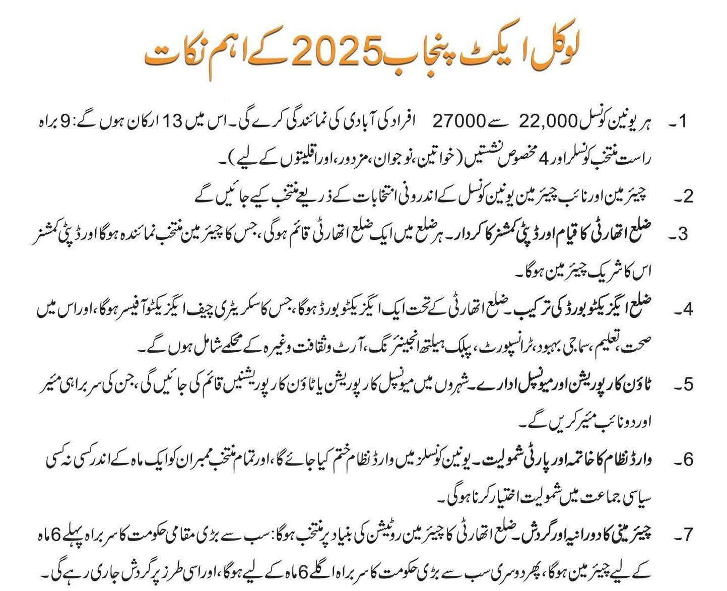منتخب ارکان کو ایک ماہ کے اندر سیاسی جماعتوں میں شمولیت اختیار کرنی ہوگی۔یونین کونسل میں وارڈ سسٹم کو ختم کیا جائے گا۔پنجاب لوکل گورنمنٹ ایکٹ 2025 کا گزٹ نوٹیفکیشن پنجاب اسمبلی کی جانب سے جاری کیا جائے گا۔جس کی کاپی حلقہ بندیوں کے لئے الیکشن کمیشن آف پاکستان کو بھجوائی جائے گی۔پنجاب لوکل گورنمنٹ ایکٹ 2025ء کے ذریعے یونین کونسل کی سطح پر اختیارات اور فنڈز منتقل کرنے کا نظام متعارف کرایا جائے گا۔گورنر ہاؤس لاہور میں ہونے والی ملاقات میں، سپیشل سیکرٹری لوکل گورنمنٹ نے گورنر کو بل کے بارے میں تفصیلی بریفنگ دی اور انہیں بلدیاتی اداروں کے پانچ سالہ دورانیے سے آگاہ کیا۔ لوکل گورنمنٹ ایکٹ 2025 کے تحت ہر یونین کونسل میں 13 ارکان ہوں گے، جو تقریباً 25 ہزار افراد کی نمائندگی کریں گے۔ ان ارکان میں 9 براہ راست منتخب کونسلرز ہوں گے جبکہ 4 مخصوص نشستیں خواتین، نوجوان، مزدور اور اقلیتوں کے لیے مخصوص ہوں گی۔یونین کونسل کے چئیرمین اور نائب چئیرمین داخلی انتخابات کے ذریعے منتخب کیے جائیں گے۔ منتخب ممبران کو ایک ماہ کے اندر کسی سیاسی جماعت میں شمولیت اختیار کرنی ہوگی، جبکہ یونین کونسل میں وارڈ نظام کو ختم کر دیا جائے گا۔