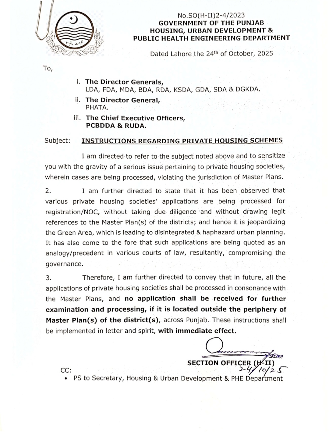تمام ڈویلپمنٹ اتھارٹیز کے ڈائریکٹر جنرلز، ڈی جی پھاٹا اور سی ای او روڈا کو حکمنامہ جاری کر دیا گیا ہے۔جس کے مطابق سوسائٹیز کی منظوری سے قبل مطلوبہ احتیاطی جانچ پڑتال کرنا اداروں کی ذمہ داری ہے،سیکرٹری ہاؤسنگ نورالامین مینگل نے کہا ہے کہ ماسٹر پلان کی خلاف ورزی کے باعث گرین ایریاز تباہ ہوتے ہیں۔تمام ادارے اپنےماسٹر پلانز کا اطلاق یقینی بنانے کے پابند ہیں۔ماسٹر پلان کی خلاف ورزی بے ہنگم اربن ڈویلپمنٹ کا باعث بنتی ہے۔پرائویٹ ہاؤسنگ سوسائٹیز کو ریگولیٹ کرنے بارے جامع پلاننگ بھی جاری ہے۔ترجمان محکمہ ہاؤسنگ کے مطابق قوانین کے اطلاق سے گرین ایریاز کو بچانے میں مدد ملے گی۔گرین ایریاز کی تباہی سے سموگ اور ماحولیاتی آلودگی میں اضافہ ہوتا ہے ۔وزیر اعلیٰ پنجاب مریم نواز شریف کے ویژن کے مطابق شہریوں کے جان و مال کا تحفظ اولین ترجیح ہے۔