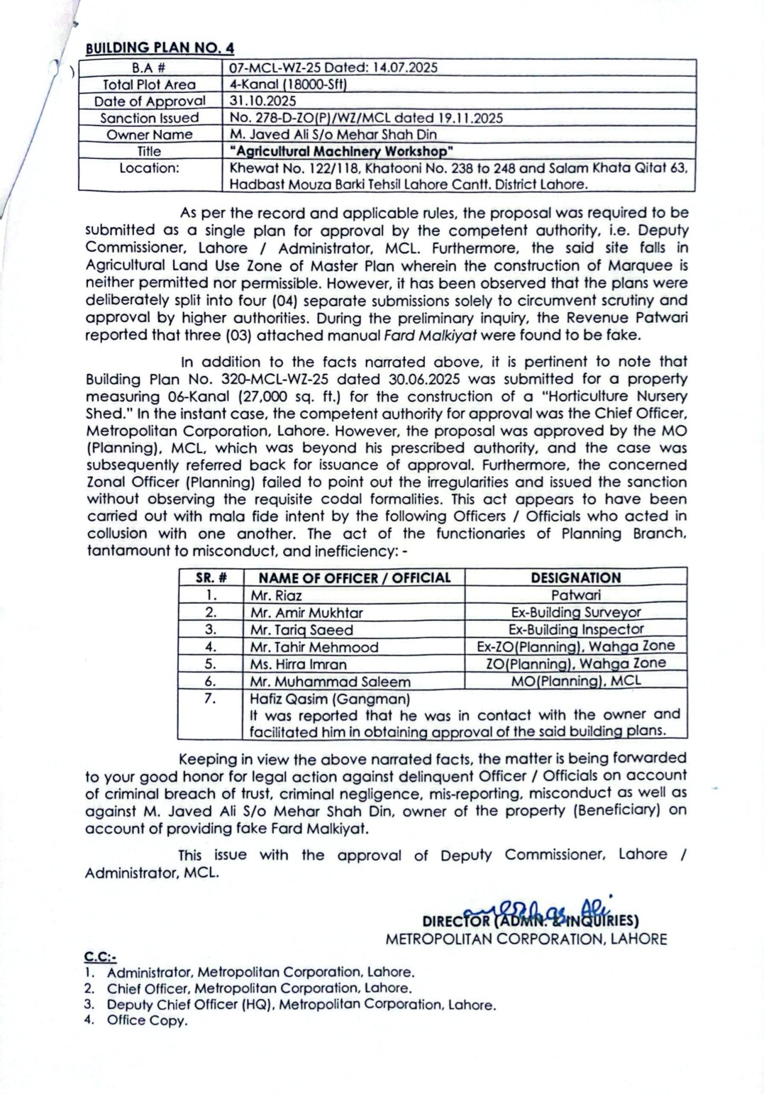 ۔جن ملزمان کو گرفتار کر کے تفتیش کی جا رہی ہے ان میں طارق سعید بلڈنگ انسپکٹر، ریاض پٹواری،امیر مختار بلڈنگ سروئیر، حافظ قاسم گینگ مین شامل ہیں۔طاہر محمود گجر زونل آفیسر پلاننگ عمرہ پر ہیں جن کو واپسی پر شامل تفتیش کیا جائے گا۔بلڈنگ انسپکٹر طارق سعید اس وقت نشتر زون میں تعینات ہیں۔جو مرکزی کردار بتائے گئے ہیں۔
