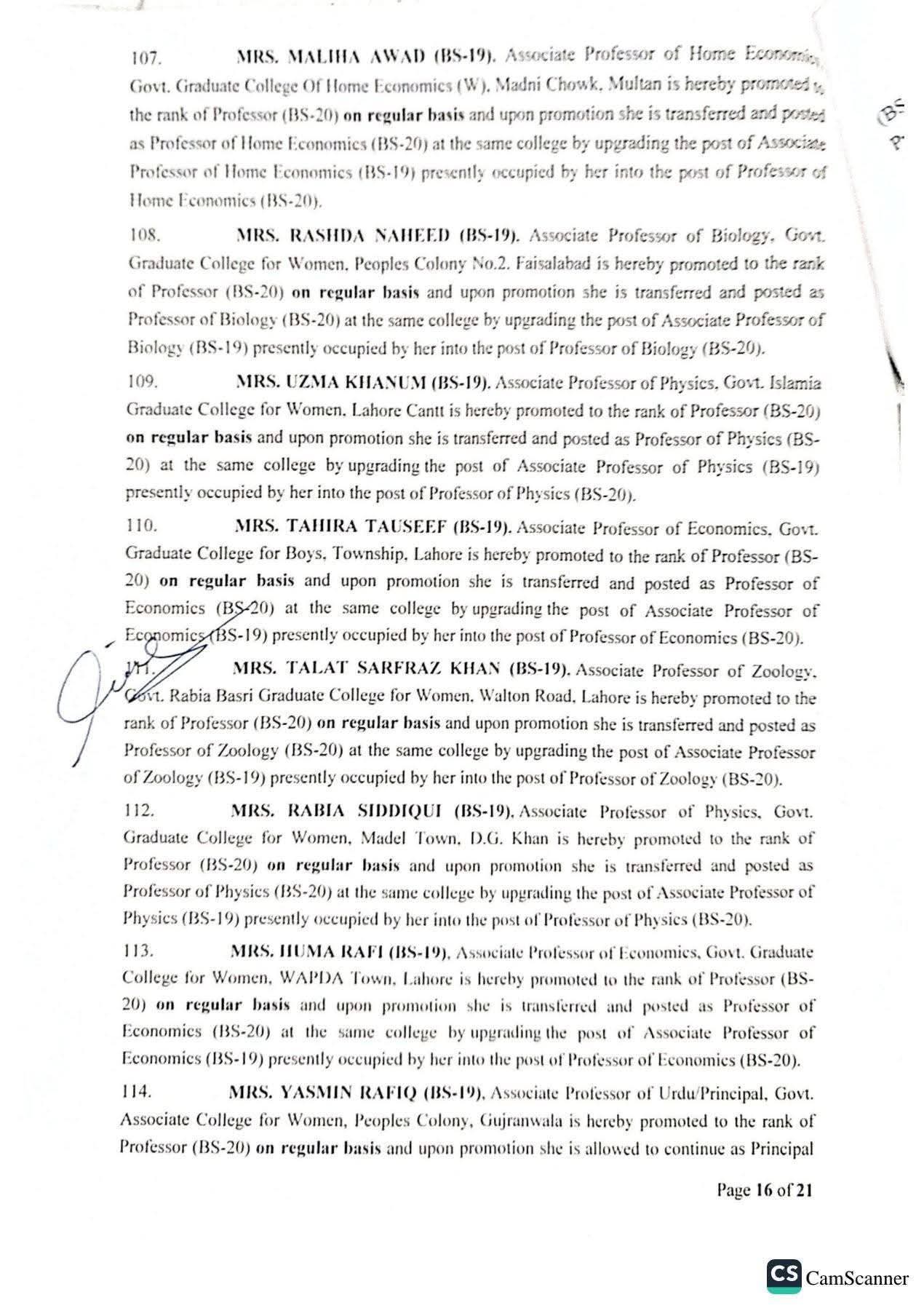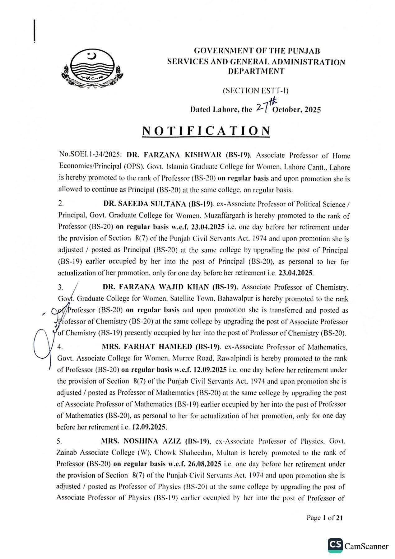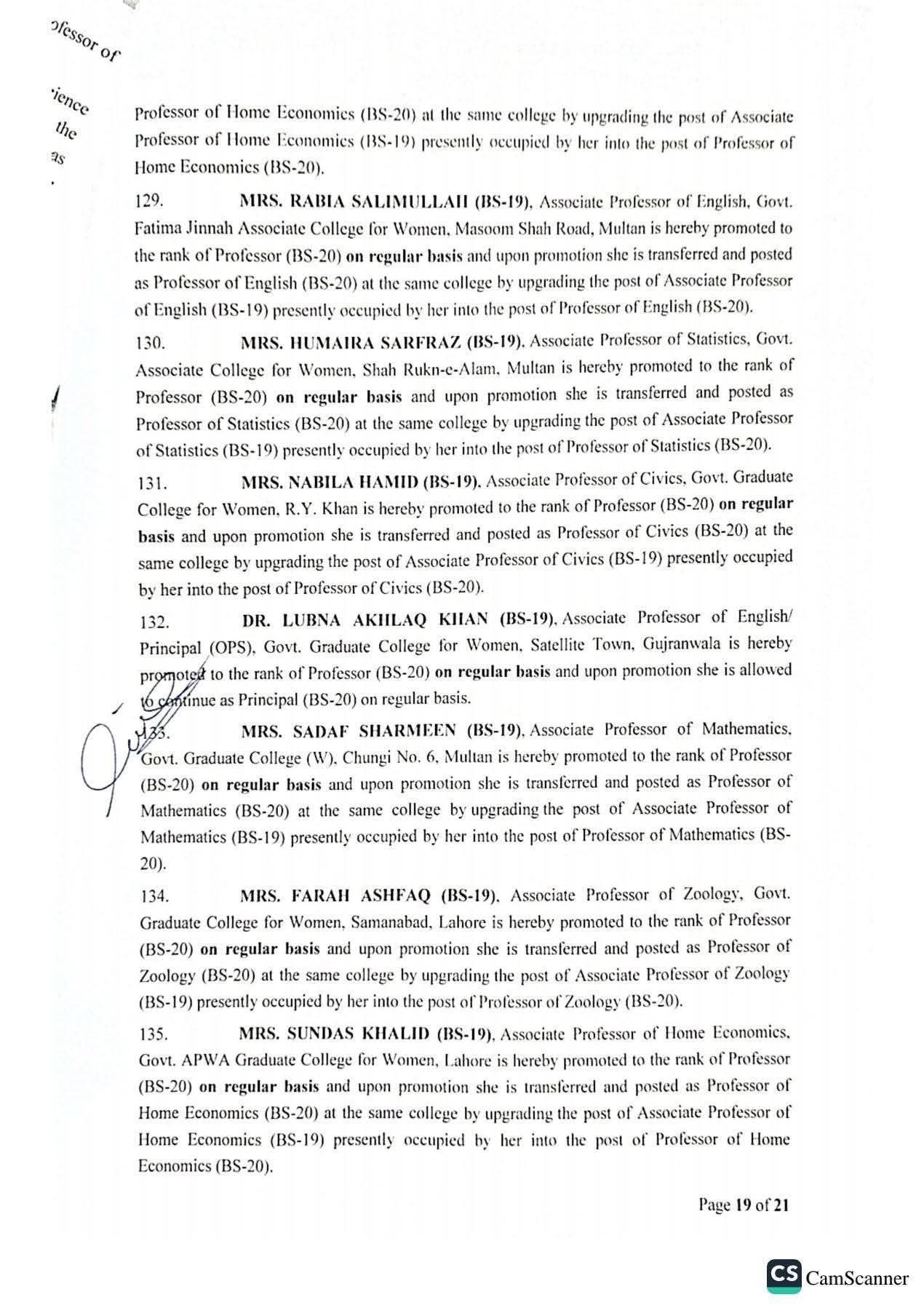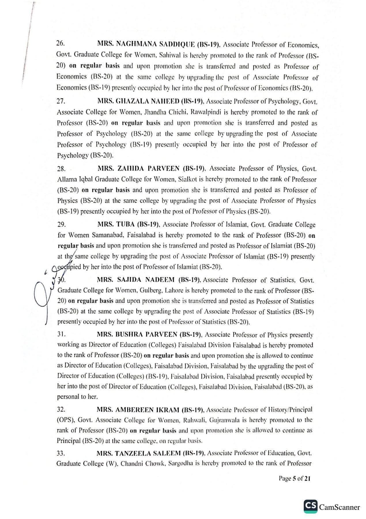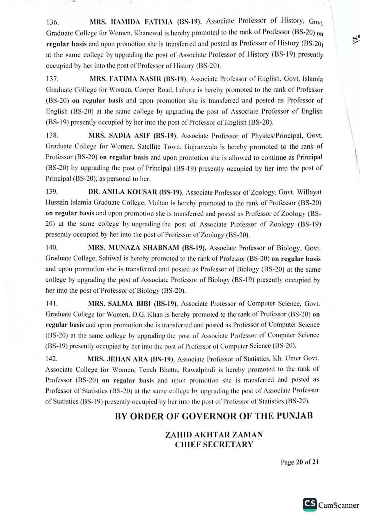 حکومت پنجاب نے 142 پروفیسرز کی گریڈ 20 میں ترقیوں اور تقرریوں کے احکامات جاری کر دیئے ہیں۔محکمہ سروسز پنجاب نے