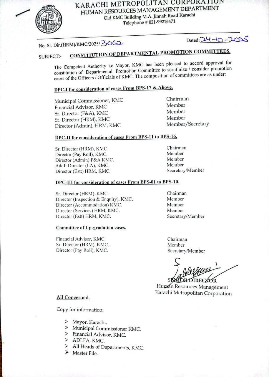 بلدیہ عظمیٰ کے ملازمین کے لیے بڑی خوشخبری!میئر کراچی بیرسٹر مرتضیٰ وہاب کی ہدایت پر پروموشن اور اپ گریڈیشن کیسز کو جلد از جلد نمٹانے کا فیصلہ کر لیا۔میونسپل کمشنر، سینئر ڈائریکٹر ہیومن ریسورس اور مشیرِ مالیات کی سربراہی میں کمیٹی قائم کر دی گئی۔جس کا باقاعدہ نوٹیفکیشن جاری کر دیا گیا ہے