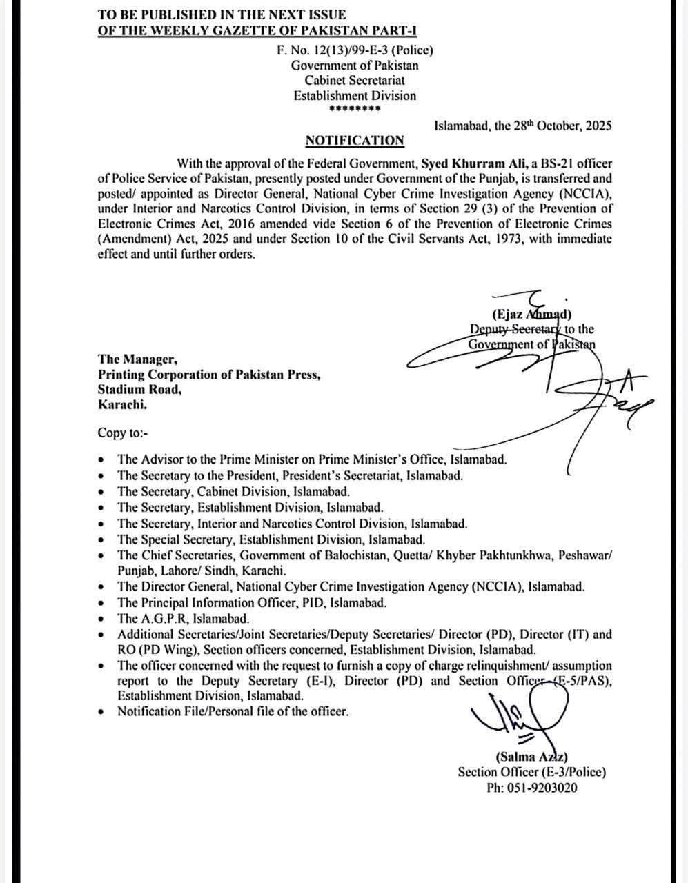اور ان کی جگہ سید خرم علی کو ڈائریکٹر جنرل، نیشنل سائبر کرائم انویسٹی گیشن ایجنسی تعینات کر دیاہے۔