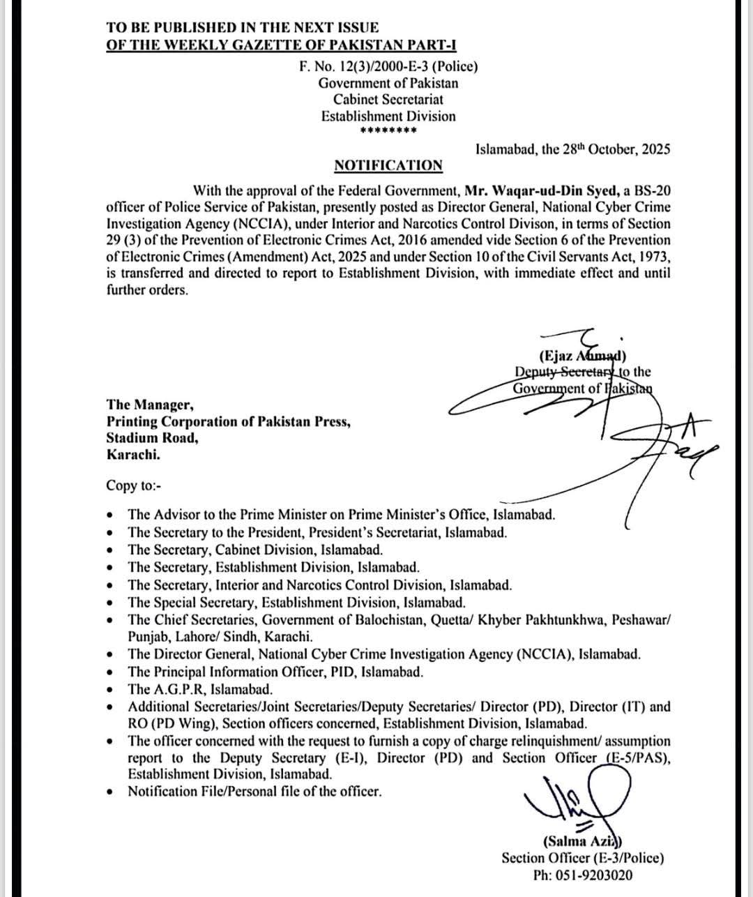 اسٹیبلشمنٹ ڈویژن نے نیشنل سائبر کرائم انویسٹی گیشن ایجنسی کے ڈائریکٹر جنرل وقار الدین سید کو عہدے سے ہٹا دیا ہے