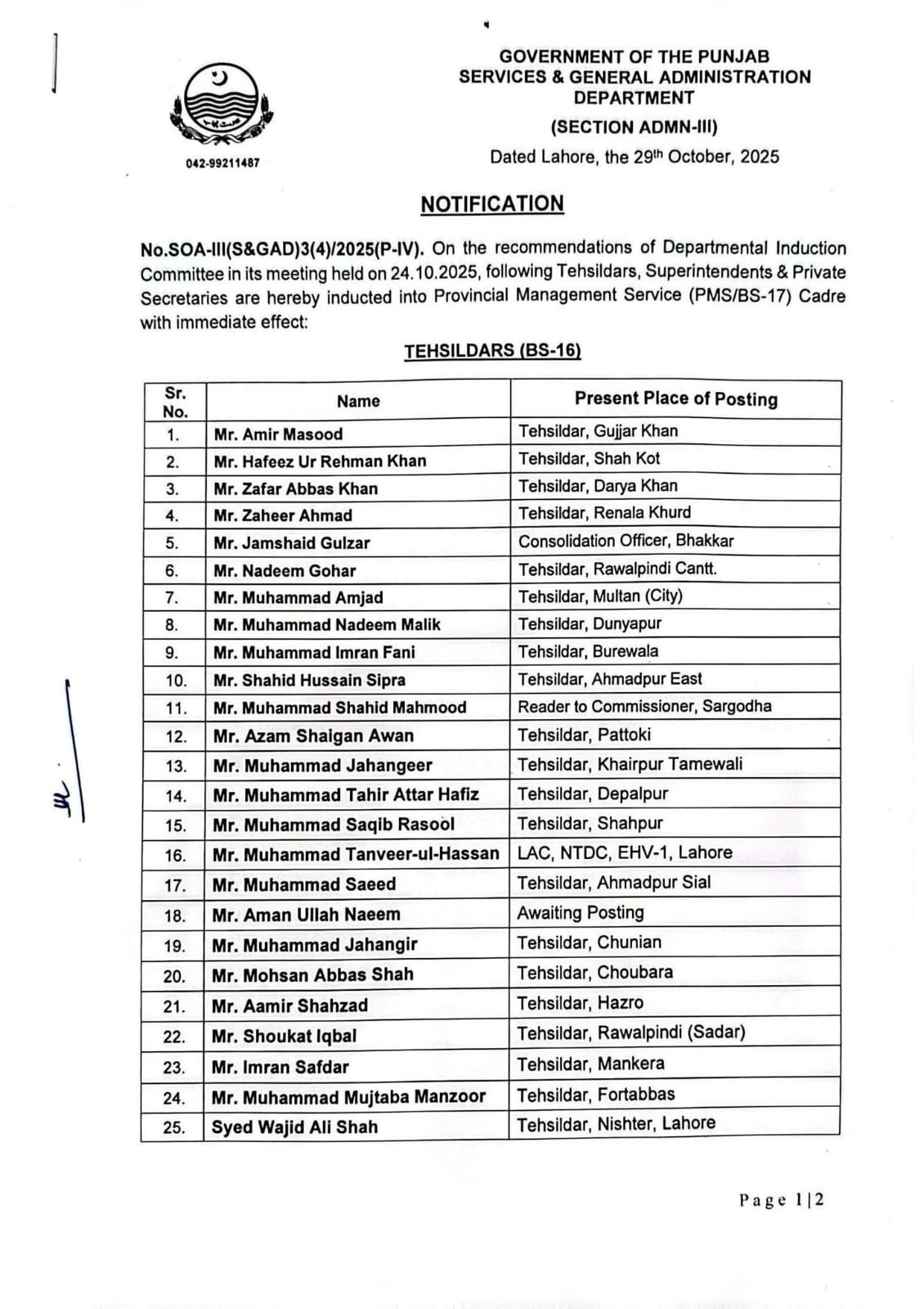 نمبر SOA-III(S&GAD)3(4)/2025(P-IV)۔ 24.10.2025 کو ہونے والے اجلاس میں ڈیپارٹمنٹل انڈکشن کمیٹی کی سفارشات پر،ان تحصیلداروں، سپرنٹنڈنٹس اور پرائیویٹ سیکرٹریوں کو فوری اثر سے صوبائی مینجمنٹ سروس (PMS/BS-17) کیڈر میں شامل کیا گیا ہے