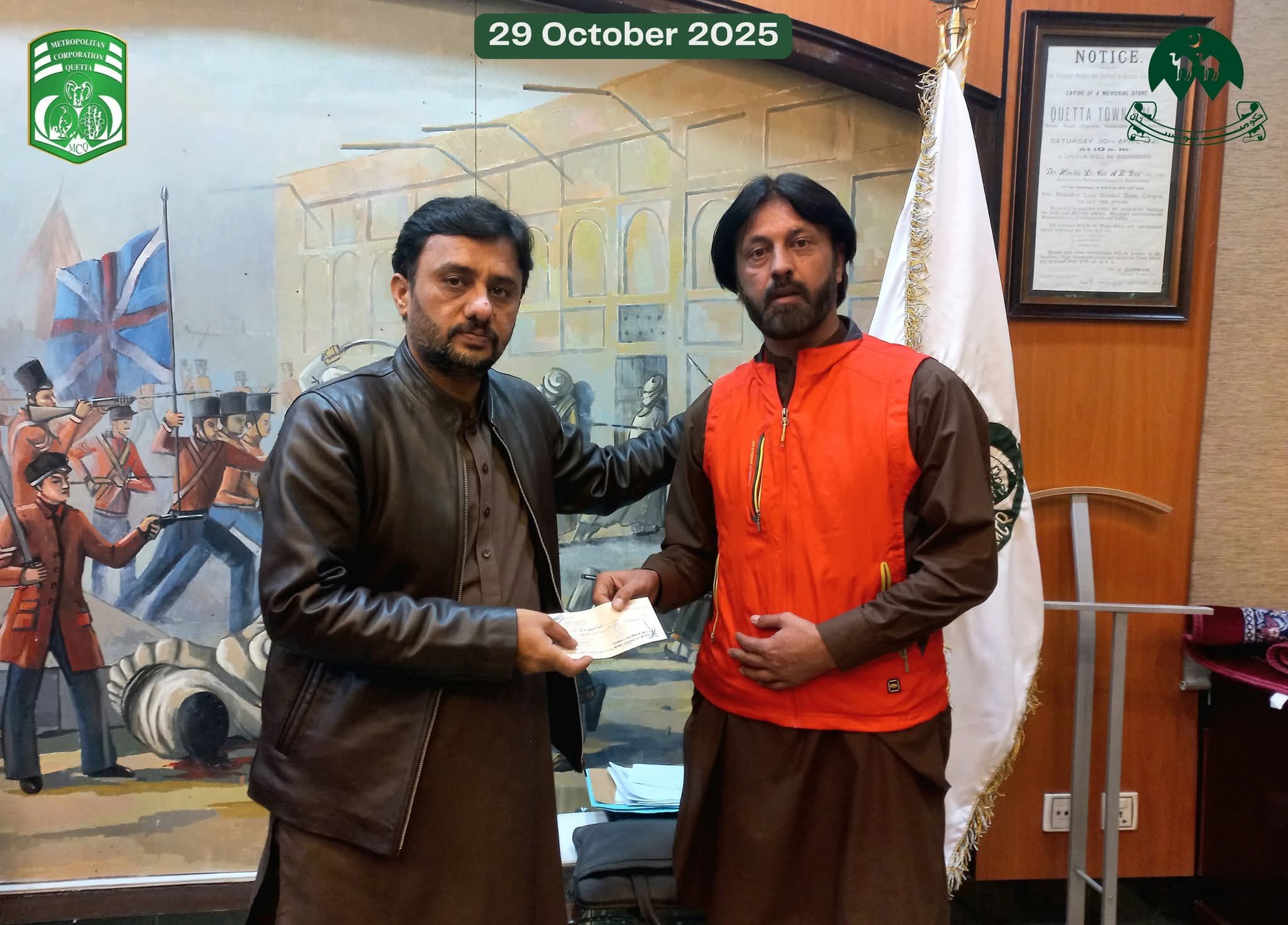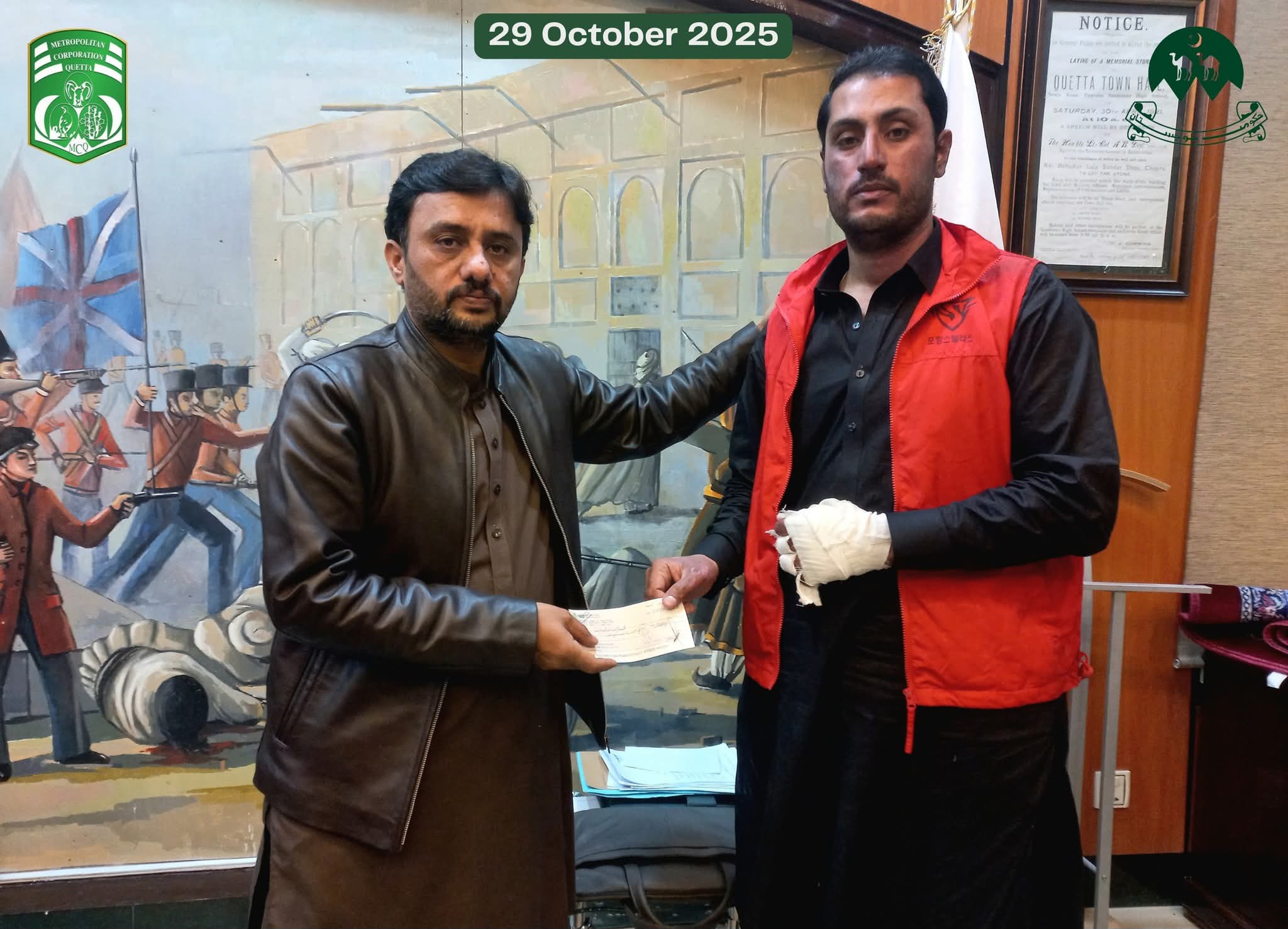 ایڈمنسٹریٹر میٹروپولیٹن کارپوریشن کوئٹہ مجیب الرحمٰن قمبرانی نے نواں کلی کے علاقے میں واقع ایک منی پٹرول پمپ میں لگی آگ پر قابو پانے کی کوشش کے دوران زخمی ہونے والے بہادر فائر فائٹرز میں امدادی چیکس تقسیم کیے۔ اس موقع پر ڈپٹی ڈائریکٹر فائر سروسز عبدالحق اچکزئی بھی موجود تھے۔ایڈمنسٹریٹر کوئٹہ نے تقریب سے خطاب کرتے ہوئے کہا کہ فائر فائٹرز نے انتہائی جرات، پیشہ ورانہ مہارت اور فرض شناسی کا مظاہرہ کرتے ہوئے اپنی جانوں کو خطرے میں ڈال کر آگ پر قابو پایا اور شہریوں کو بڑے نقصان سے بچایا۔ انہوں نے کہا کہ ایسے اہلکار ہمارے حقیقی ہیروز ہیں جو خدمتِ خلق کے جذبے کے ساتھ اپنی ذمہ داریاں انجام دیتے ہیں۔ایڈمنسٹریٹر کوئٹہ نے مزید کہا کہ