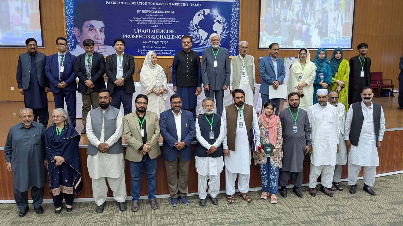 روایتی اور قدرتی صحت کی دیکھ بھال کے موضوع پر "یونانی میڈیسن: امکانات اور چیلنجز” کے عنوان سے دو روزہ سمپوزیم پاکستان ایسوسی ایشن فار ایسٹرن میڈیسن کے زیرِ اہتمام اور ڈیپارٹمنٹ آف ایسٹرن میڈیسن، فیکلٹی آف میڈیکل سائنسز، گورنمنٹ کالج یونیورسٹی فیصل آباد کے اشتراک سے قائداعظم آڈیٹوریم، نیو کیمپس میں منعقد ہوا۔تقریب میں چیف پیٹرن سعدیہ راشد اور پریزیڈنٹ ایسوسی ایشن پروفیسر ڈاکٹر حکیم عبدالحنان کے علاوہ ملک بھر سے آئے ممتاز ماہرینِ طب، محققین، اساتذہ، اور طلبہ نے بڑی تعداد میں شرکت کی۔معزز مہمانانِ گرامی میں پارلیمانی سیکرٹری برائے پلاننگ اینڈ ڈیویلپمنٹ ملک شہباز علی کھوکھر، ڈاکٹر سعید الہی، وائس چانسلر ایگریکلچر یونیورسٹی فیصل آباد ڈاکٹر ذوالفقار علی، وائس چانسلر جی سی یونیورسٹی فیصل آباد ڈاکٹر رئوف اعظم،جناب ڈاکٹر حکیم زاہد اشرف ، ڈاکٹر احمد کمال، اور ڈاکٹر حمیدہ علی سمیت دیگر نمایاں شخصیات شامل تھیں۔مقررین نے اپنے خطابات میں کہا کہ