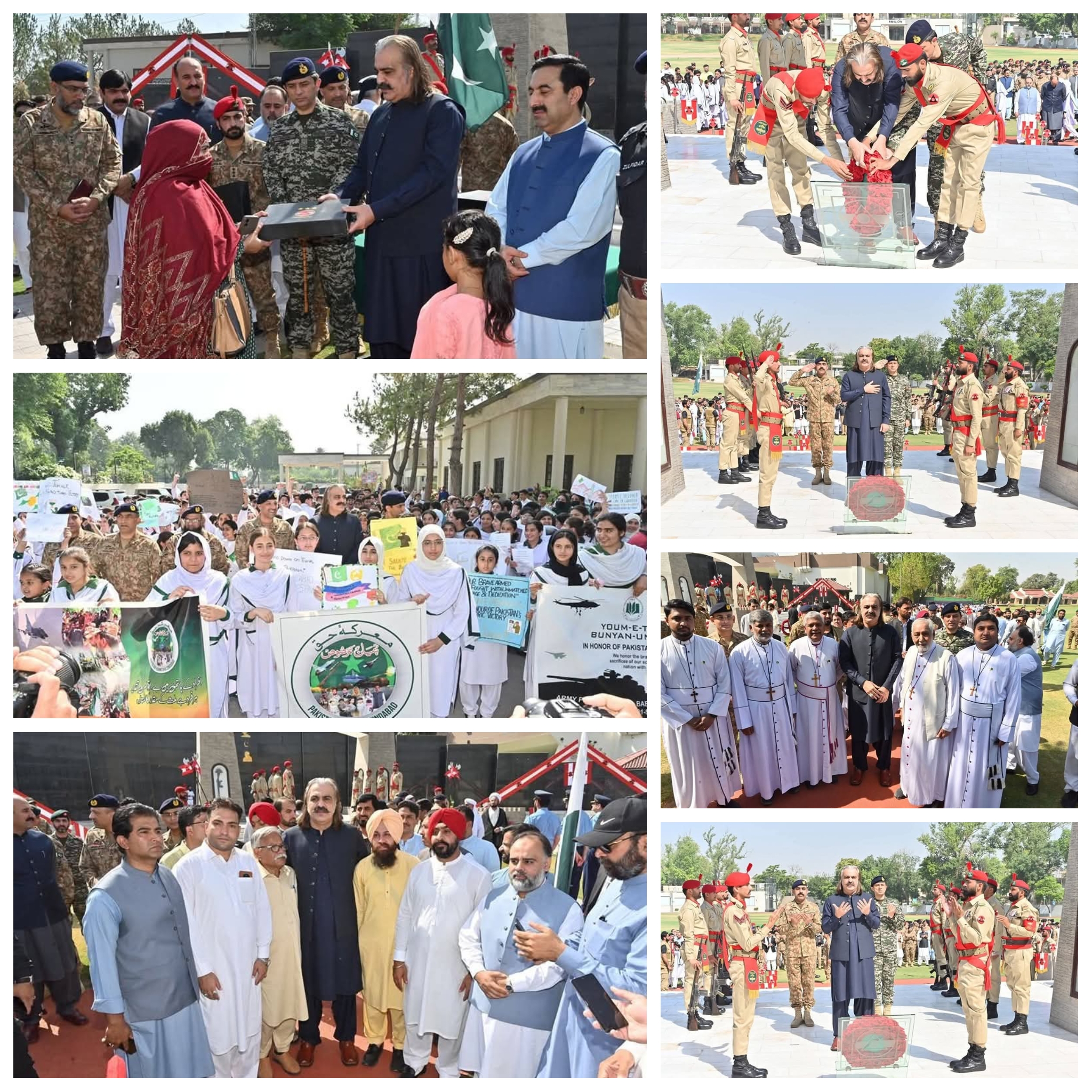 معرکہ حق – آپرپشن بنیان مرصوص میں افواج پاکستان کی شاندار کامیابی پر پشاور میں یادگار شہداء پر پروقار تقریب کا انعقاد کیا گیا۔ تقریب میں وزیر اعلیٰ خیبرپختونخوا علی امین گنڈاپور سمیت بڑی تعداد میں پاک آرمی، نیوی، فضائیہ و سول حکام ، حکومتی اراکین، علماء کرام، سیاسی رہنما، ہندو, عیسائی اور سکھ اقلیتی برادری، تاجر اور اے پی ایس کے بچوں نے بھرپور شرکت کی۔