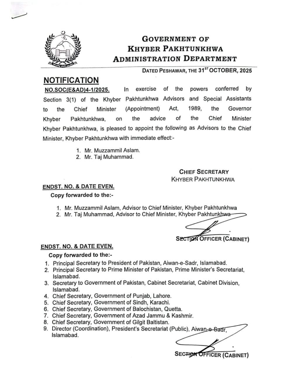 وزیراعلی خیبر پختونخوا محمد سہیل آفریدی کی ہدایت پر محکمہ ایڈمنسٹریشن نے صوبائی کابینہ میں شامل مزمل اسلم اور تاج محمد ترند کو مشیر وزیراعلی خیبر پختونخوا مقرر کرنے کا نوٹیفکیشن جاری کردیا۔