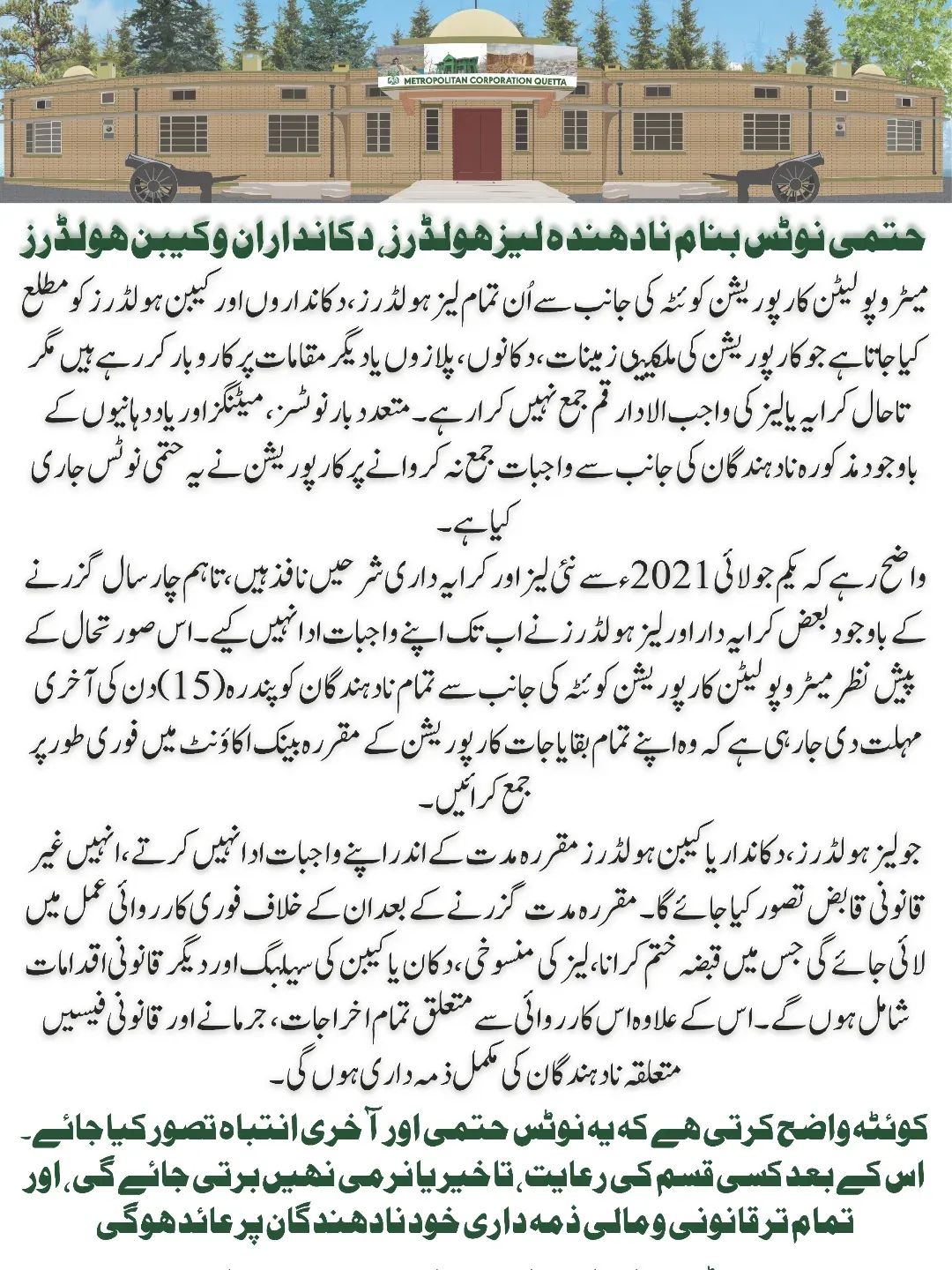 *یہ نوٹس کارپوریشن کی ملکیتی زمینات، دکانوں، پلازوں، کیبن ہولڈرز کے لئے آخری انتباہ ہے*