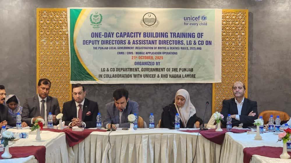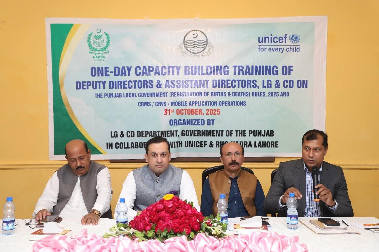 نادرا ریجنل ہیڈ آفس لاہور کی جانب سے لوکل گورنمنٹ اینڈ کمیونٹی ڈویلپمنٹ (ایل جی اینڈ سی ڈی) ڈیپارٹمنٹ اور یونیسف کے اشتراک سے پیدائش، وفات اور ازدواجی حیثیت میں تبدیلی کے اندراج کے نظام سی آر ایم ایس/سی آر وی ایس پر ایک تربیتی سیشن کا انعقاد کیا گیا۔