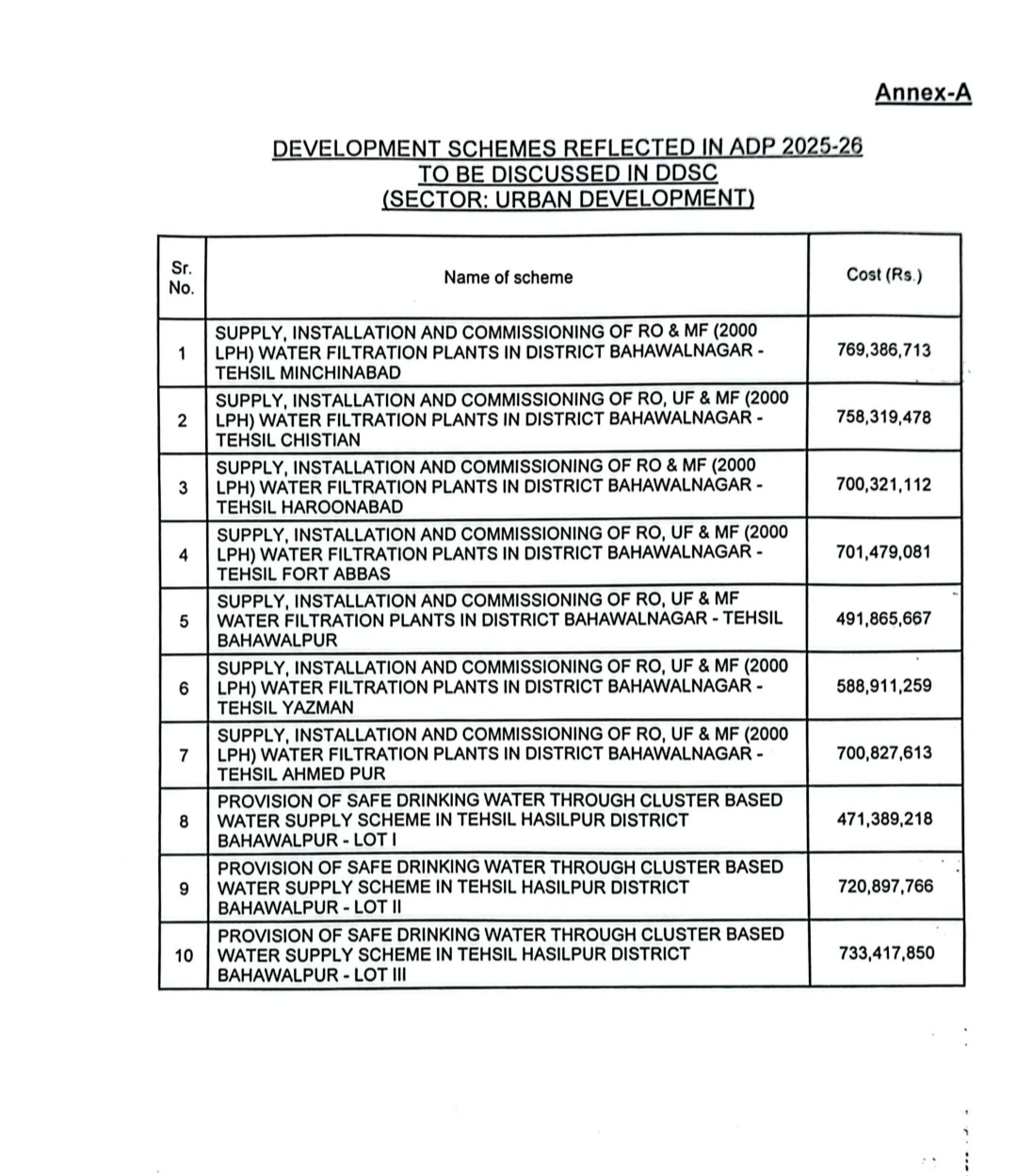 اجلاس میں ڈیپارٹمنٹل ڈویلپمنٹ سب کمیٹی کے تحت شہریوں کو صاف پانی کی فراہمی سے متعلق 10 منصوبے منظوری کے لیے پیش کیے جائیں گے۔ ان منصوبوں کے تحت صوبے کے مختلف اضلاع میں واٹر سپلائی اور فلٹریشن سسٹم کو جدید خطوط پر استوار کیا جائے گا۔ترجمان محکمہ ہاؤسنگ کے مطابق، بہاولنگر کی 7 تحصیلوں میں واٹر فلٹریشن پلانٹس نصب کیے جائیں گے جن میں منچن آباد، چشتیاں، ہارون آباد، فورٹ عباس، یزمان اور بہاولنگر شامل ہیں۔ اسی طرح بہاولپور کی تحصیل حاصل پور میں تین اسکیموں کے تحت کلسٹر بیسڈ واٹر سپلائی نظام متعارف کرایا جائے گا۔ترجمان کے مطابق شہریوں تک صاف پانی کی فراہمی کے منصوبے ترجیحی بنیادوں پر متعارف کروائے جا رہے ہیں۔ زہر آلود اور کھارے پانی سے شہریوں کو بچانا محکمہ ہاؤسنگ کی اولین ترجیح ہے۔ وزیر اعلیٰ پنجاب مریم نواز شریف کے ویژن کے تحت دوردراز علاقوں میں بھی بنیادی سہولیات پہنچانے کے لیے محکمہ ہاؤسنگ عملی اقدامات کر رہا ہے تاکہ عوام کو معیاری زندگی کی سہولتیں فراہم کی جا سکیں۔